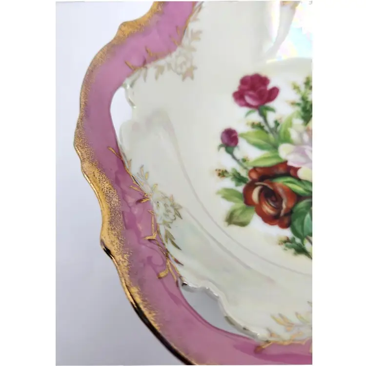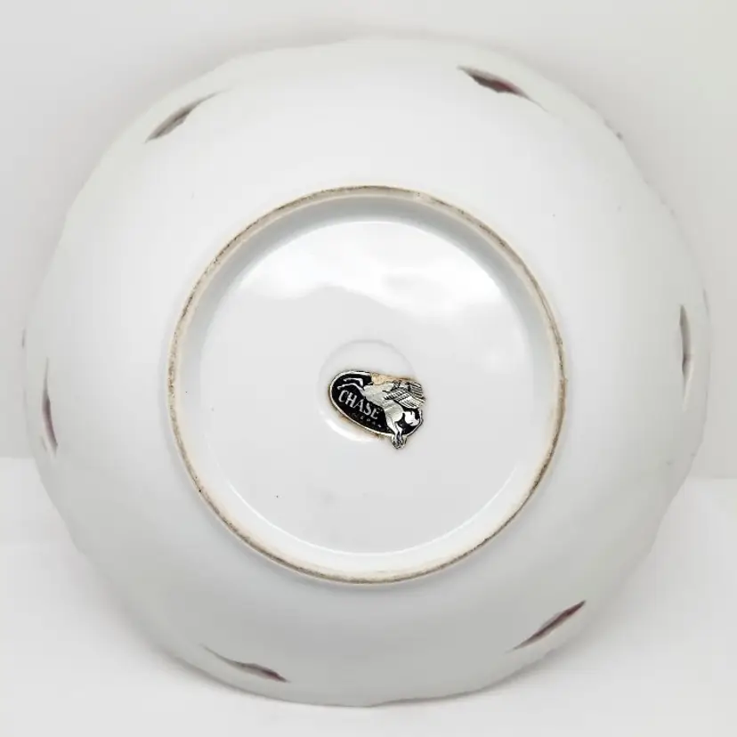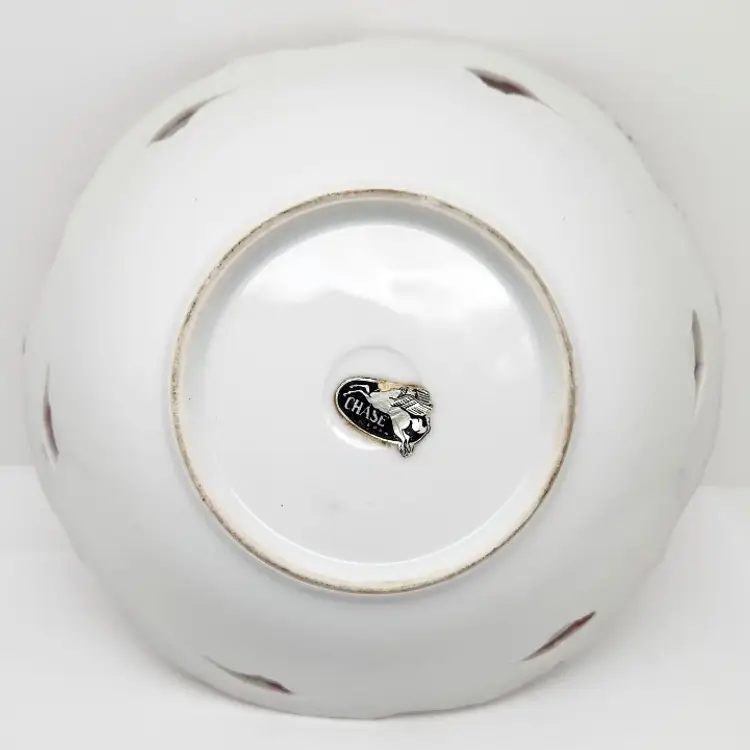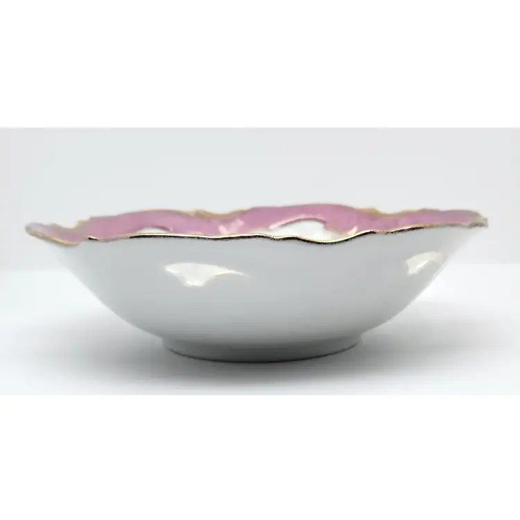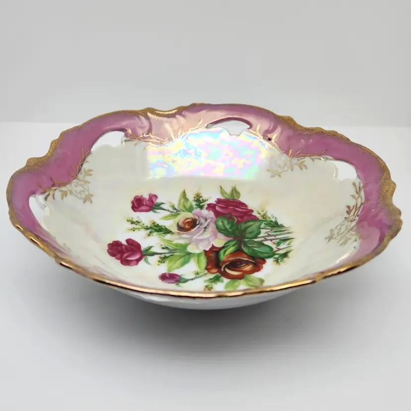 This beautiful bowl is about 8" in diameter x about 2" high. There are 6 cutouts around the top of the bowl. It appears to have hand painted details.