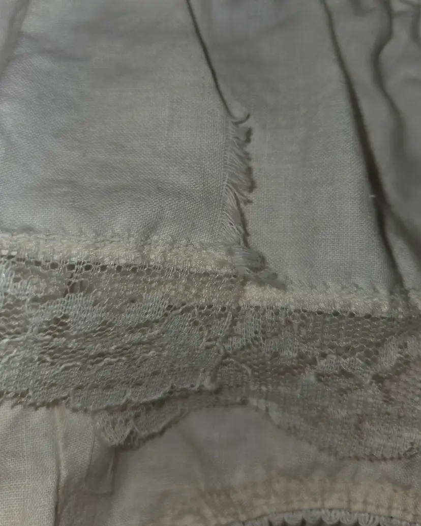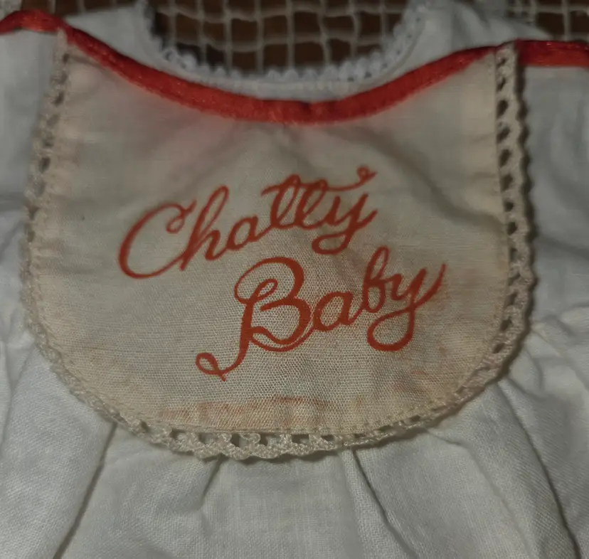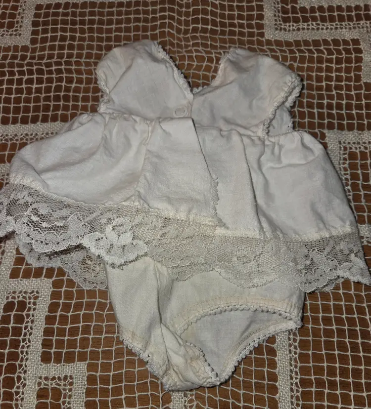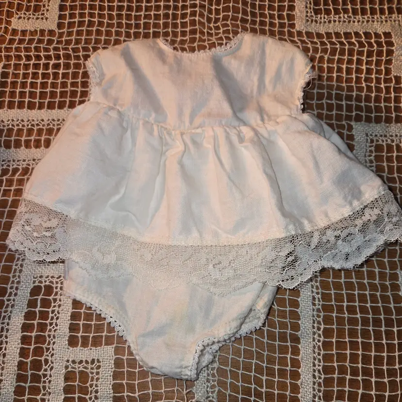 Petticoat has part of the original tag, also some of the hem has come loose as shown. Bib has some discoloration but still good considering the age.