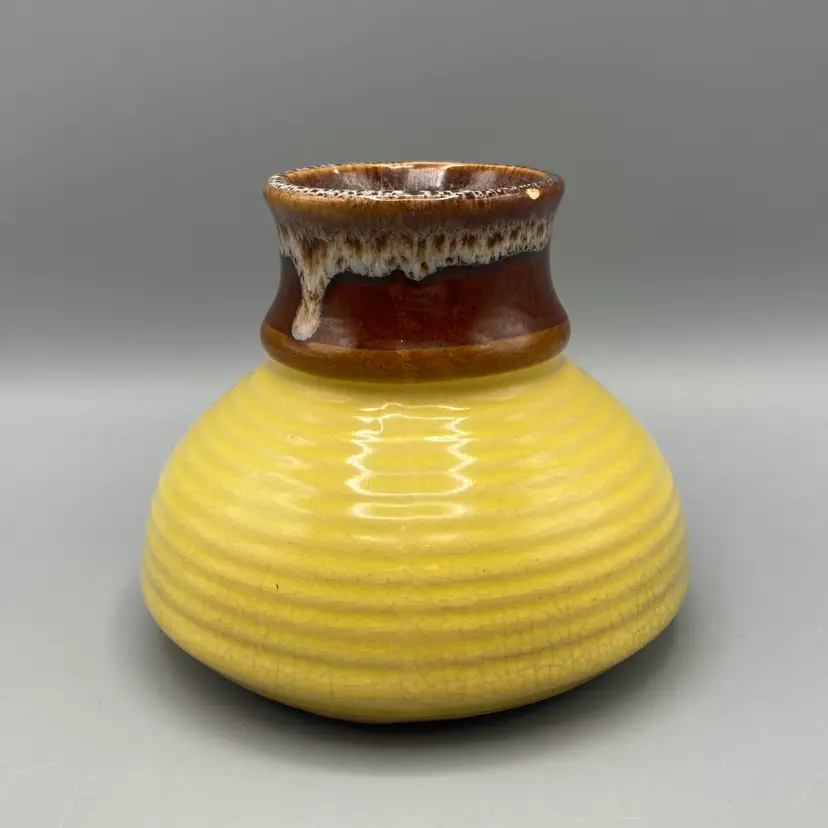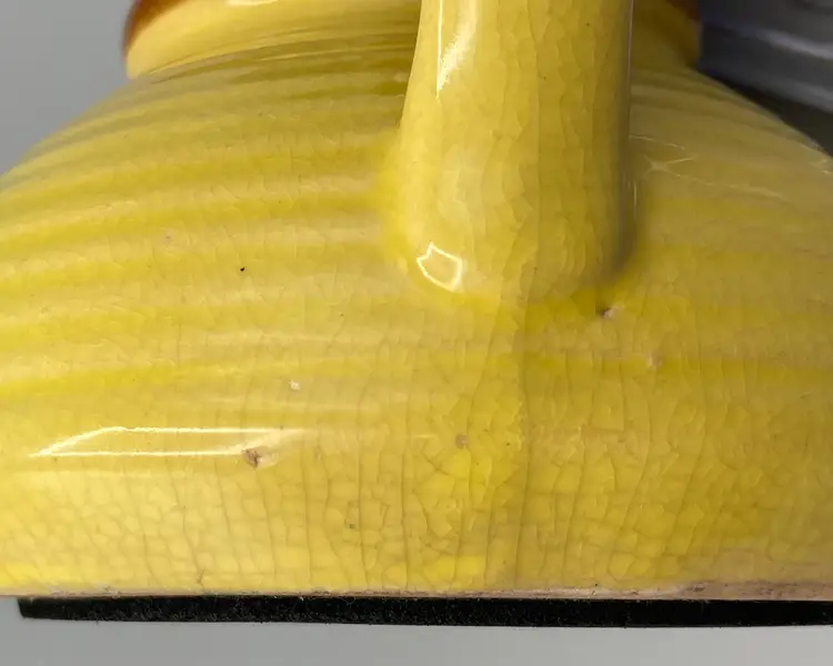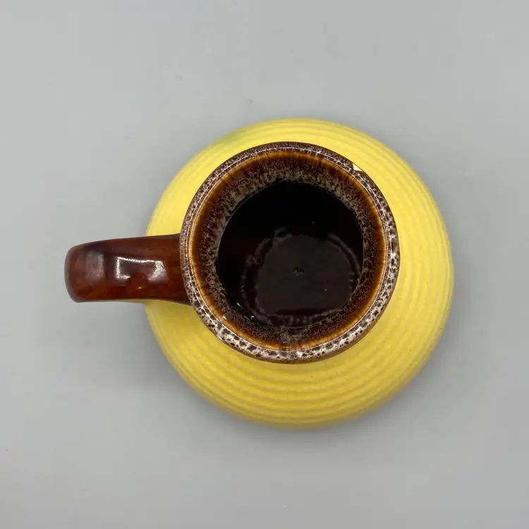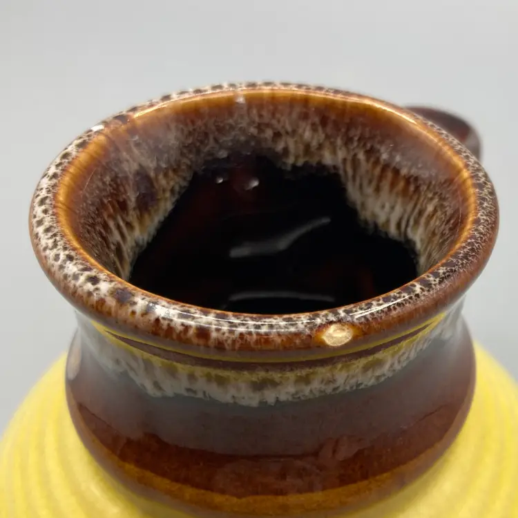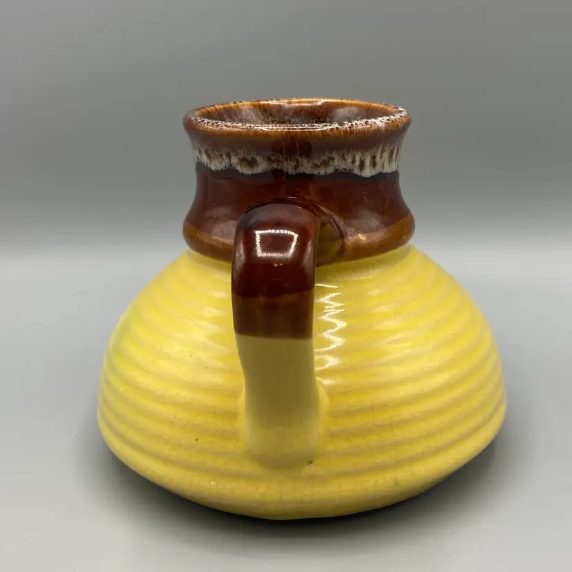 This is in good overall condition. There is some crazing, one small chip on the rim, and some flea bite chips on the back by the bottom of the handle. All are clearly visible in the pictures. This mug measures approximately 4" tall x 4 3/4" across at the bottom and 2 1/2" across at the top.