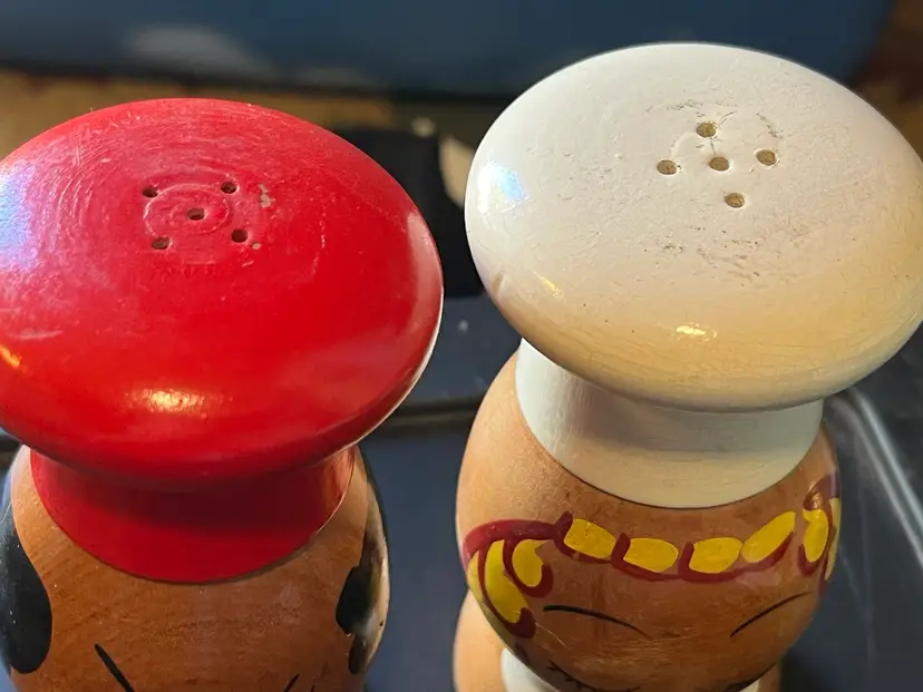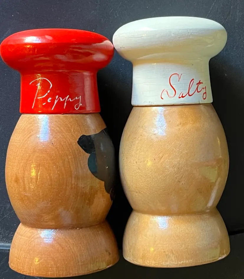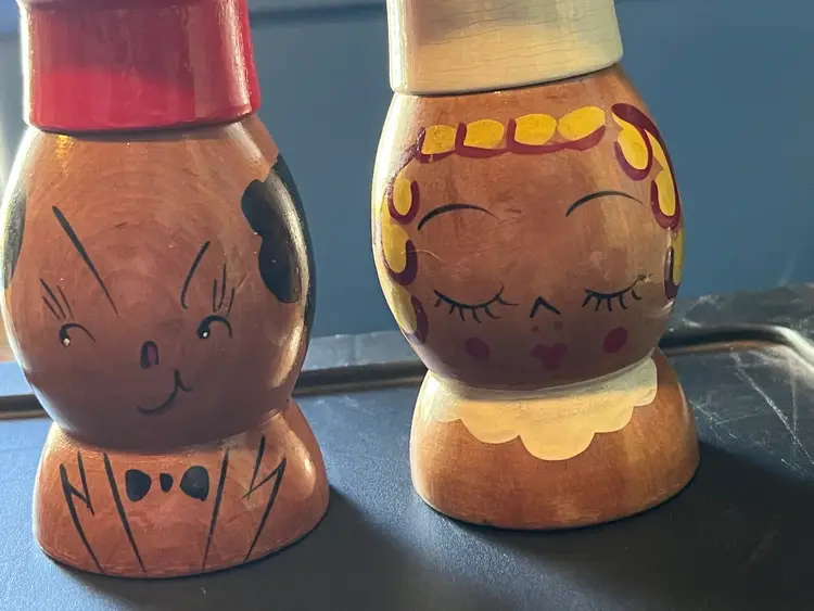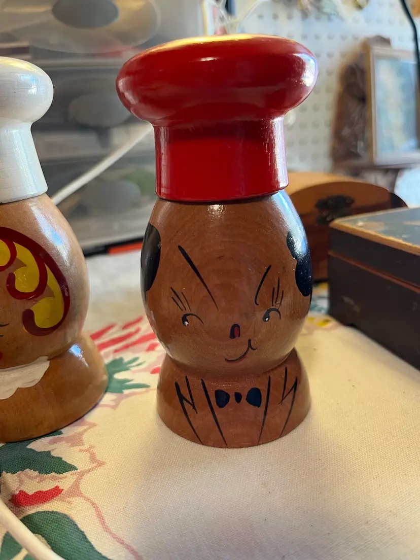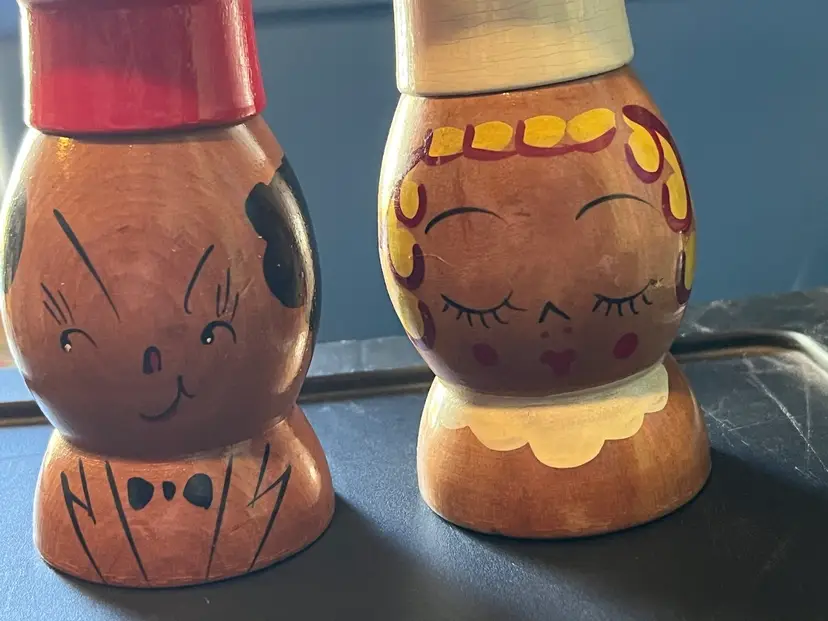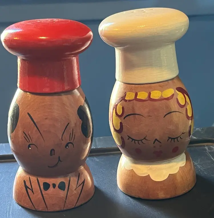 These are made in Japan and soo cute. Great condition in and out and painting there names are on the back that I haven’t seen before they’re 5 1/4” tall and 2 1/2 wide on top Great for your vintage kitchen decor