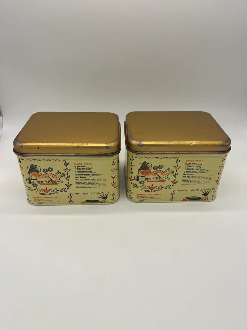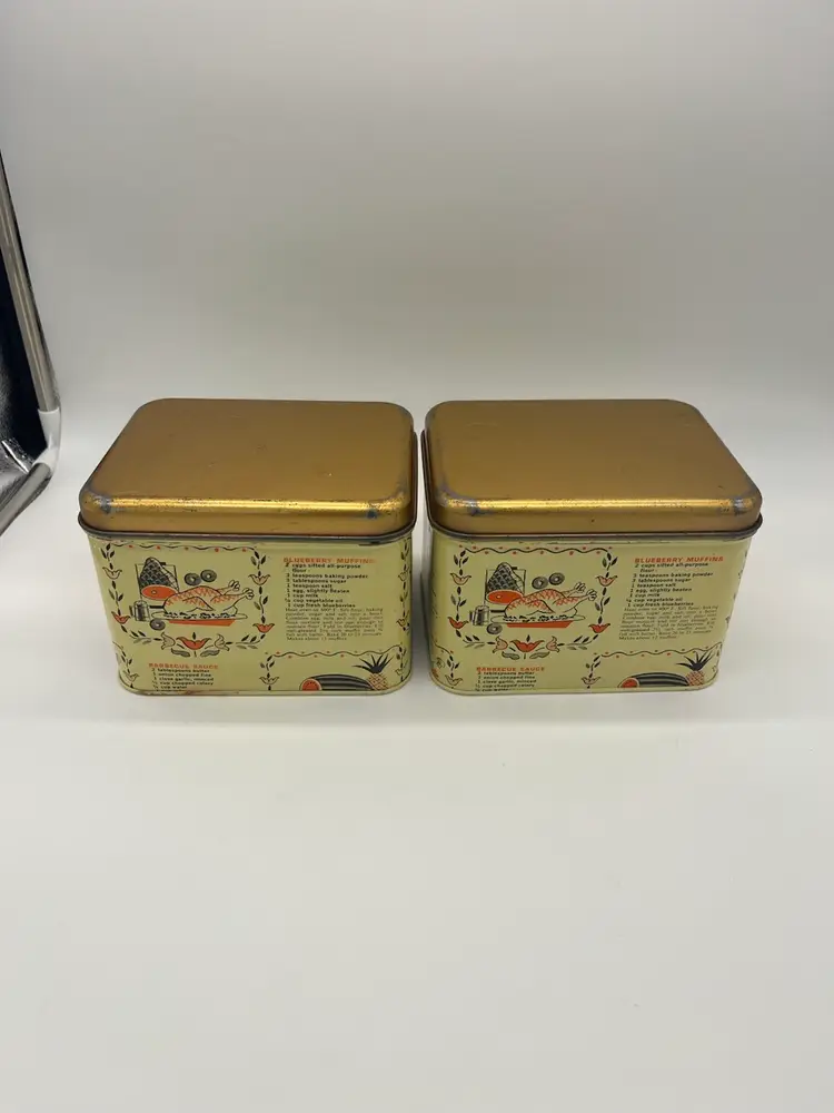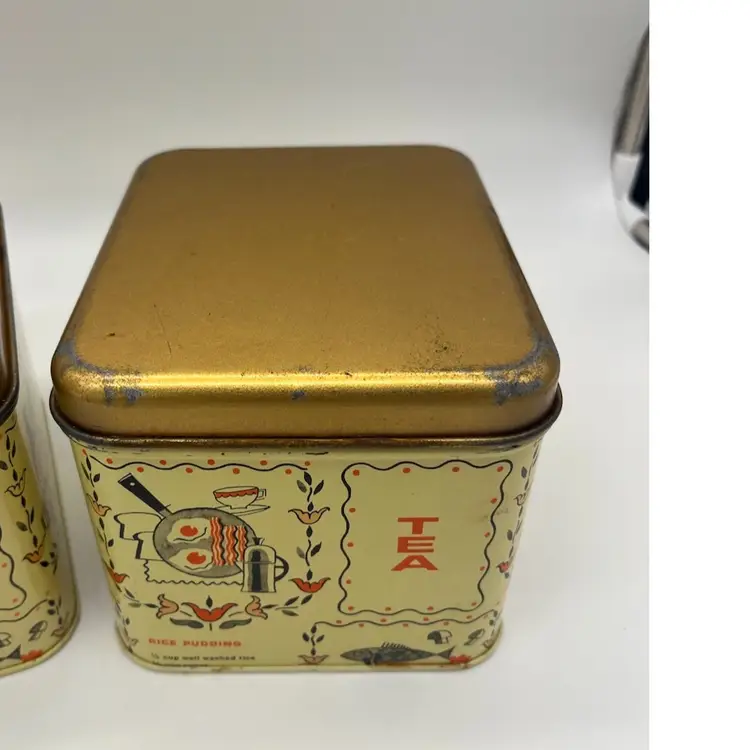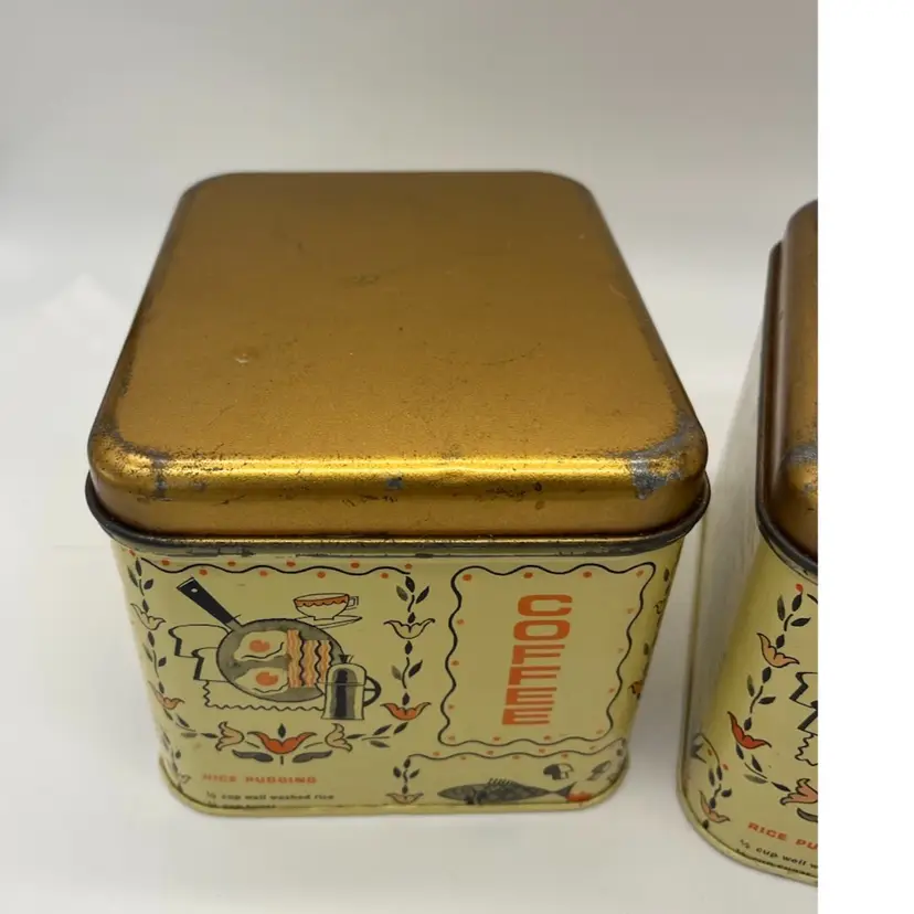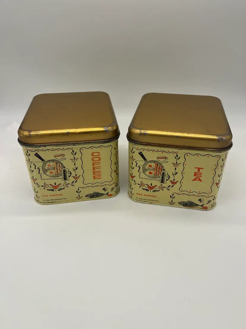 This is a set of Cheinco tins, one coffee and one tea. Each has various recipes and kitchen items on each. Very kitschy and cool retro decor. There is wear and marks on each, please look at all the pictures.