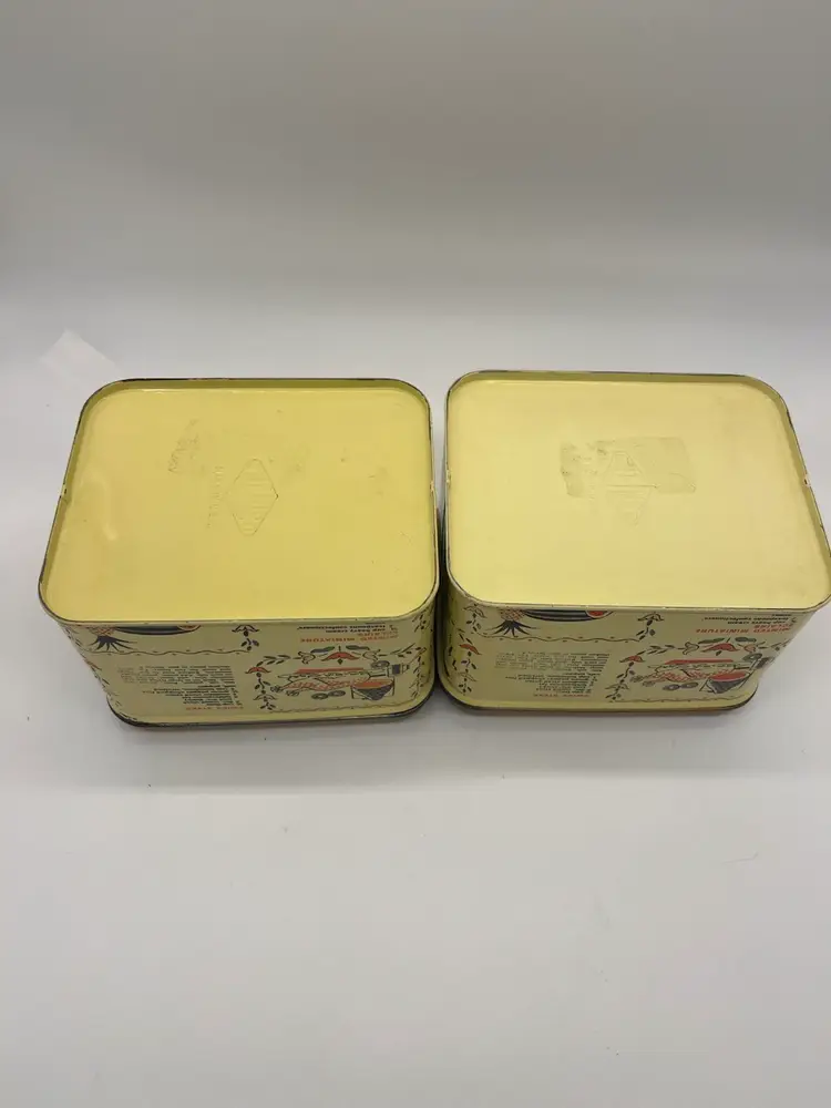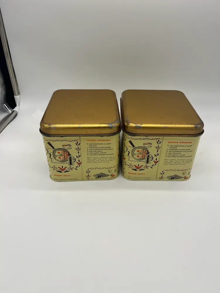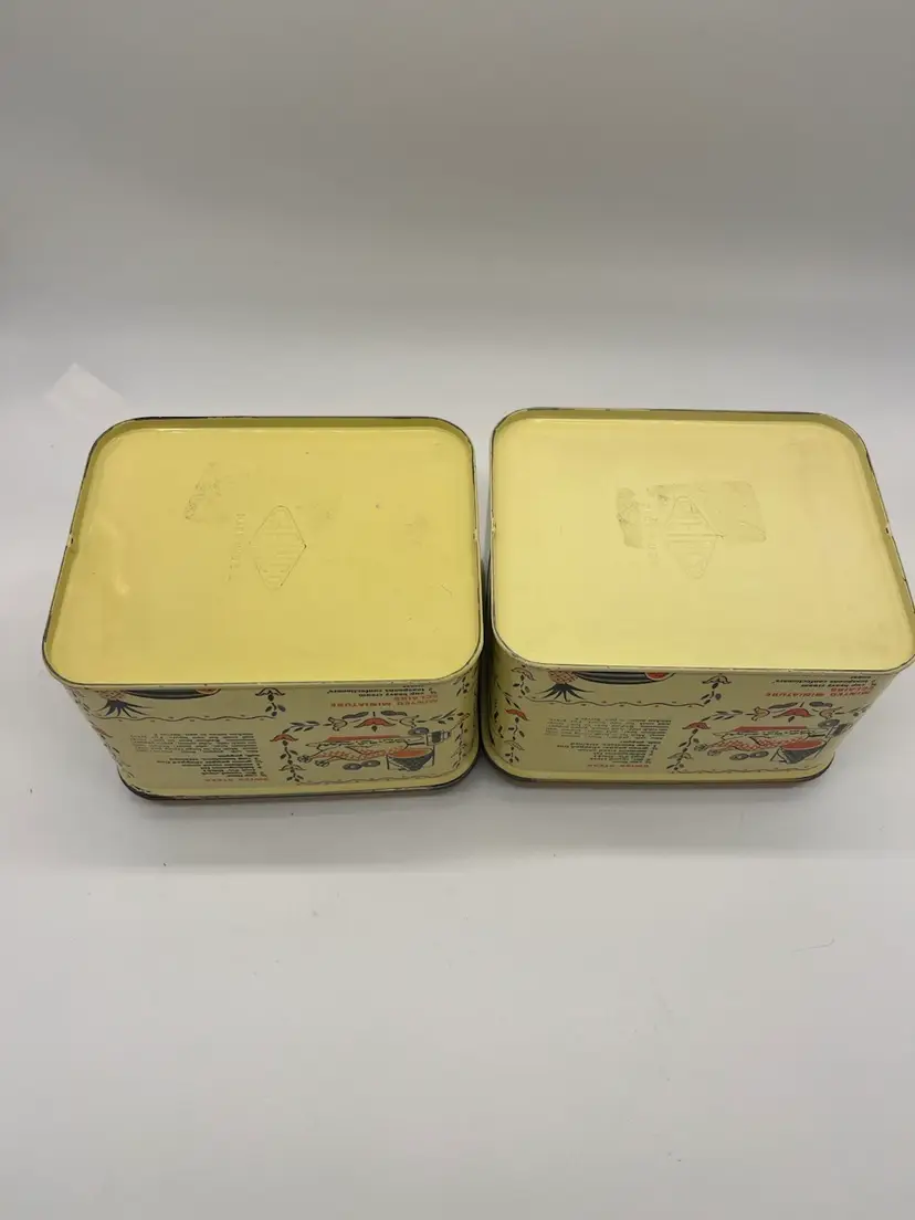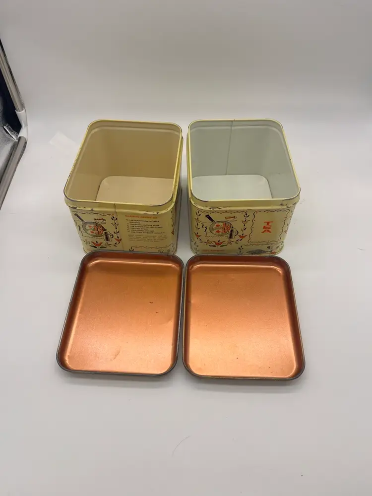 This is a set of Cheinco tins, one coffee and one tea. Each has various recipes and kitchen items on each. Very kitschy and cool retro decor. There is wear and marks on each, please look at all the pictures.