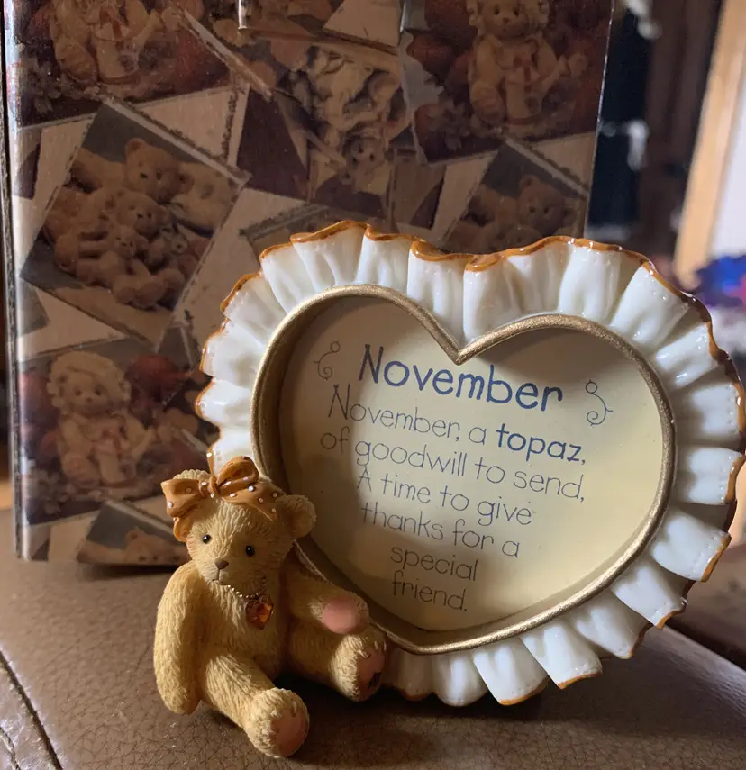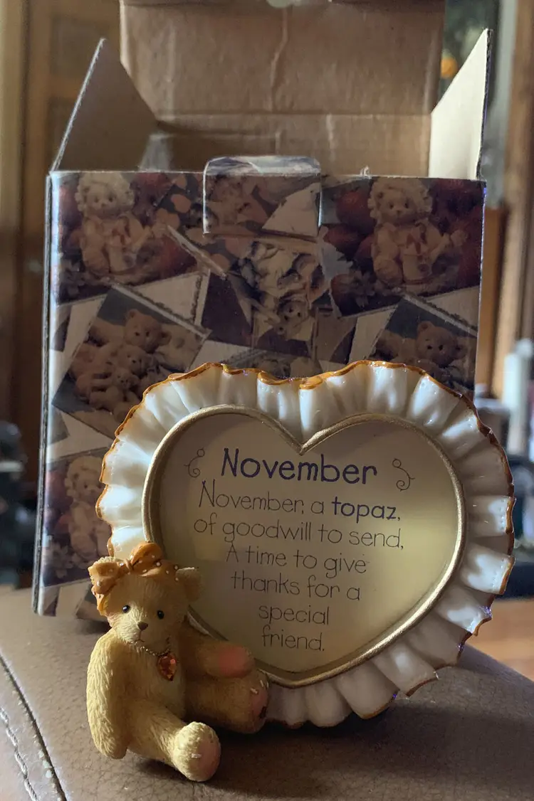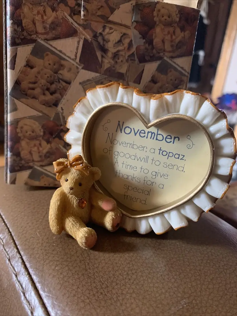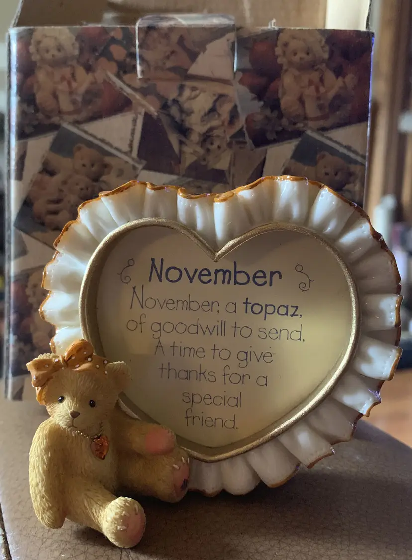 Artist: P. Hillman Character: Cherished Teddies Occasion: Birthday Size: Small Color: Topaz Year Manufactured: 1997 Modified Item: No Subject: Birthday Brand: Enesco Type: Figurine Item Height: 3 inches Model: 311715 Collection: Cherished Teddies Theme: Animals & Dinosaurs Features: Framed Time Period Manufactured: 1990-1999 Country/Region of Manufacture: China Room: Any Room Handmade: No