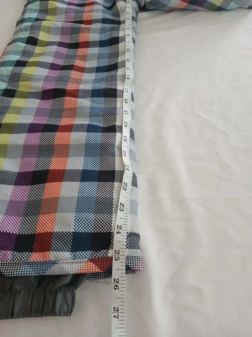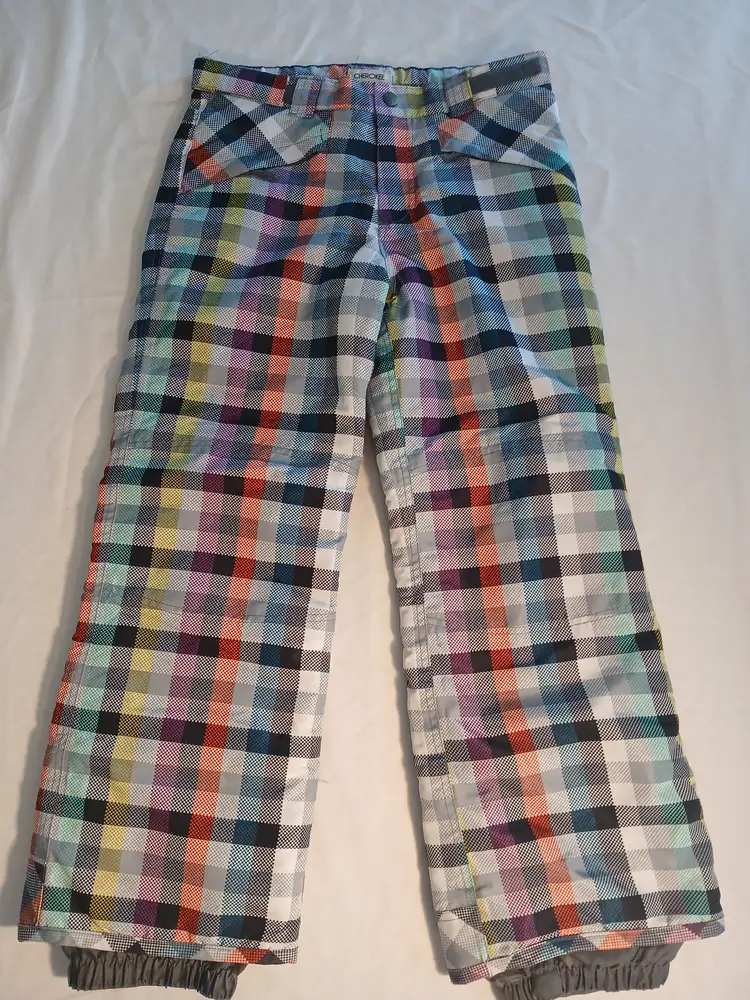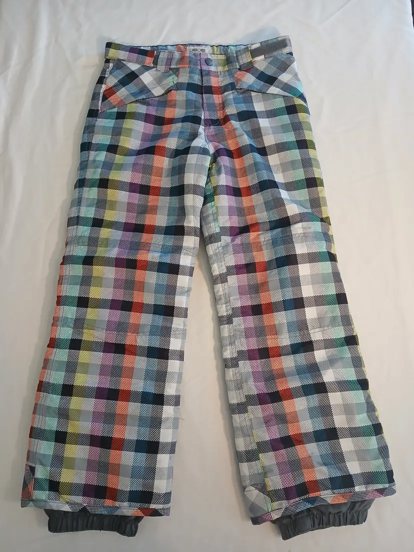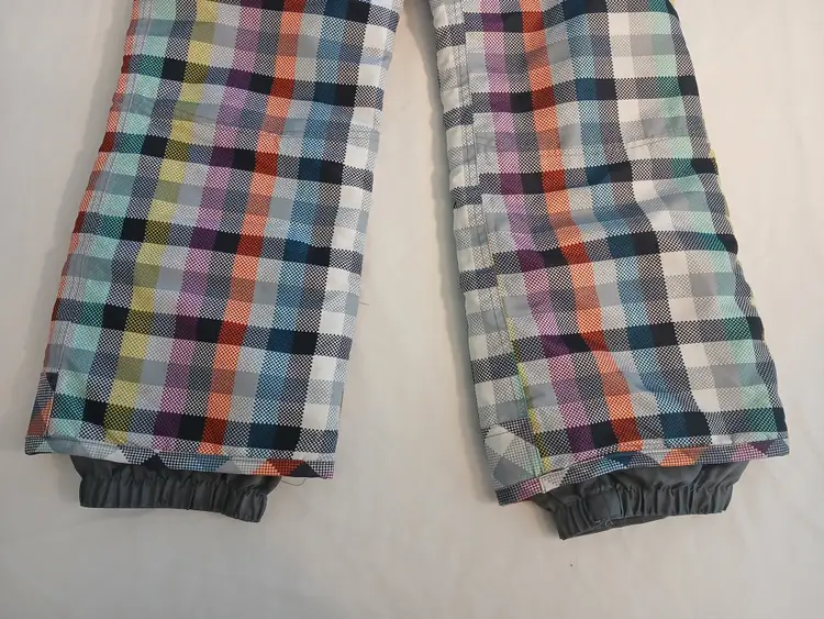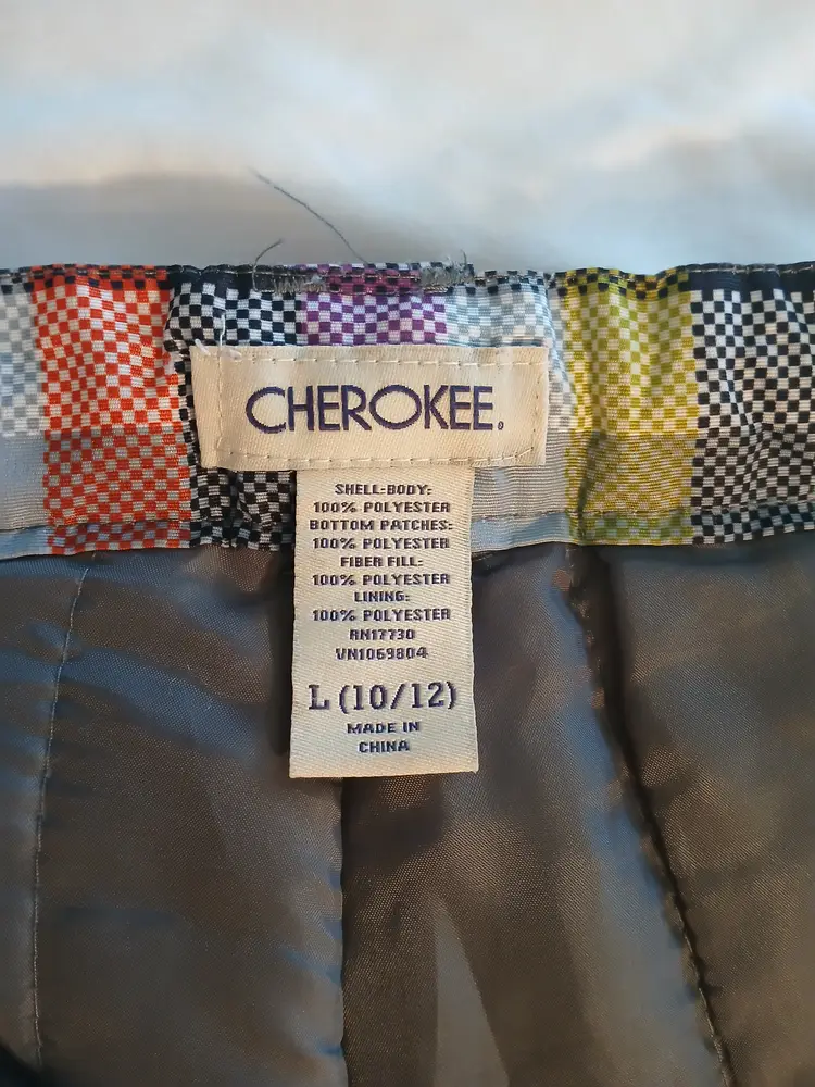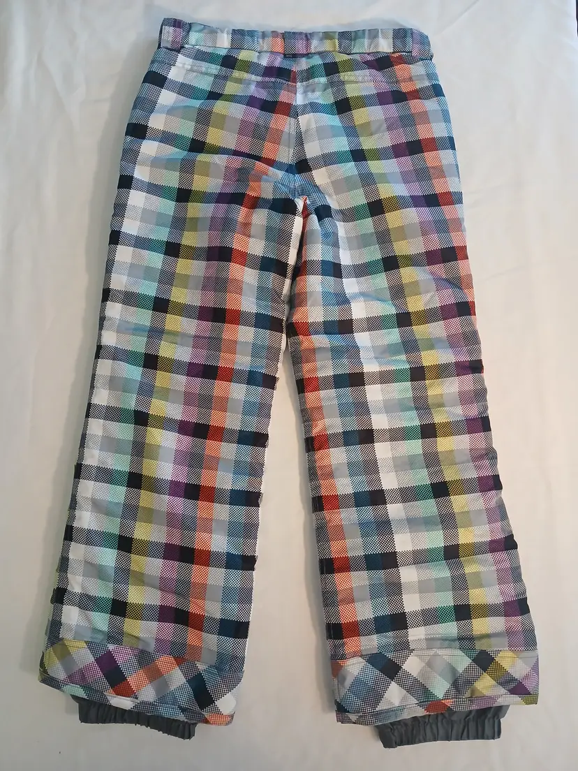 Pre-owned Cherokee insulated kids’ snow pants, size Large (10/12), featuring a vibrant multicolor plaid design. Made of 100% polyester with fiber fill for warmth. Two front flap pockets, reinforced bottom patches, and elastic cuffs help keep snow out—ideal for skiing, snowboarding, or everyday outdoor play. Approx. inseam: 26". In good condition with light wear. Durable, colorful, and ready for winter fun.