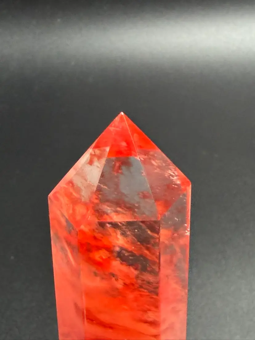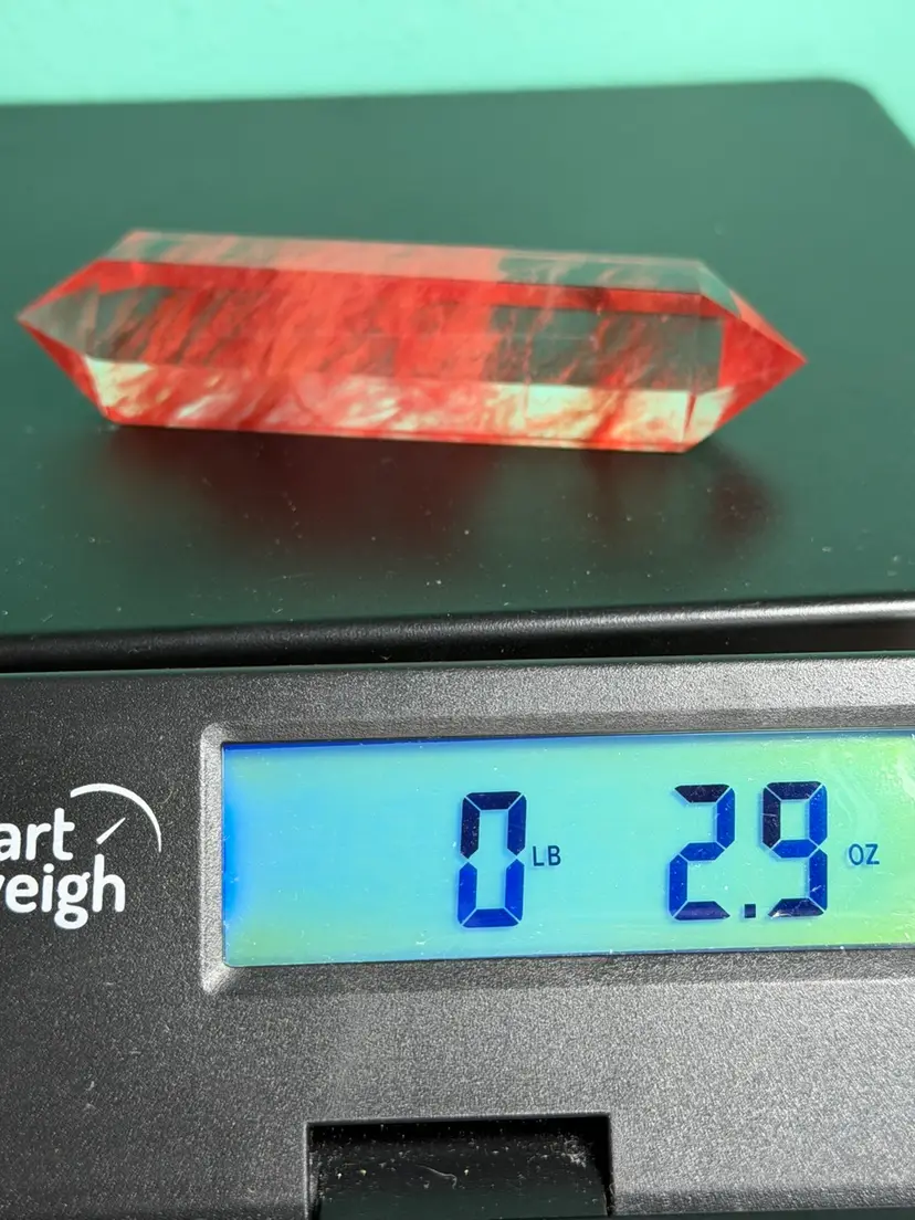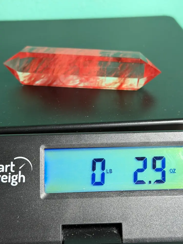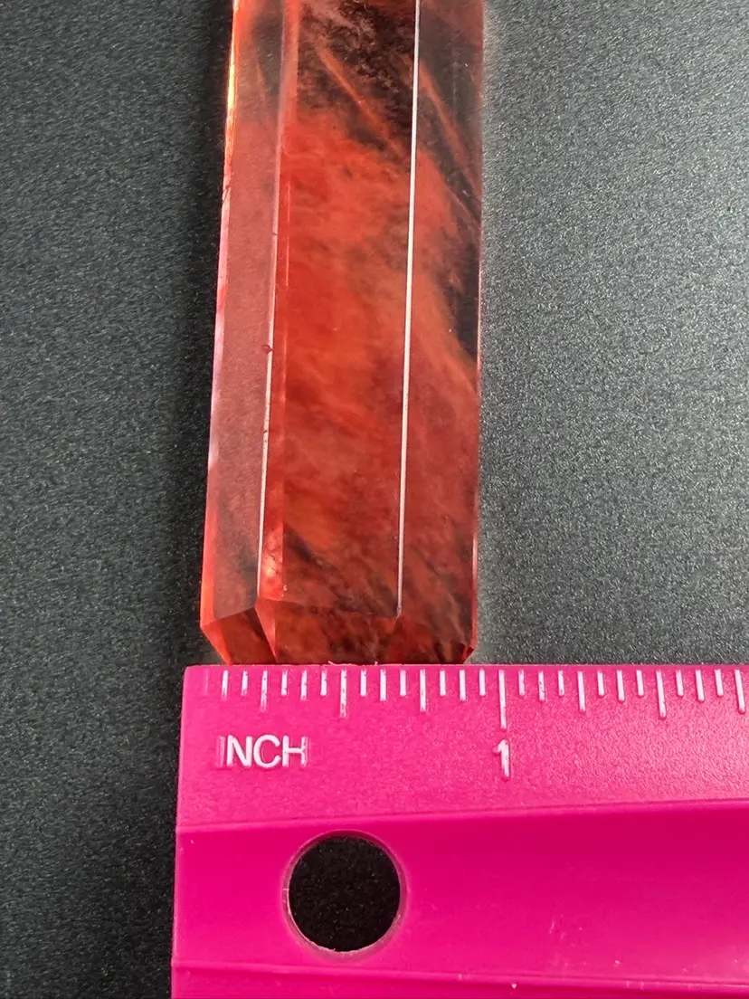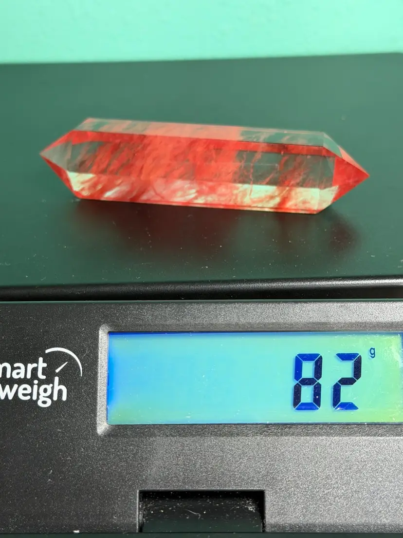 Comes with stand. Cherry Quartz is manmade from glass fused with cinnabar. Measures 4" long, weighs 2.9oz.