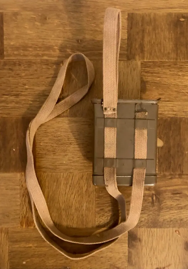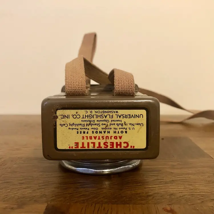 This item is a vintage "Chestlite" brand adjustable headlamp or flashlight, likely dating back to the mid-20th century. It was manufactured by the Universal Flashlight Co. and has a boxy metal casing with a large, round reflector and a fabric strap.