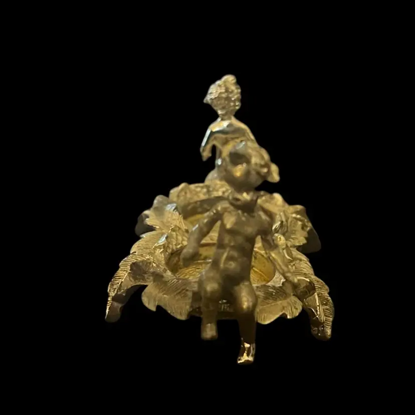 Vanity sets and decorative holders for personal items like lipstick became increasingly popular in the late 19th and early 20th centuries, coinciding with the rise of cosmetics and personal grooming as a daily ritual. This particular piece, with its cherubic figures and filigree work, evokes a sense of romanticism and opulence. This piece was most likely made in the mid century to hold lipsticks.