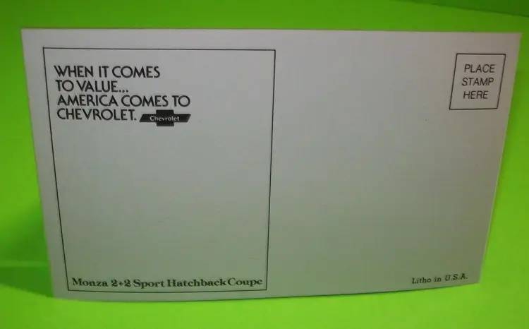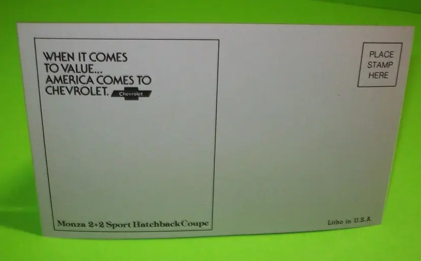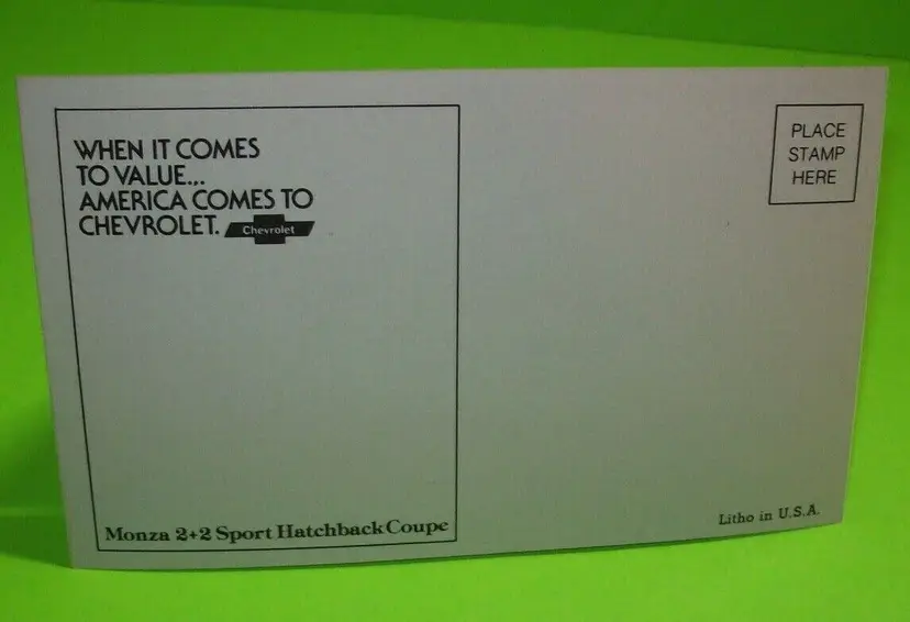 Size: Standard (5.5 x 3.5 in) Custom Bundle: No Personalize: No Type: Printed (Lithograph) Year Manufactured: 1979 Number of Items in Set: 1 Signed: No Original/Licensed Reprint: Original Occasion: Car Time Period Manufactured: 1970-1979 Unit of Sale: Single Unit Era: Post-War (1945-Now) Artist: Unknown Country/Region of Manufacture: United States Material: Paper Theme: Automobiles Features: Divided Back, Embossed Subject: Transportation Postage Condition: Unposted Brand/Publisher: Unknown Franchise: Chevy
