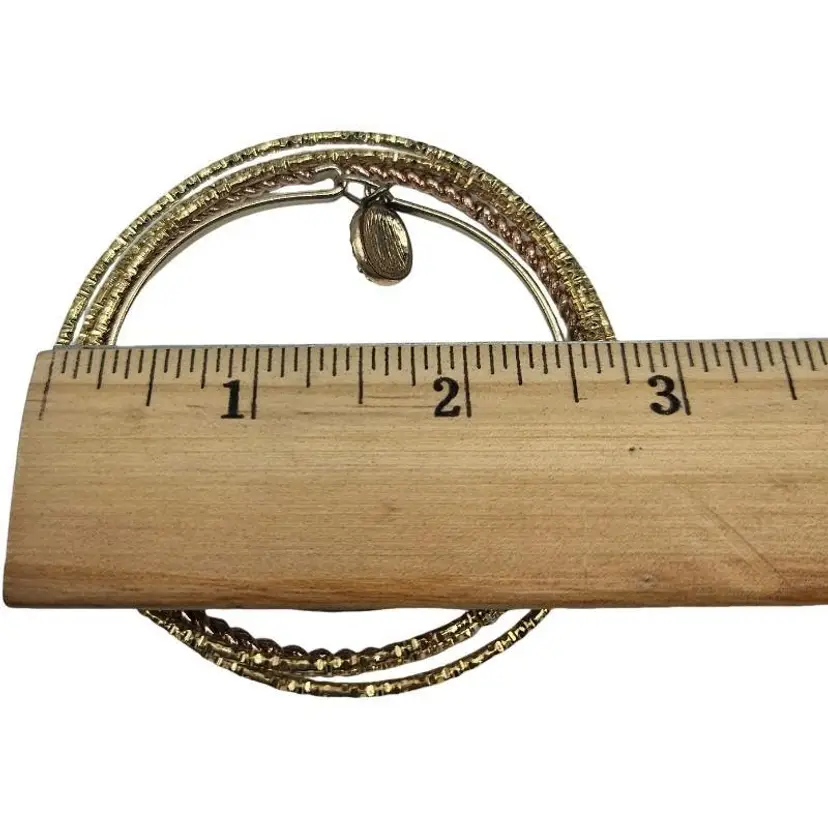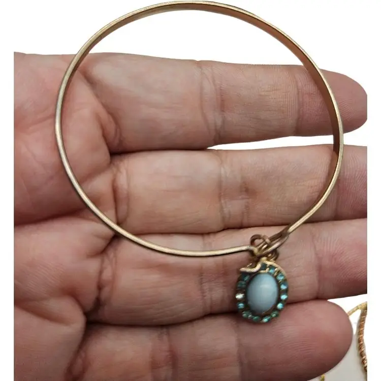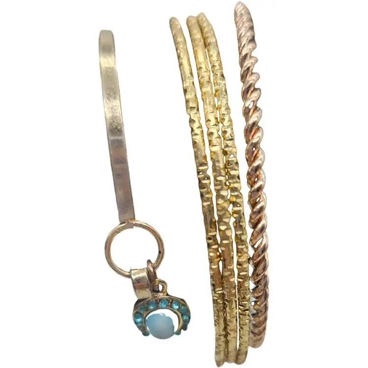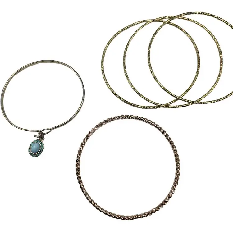 Elegant set of bangles. Includes gold and silver tones. Features a turquoise charm.