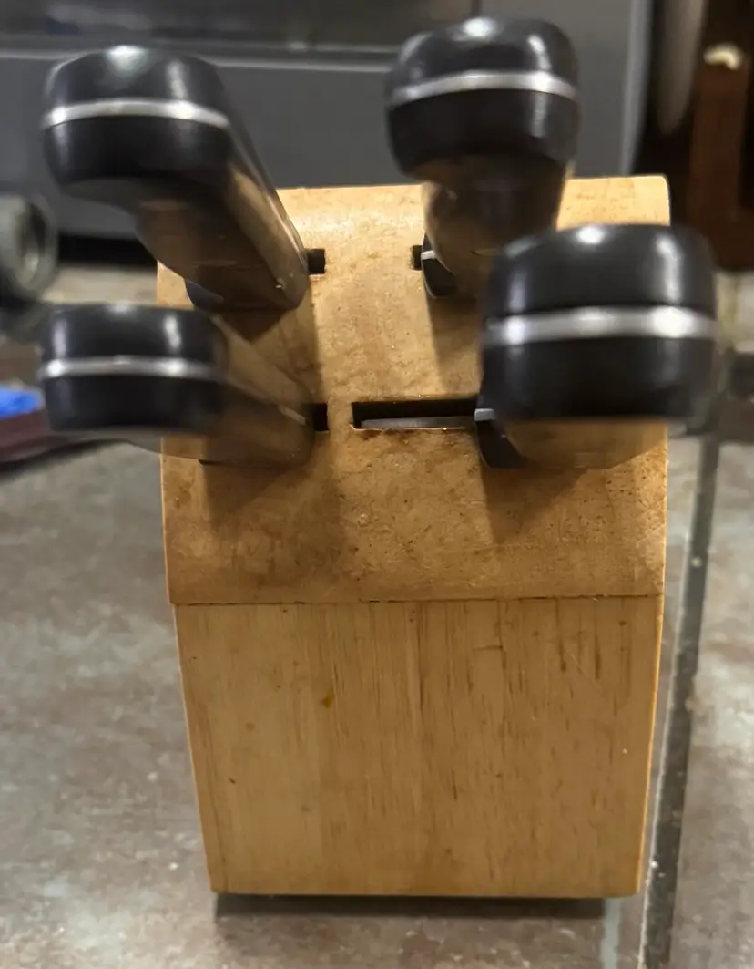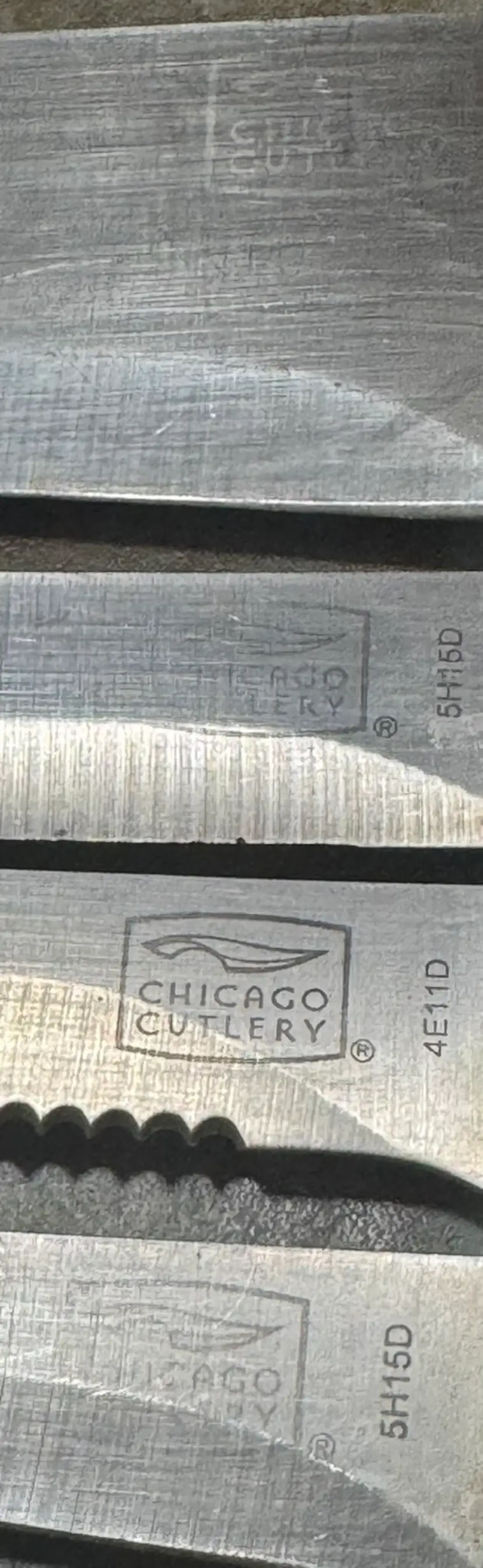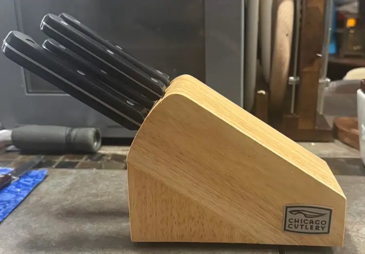 Chicago Cutlery 4 Knife Set In Wood Block. Includes chef knife, trimming knife, paring knife, and serrated knife, all in a branded wooden knife block.