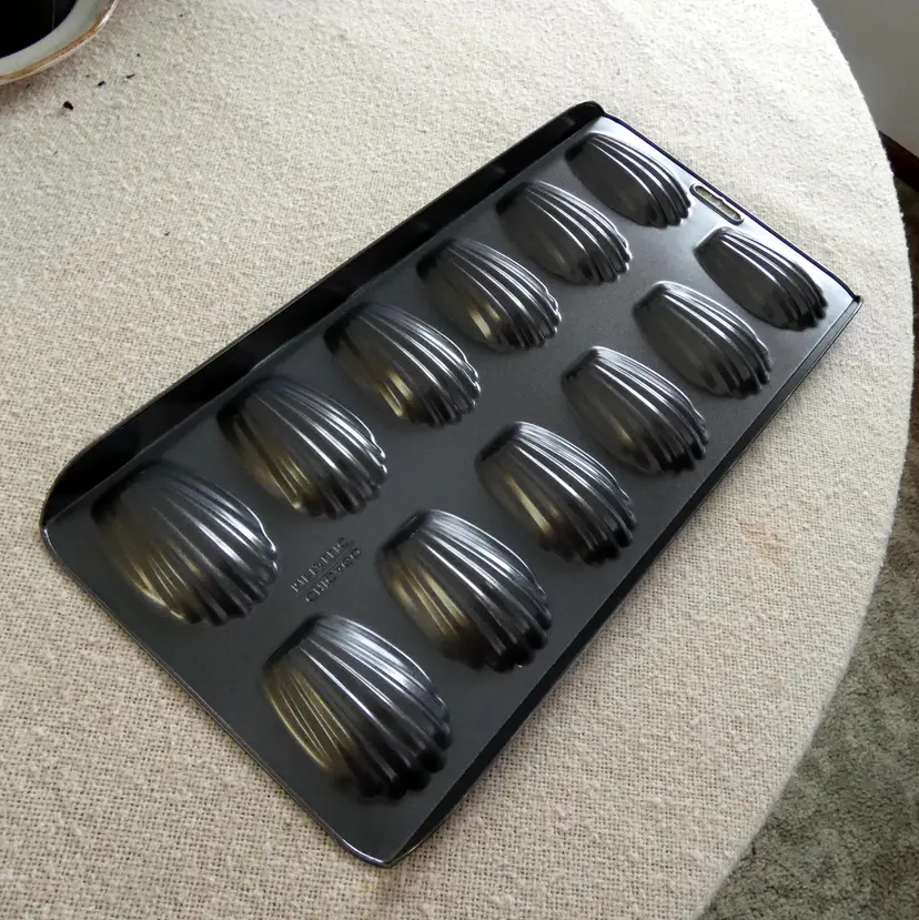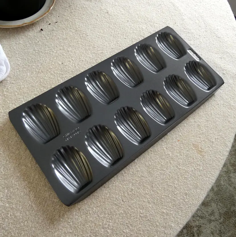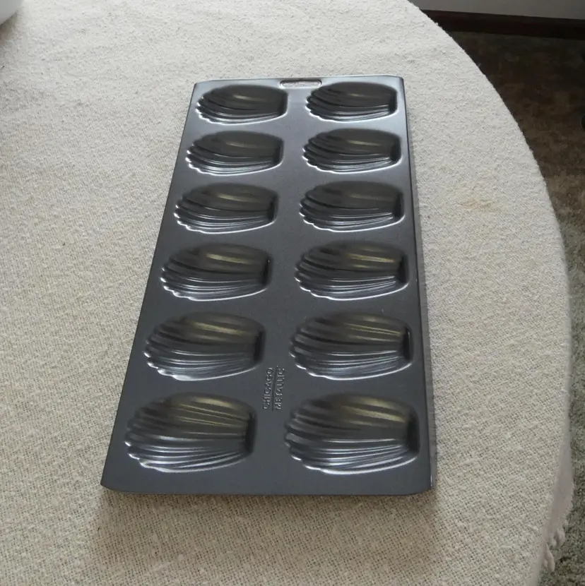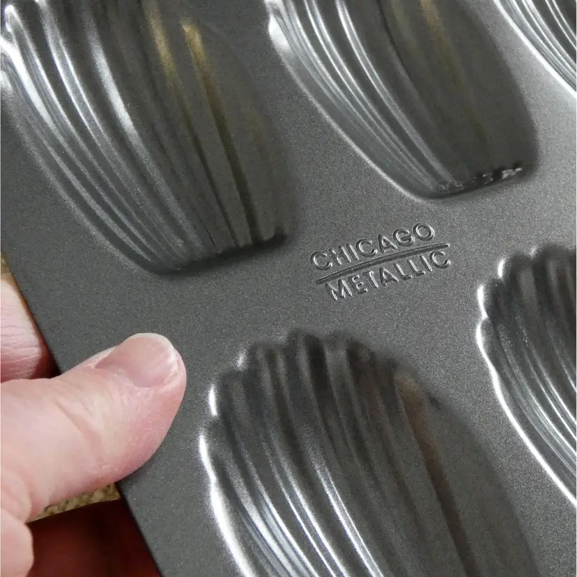 12-section pan for baking Madelaines by Chicago Metallic. Gray non-stick. This one looks little or never used, no scratches. Pan measures about 16" long by 8" wide and 1" height allows for the cookie wells. Traditional shell shapes.