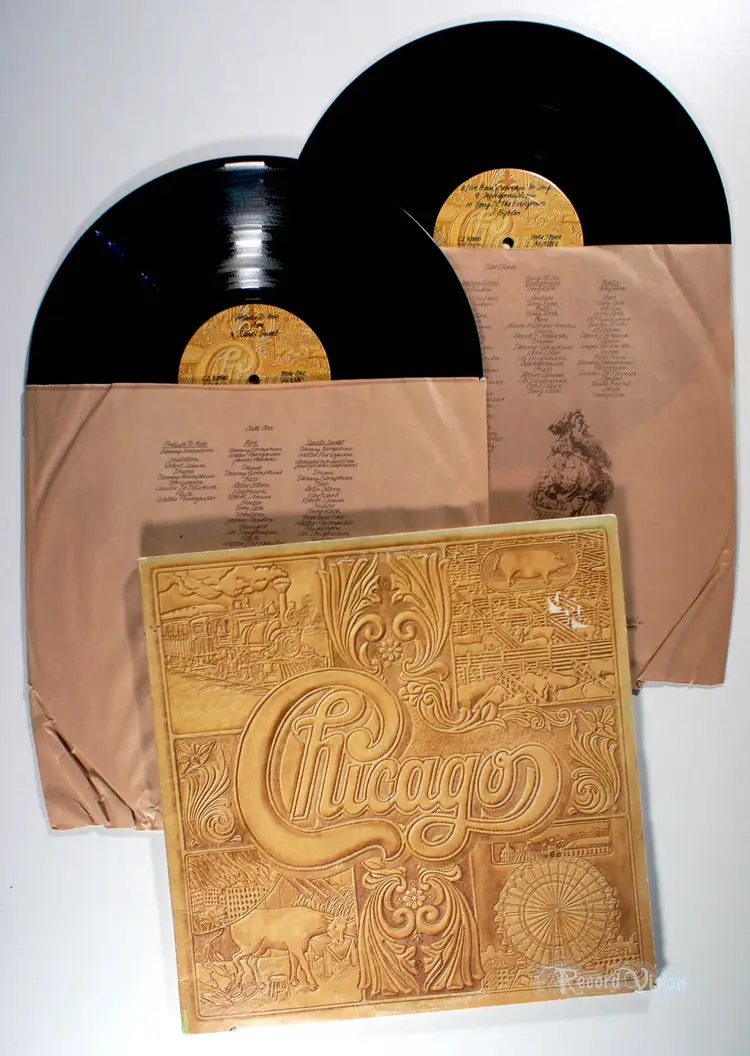 Vinyl plays with occasional light-crackles (play-graded). Double LP. Gate-fold cover, embossed and textured to simulate leather, has a few creases near edges; light scuffing and surface impressions (front/back); a few discoloration spots on back, surface abrasions near top right of front. Inner sleeves are original (artwork/credits); one has two seams partially. Spine is mostly easy-to-read with mild-wear. Shelf-wear along top/bottom-edge and corners. Opening is crisp with signs of light use and divots. (Not a cut-out.)
