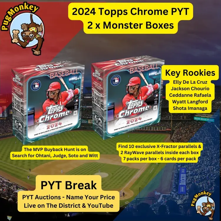 Join our PYT break for 2024 Topps Chrome with 2 Monster Boxes. Look out for key rookies like Elly De La Cruz, Jackson Merrill, Jackson Chourio, Ceddanne Rafaela, Wyatt Langford, Shota Imanaga and more. Each box includes 10 exclusive X-Fractor parallels and 2 RayWave parallels.