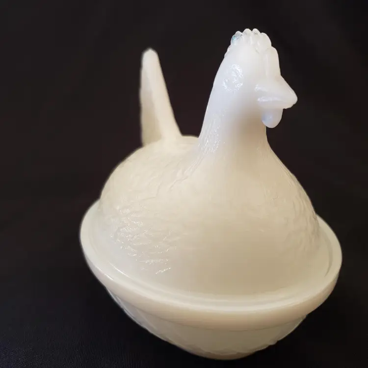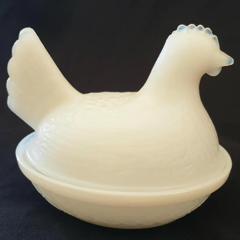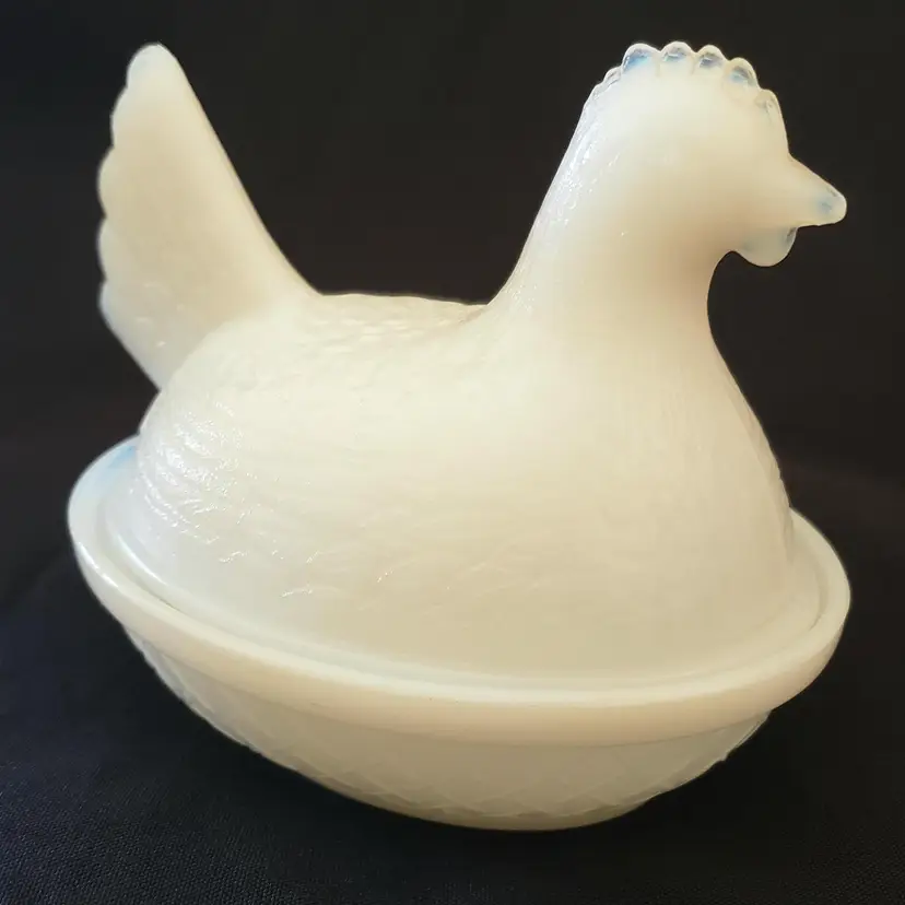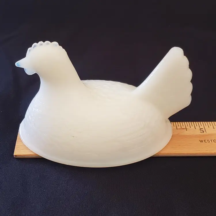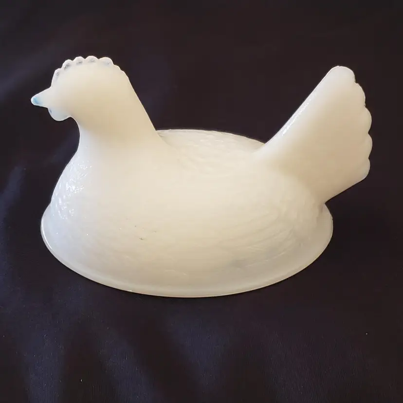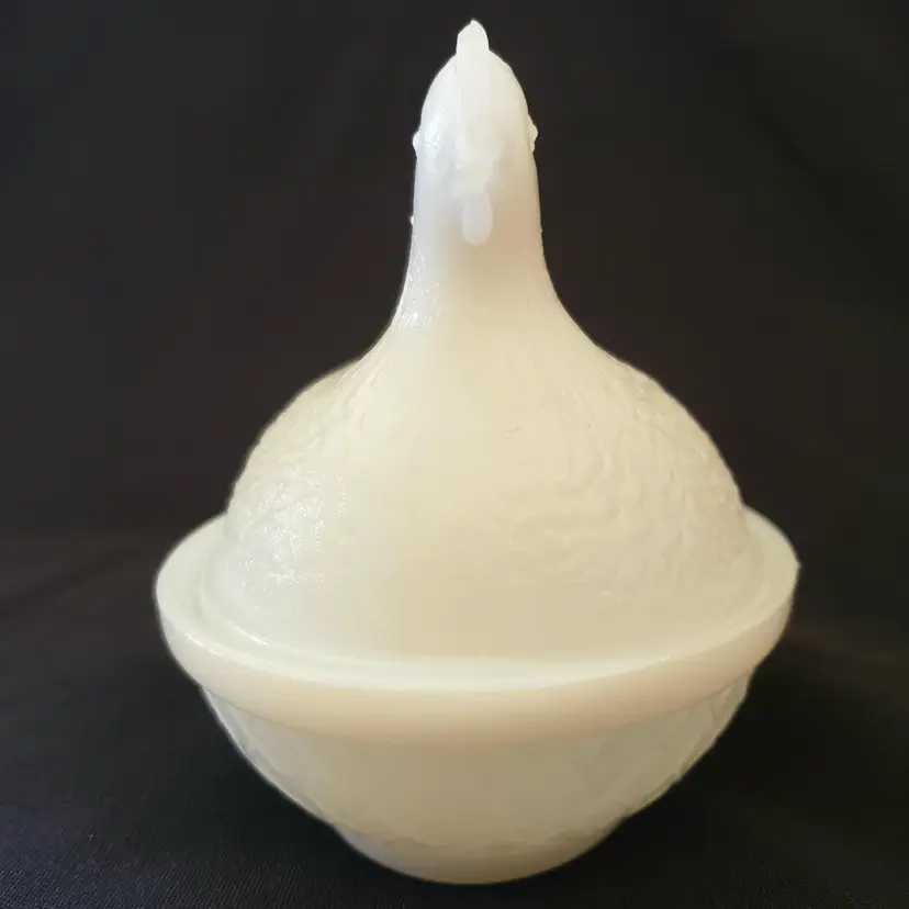 Chicken On Nest Milk Glass Candy Dish Indiana 3¾" Tall x 4⅝" Wide Approximately. Used condition with possible rough spots due to manufacturing and / or use to crown and edge. Please view all the photos and read the entire item description and please ask any questions prior to purchase when possible.