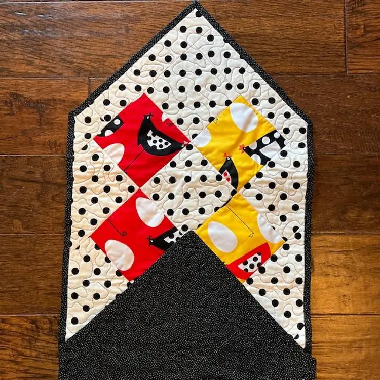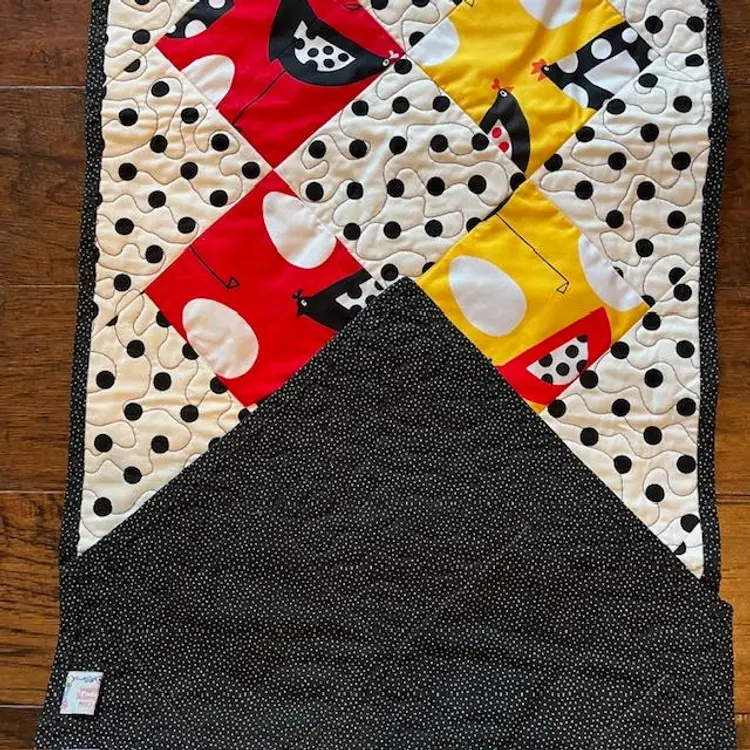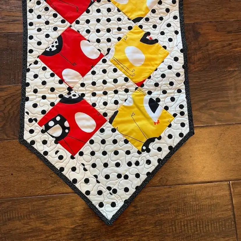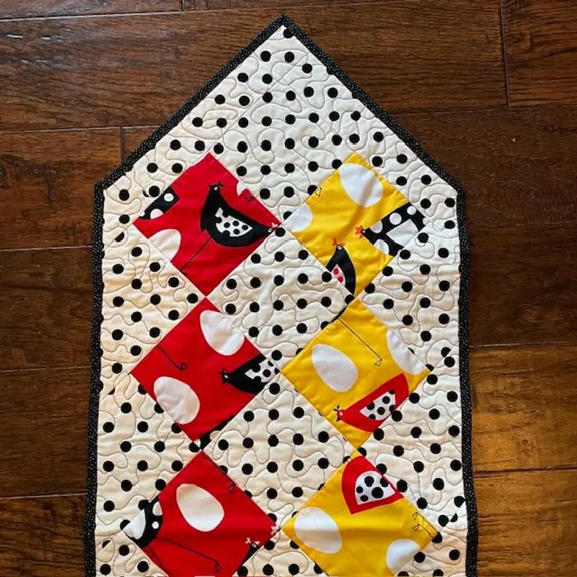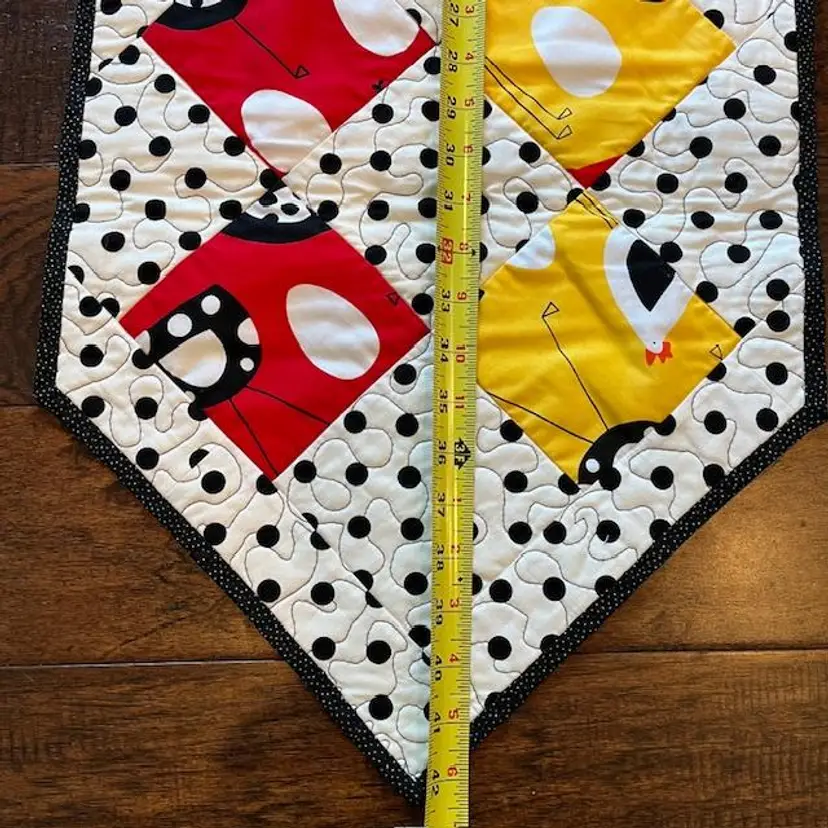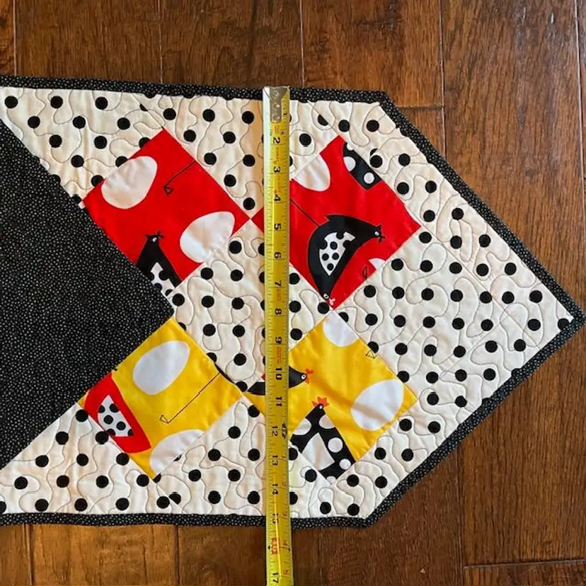 One - of - a Kind - Made of quality washable cotton material in black, red, yellow and white. Featuring polka dot and whimsical chickens. Table runner measures 15" wide x 42" long. The backing is black with white tiny white dots. Machine quilted is a meandering pattern. Cotton front, middle is warm and natural batting and cotton backing.