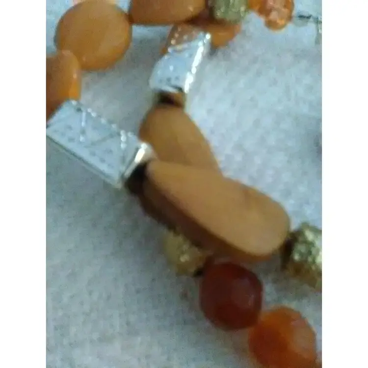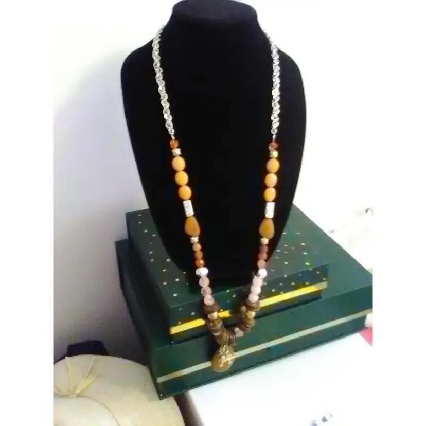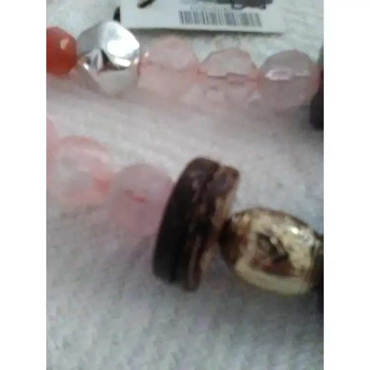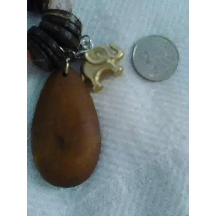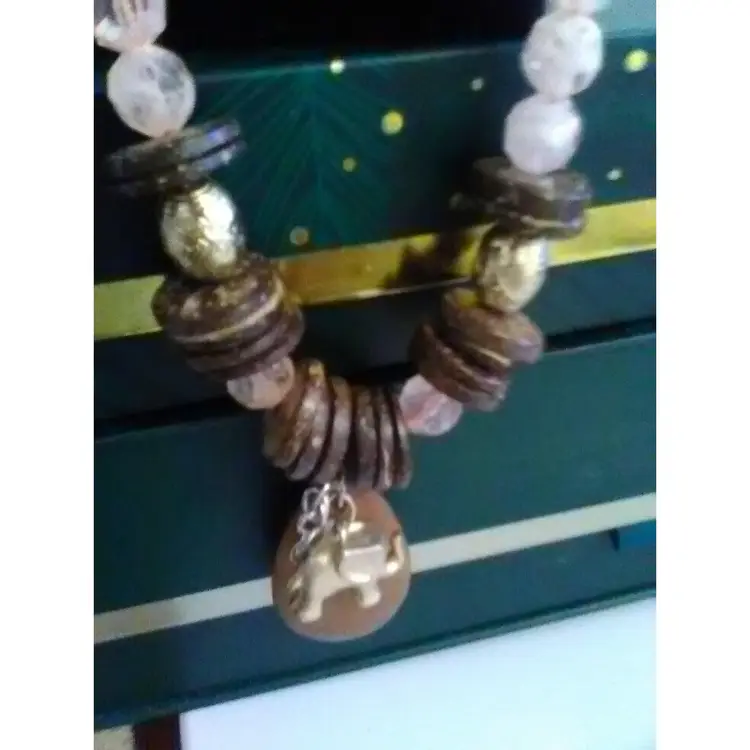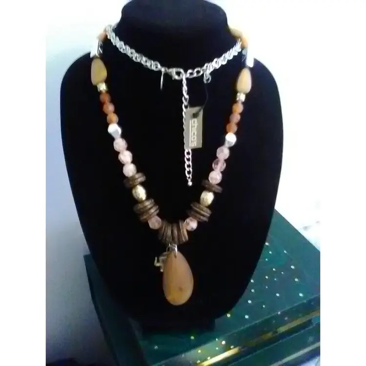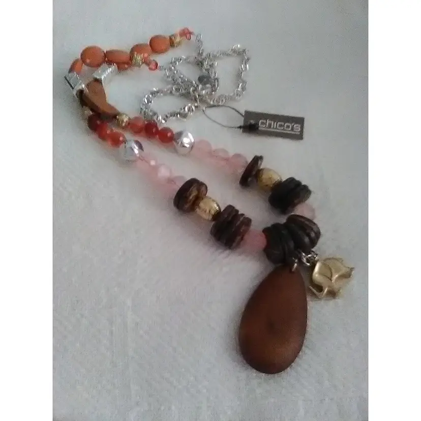 Chico's NWT and hang tag. Features include faceted resin and plastic beads in pink & salmon colors. Silver tone beads and hardware. Gold tone beads and elephant. Discs and oval shape are wood. Lobster claw clasp. Measures total length of 41 1/4" with 20 1/2" hang length . Can be fastened along the chain to have a shorter hang length.