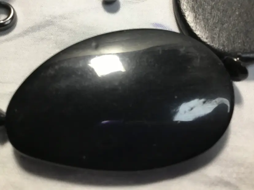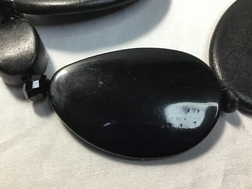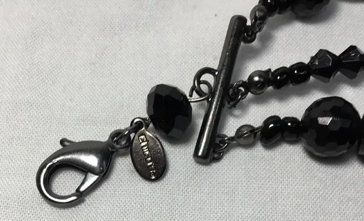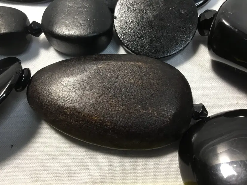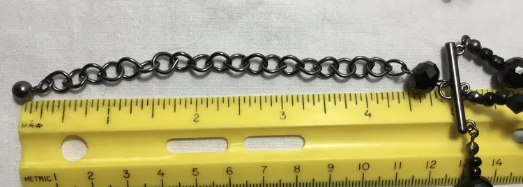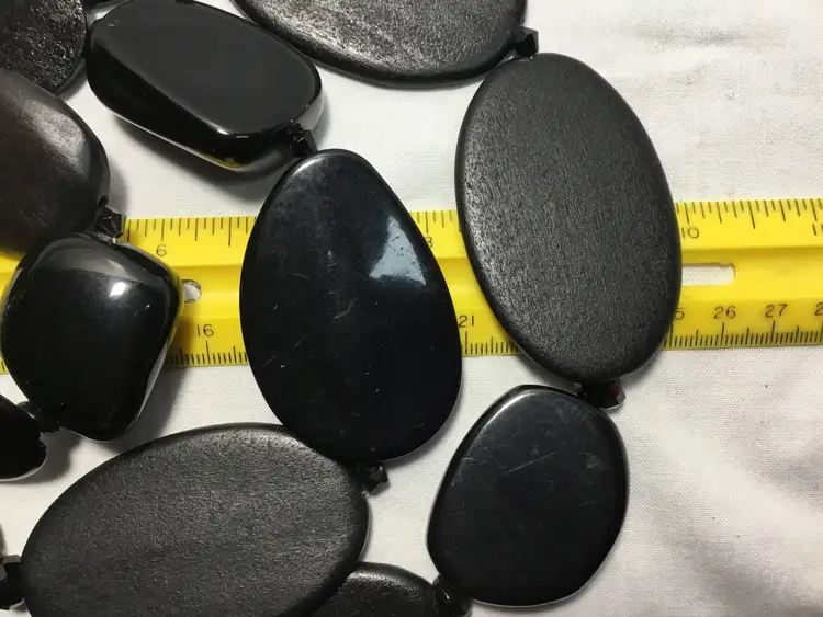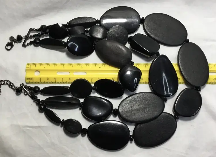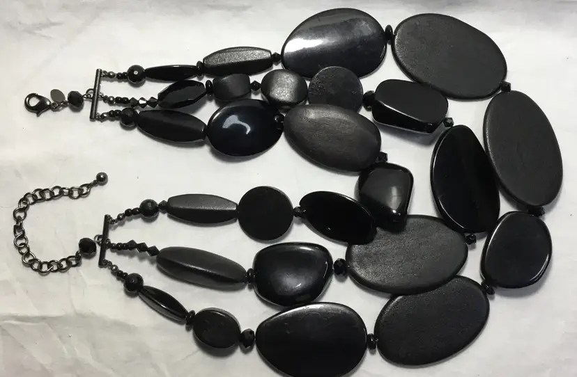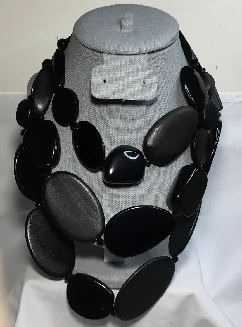 3 strand chunky, black, statement necklace. Assymetrical large beads are made of shiny acrylic or stained black wood. The three strands are 12 inches long, 16 inches long and 20 inches long with a 4.5 inch extension chain for adjusting. Hang tag identifies Chico's as the maker, probably in the 1990s or early 2000s. Good condition, all acrylic beads have minor scuffs and dings. (See all photos) One wooden bead shows wood through the black stain.