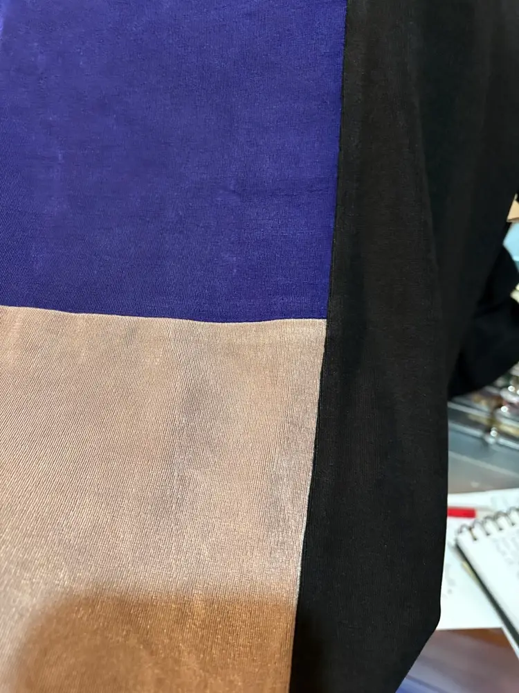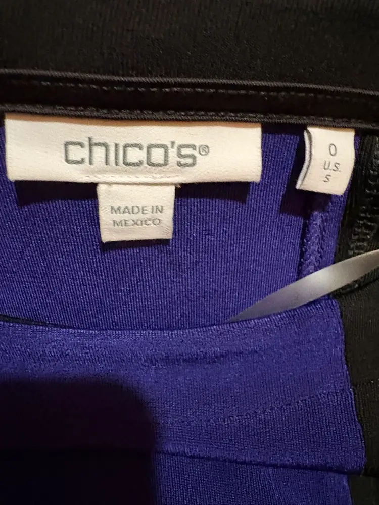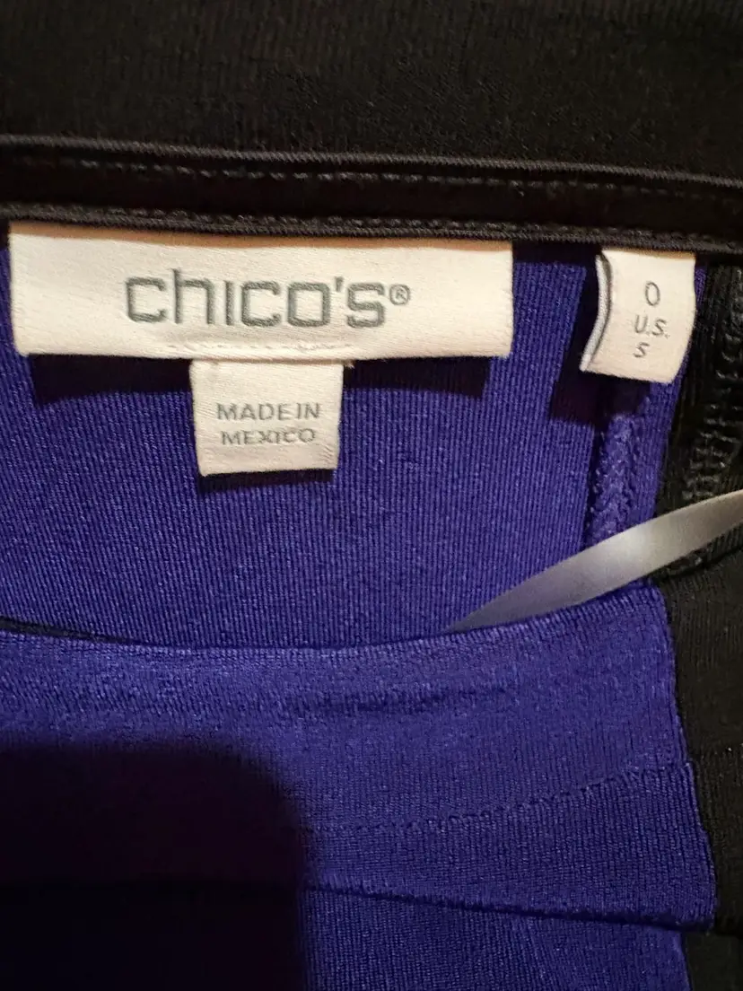 Chico’s block pattern tunic Size Chico 0 which is Women Size 4 Block pattern in purple, black and taupe Measurements Armpit to armpit. 19 inches Shoulder to hem 26 1/2 inches