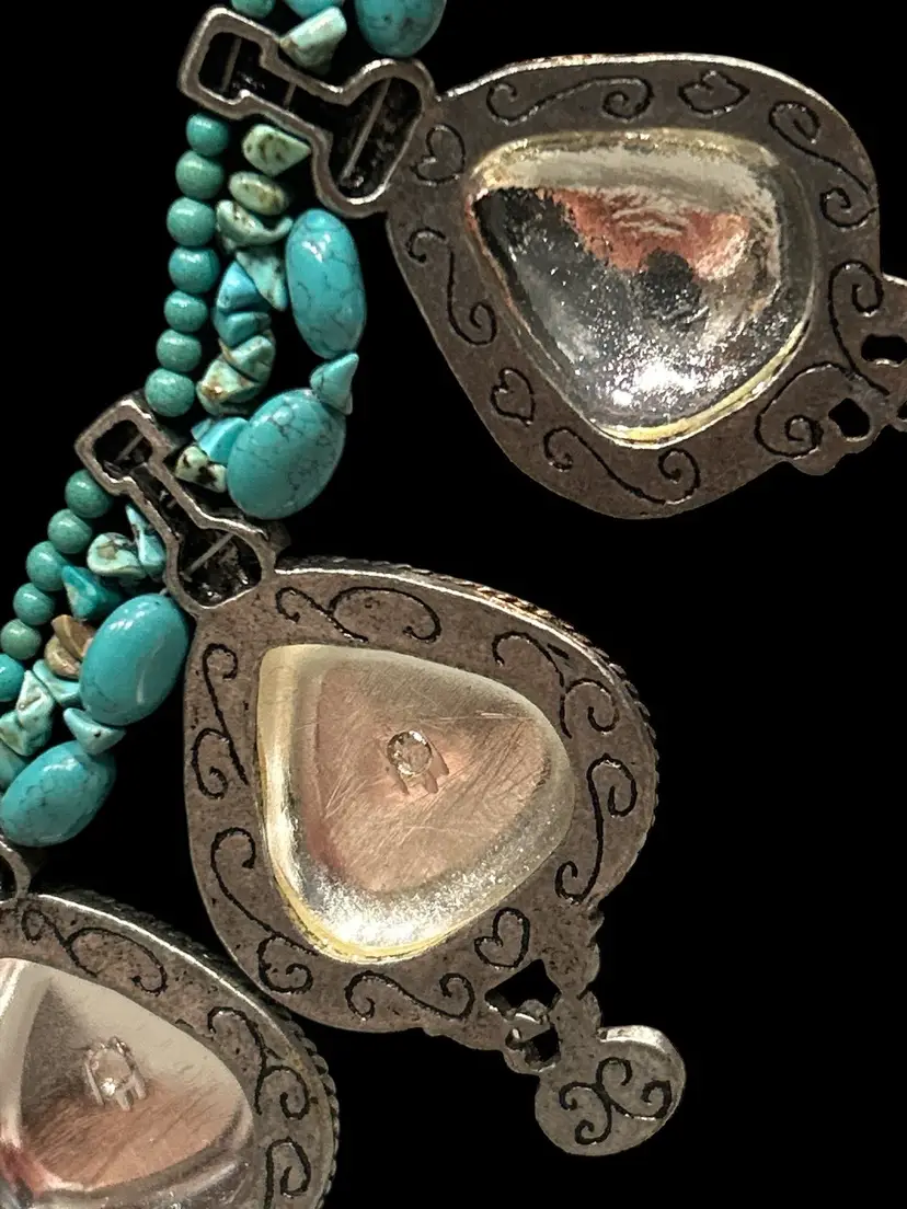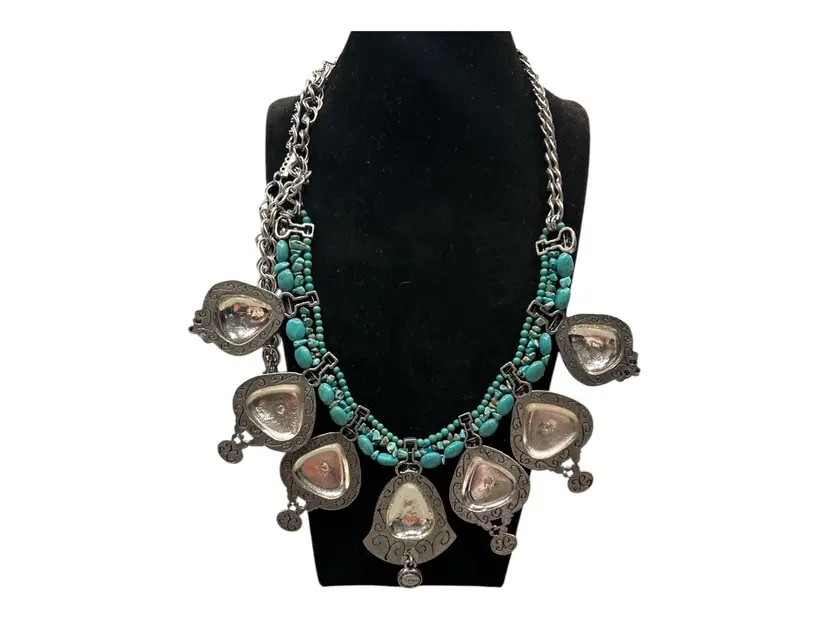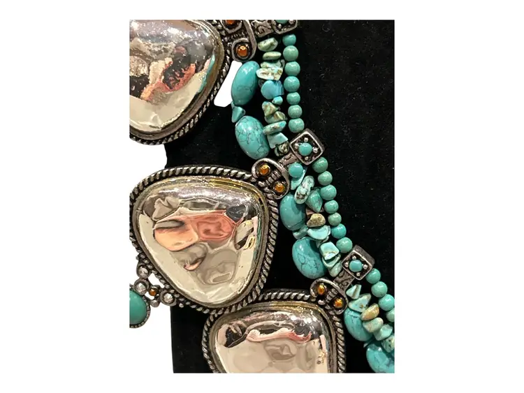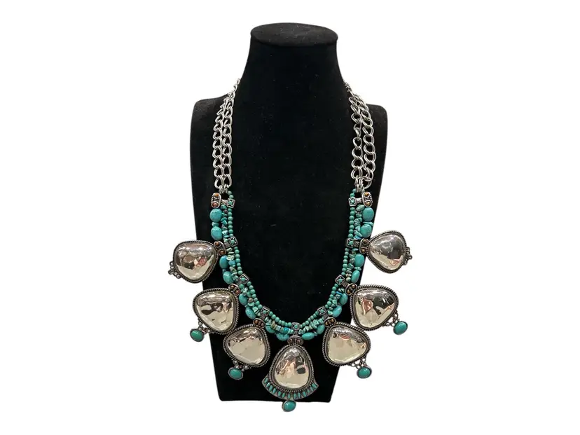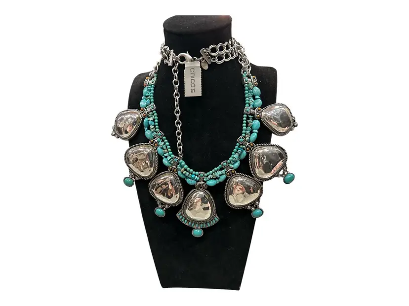 This CHICOS chunky beautiful silver and turquoise color necklace from the 90s is a WOW factor to any outfit. Night or day it’s an amazing statement piece.