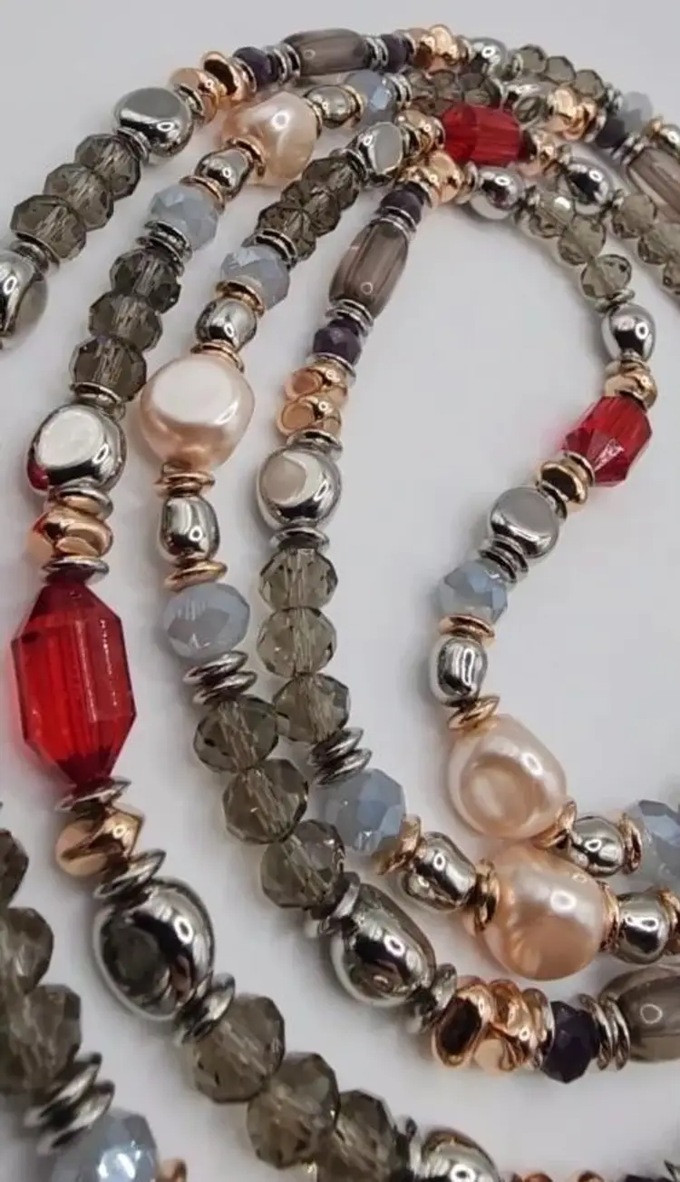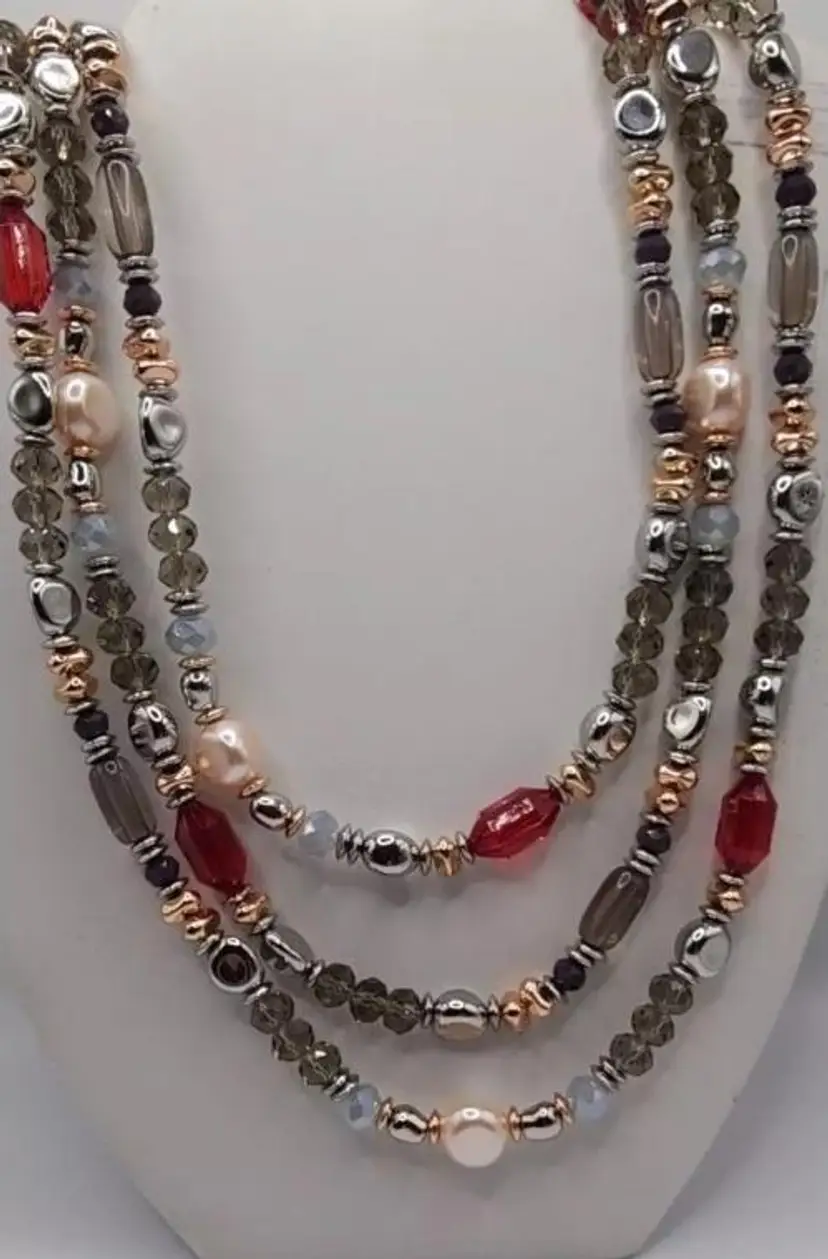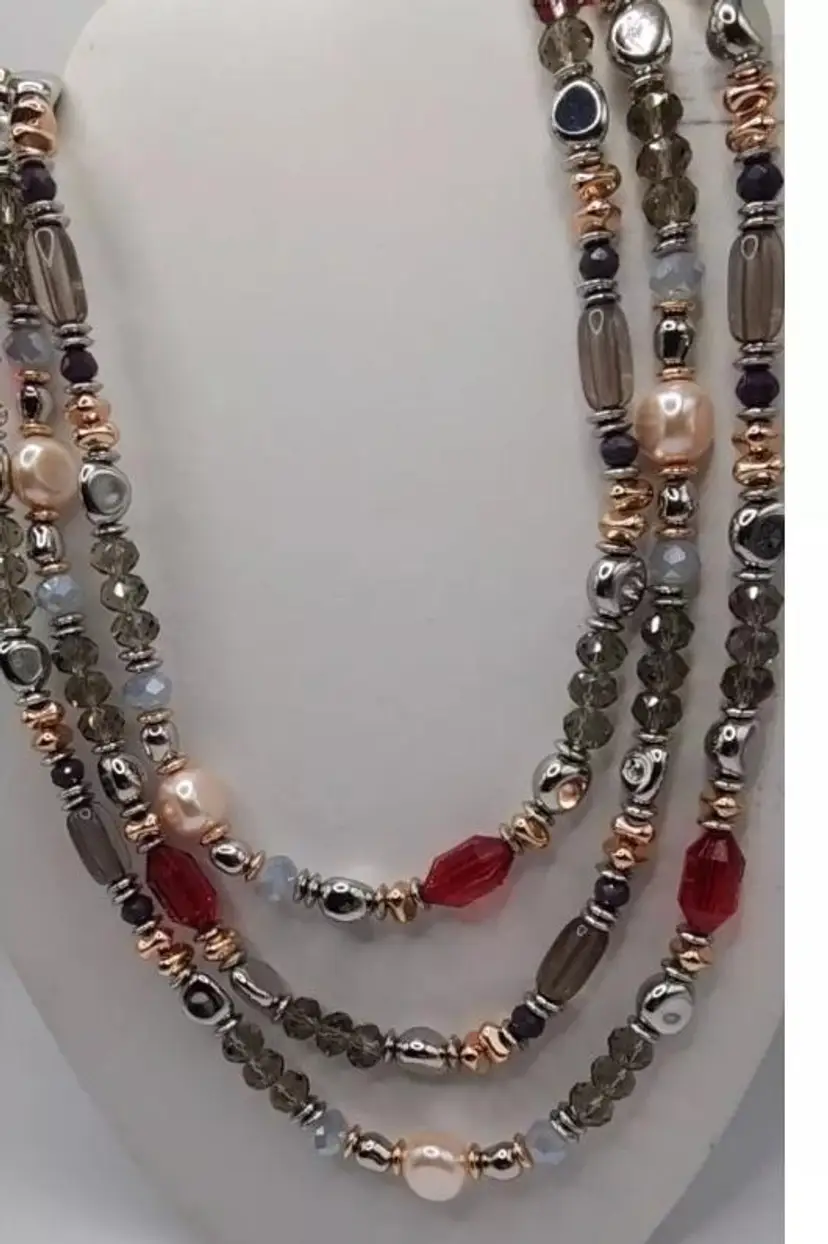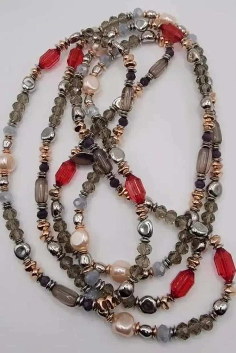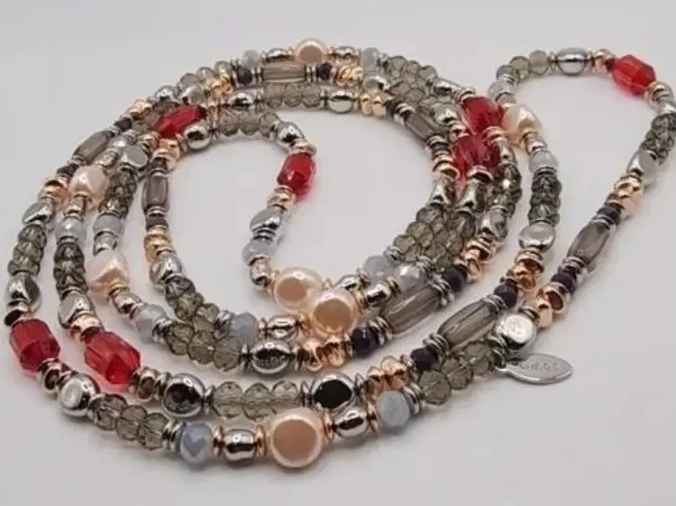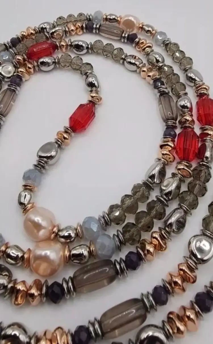 Beautiful Chicos Faux Rose Champagne Pearl's, Clear Gray and Silver Faceted Beads, Silver Nuggets, Rose Gold Nuggets, Red Faceted Beads. The blends of colors is absolutely stunning. There is no clasp on this necklace and it's very long. Stretched out its almost 33".