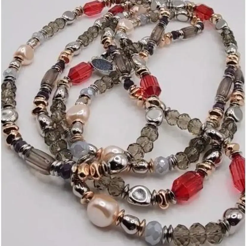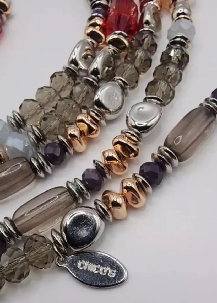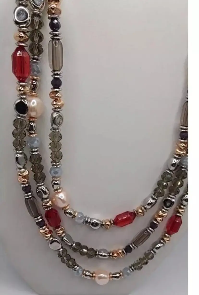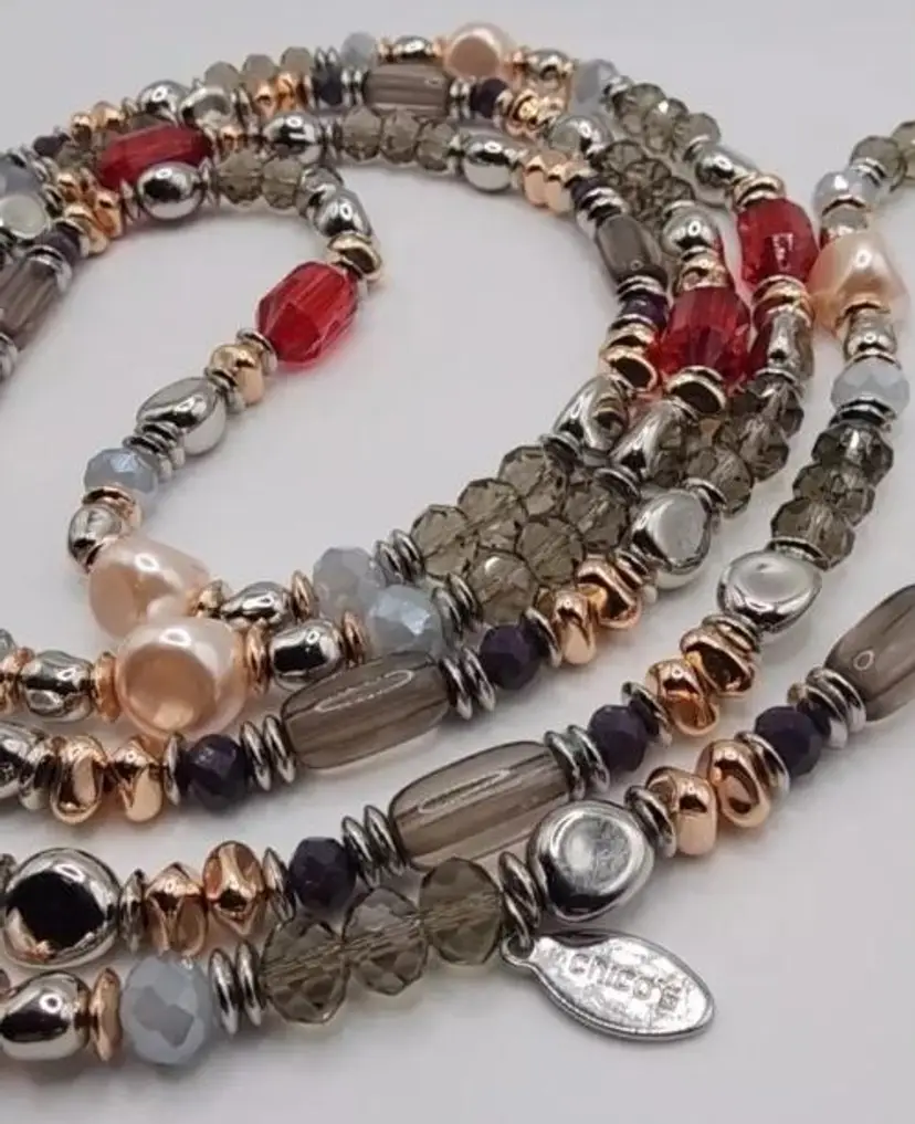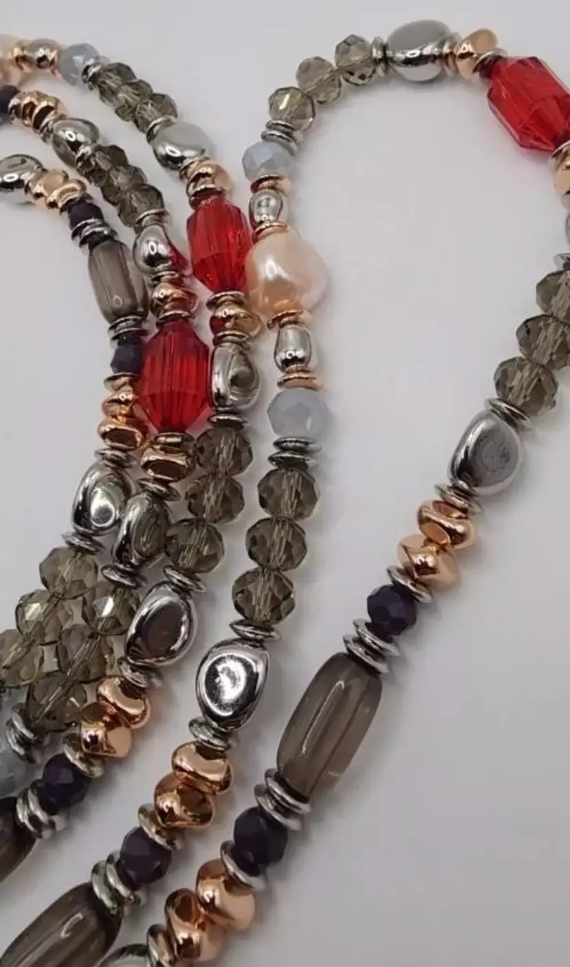 Beautiful Chicos Faux Rose Champagne Pearl's, Clear Gray and Silver Faceted Beads, Silver Nuggets, Rose Gold Nuggets, Red Faceted Beads. The blends of colors is absolutely stunning. There is no clasp on this necklace and it's very long. Stretched out its almost 33".