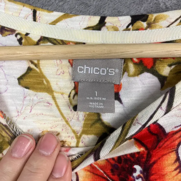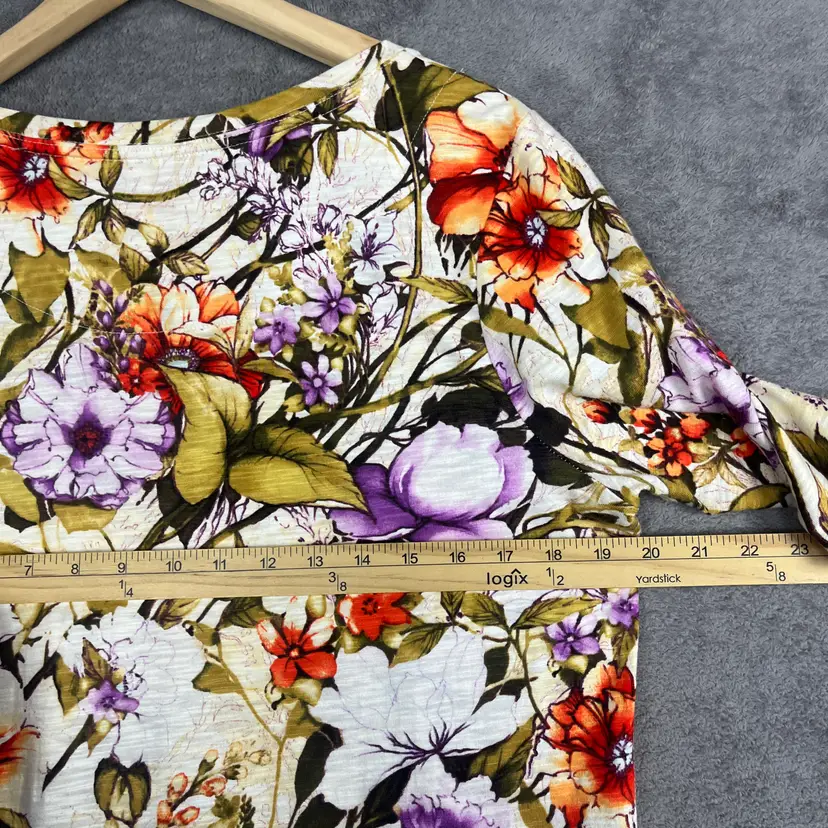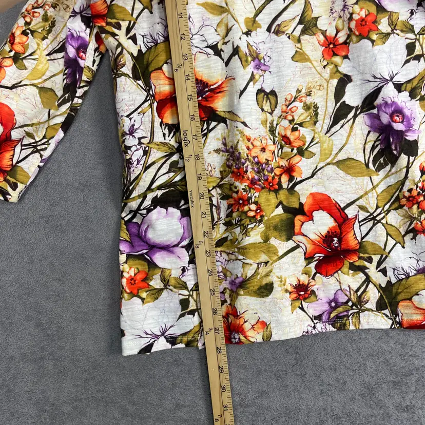 Size: Chico’s 1 (equivalent to Womens Medium) Color: Ivory base with purple, orange, olive, and green floral tones (lighting may cause slight color variation)