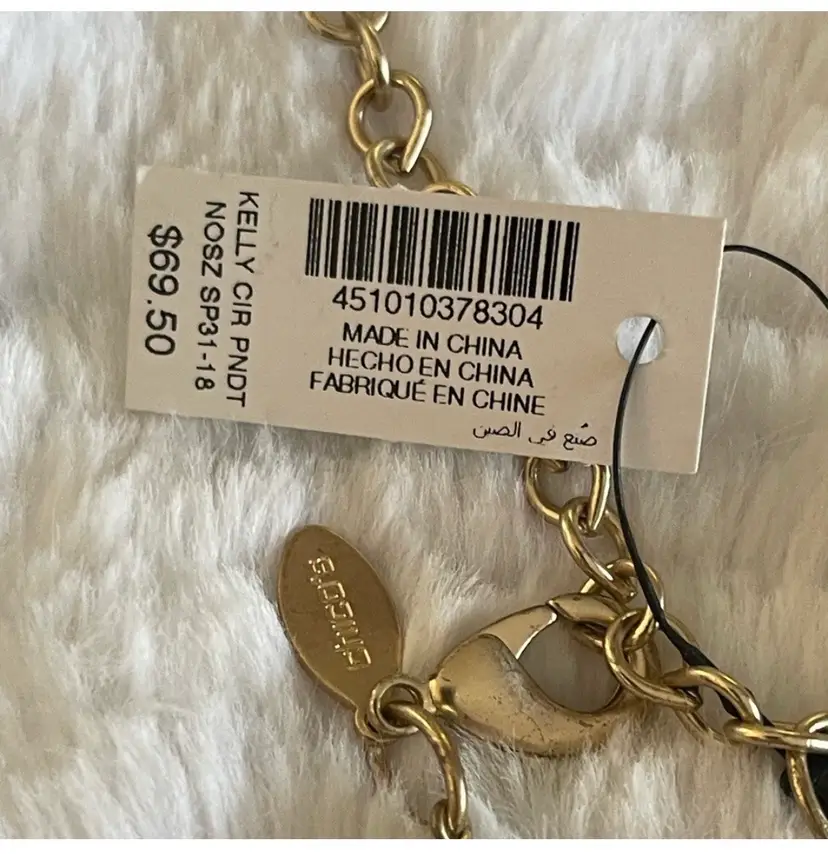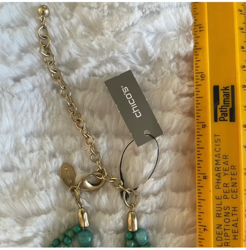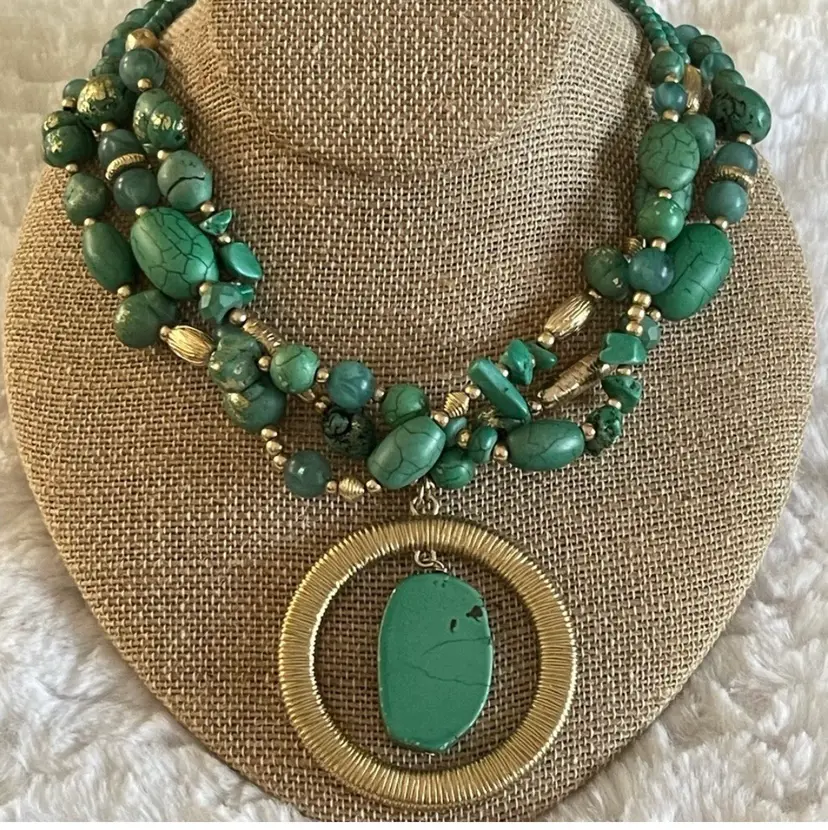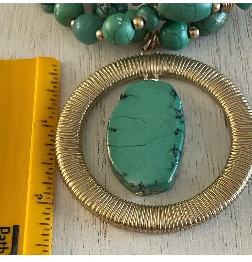 Bold faux (?) turquoise bead necklace with a large 2 1/4” round golden pendant. Approximately 16-22” includes extender. Very slight wear on clasp as shown in pictures.