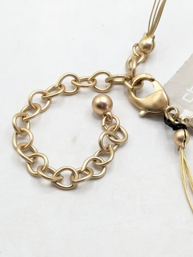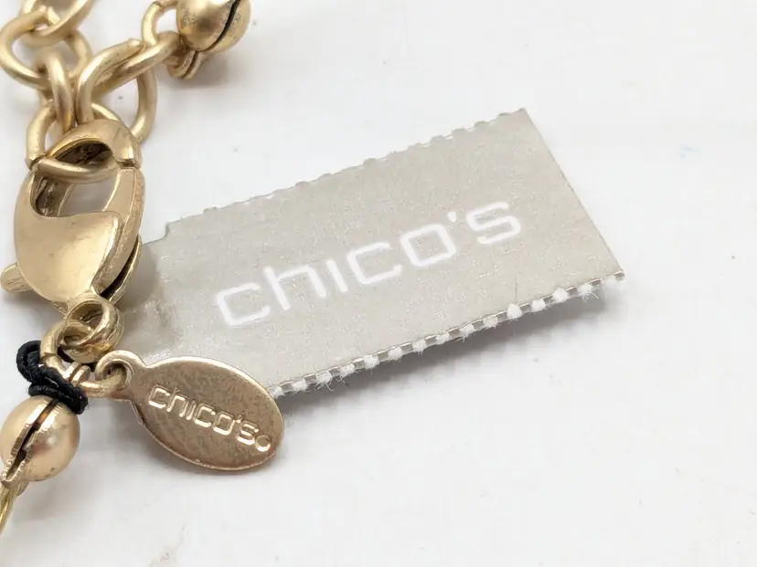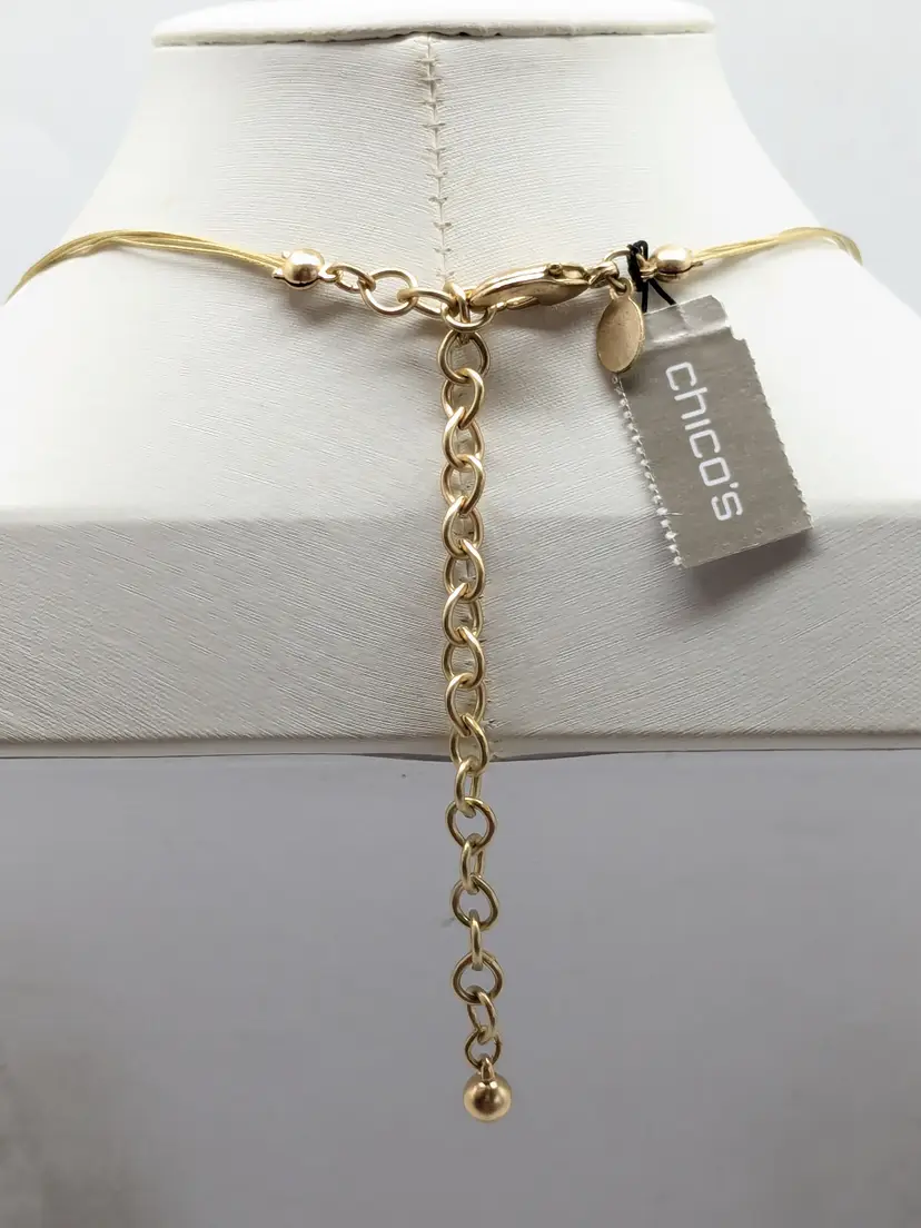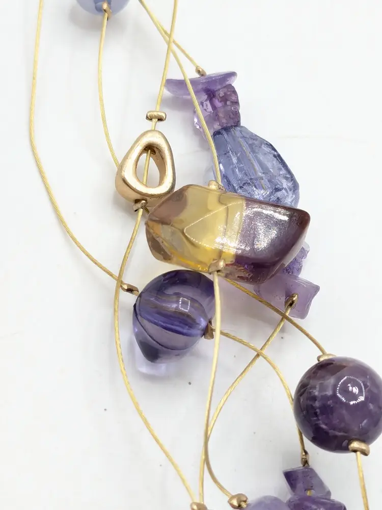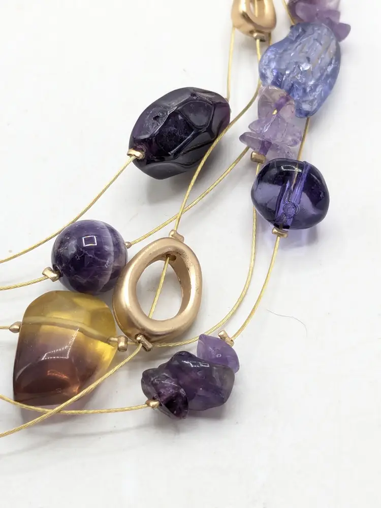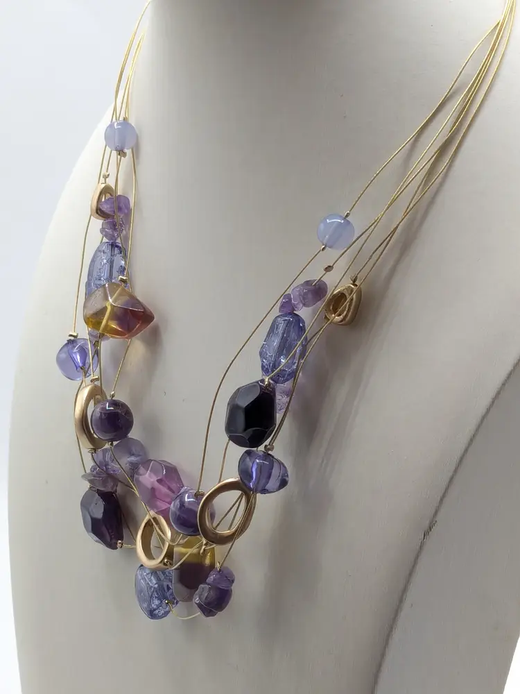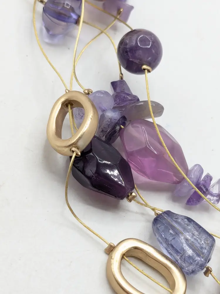 Good condition. New with tags. Five strand necklace. Gold tone with shades of purple acrylic stones. Marked Chico's. Measures 17" with a 4" extension. wen
