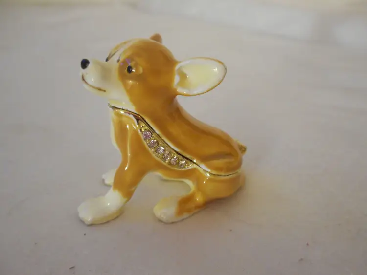 Chihuahua Dog Pewter Enamel Bejeweled Hinged Miniature Trinket Box - Estate Find