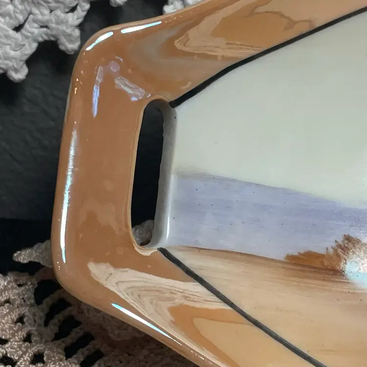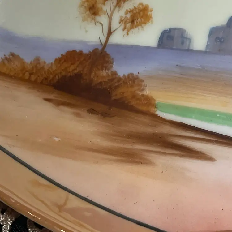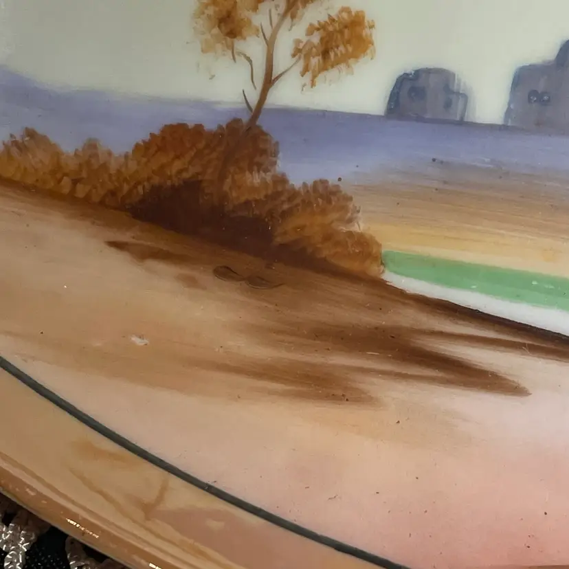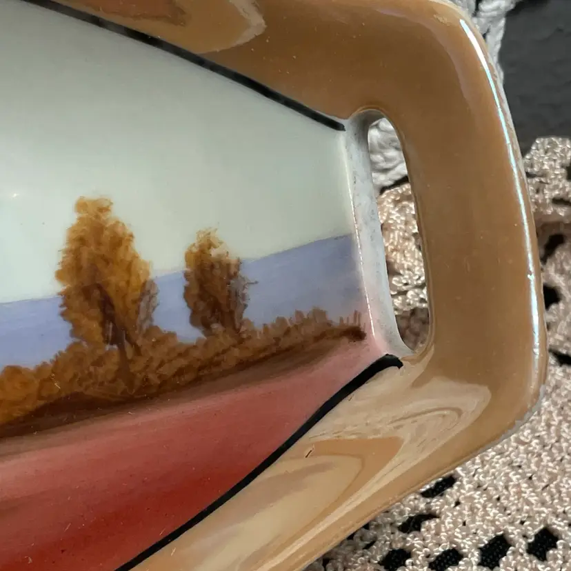 Vintage Chikaramachi hand-painted lusterware oval serving tray, made in Japan. Features a beautiful scenic landscape design with soft earth tones, iridescent luster finish, and built-in side handles.