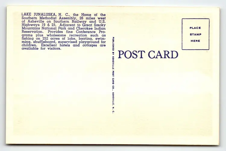 Number of Items in Set: 1 Unit of Sale: Single Unit Artist: Unknown Occasion: Sayings & Quotes Size: Standard (5.5 x 3.5 in) Signed: No Custom Bundle: No Year Manufactured: 1940 Material: Paper City: Lake Junaluska Original/Licensed Reprint: Original Franchise: Does Not Apply Brand/Publisher: Asheville Subject: Buildings Continent: North America Type: Linen Postcard Era: Linen (1930-1945) Region: North Carolina Country: USA Theme: Agriculture, Architecture, Cities & Towns, Community Life, Greetings, Landscapes, Roadside America, Social History, Buildings Features: Divided Back Time Period Manufactured: 1950-1959 Country/Region of Manufacture: United States Postage Condition: Unposted