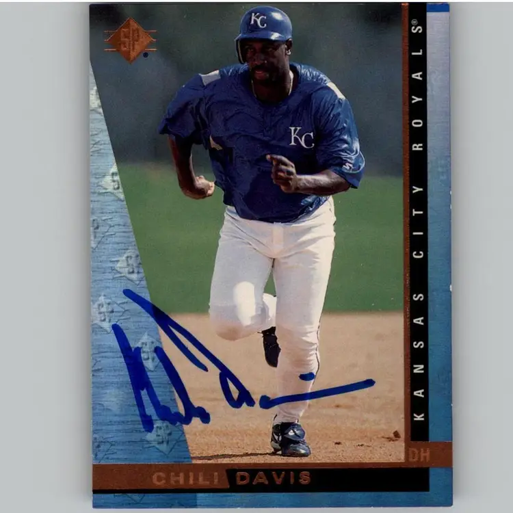 Authentic Upper Deck SP baseball card featuring Chili Davis of the Kansas City Royals, adorned with his signature in blue ink. A prized collectible for Royals fans and autograph seekers. Your purchase supports Signatures For Soldiers in helping homeless and disabled veterans.