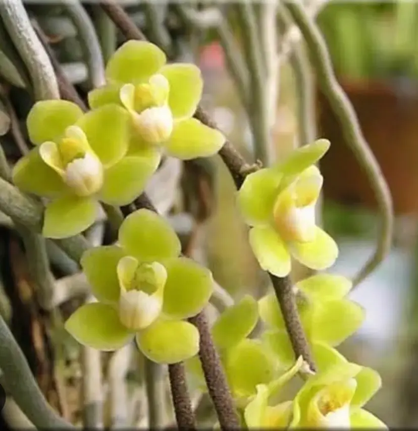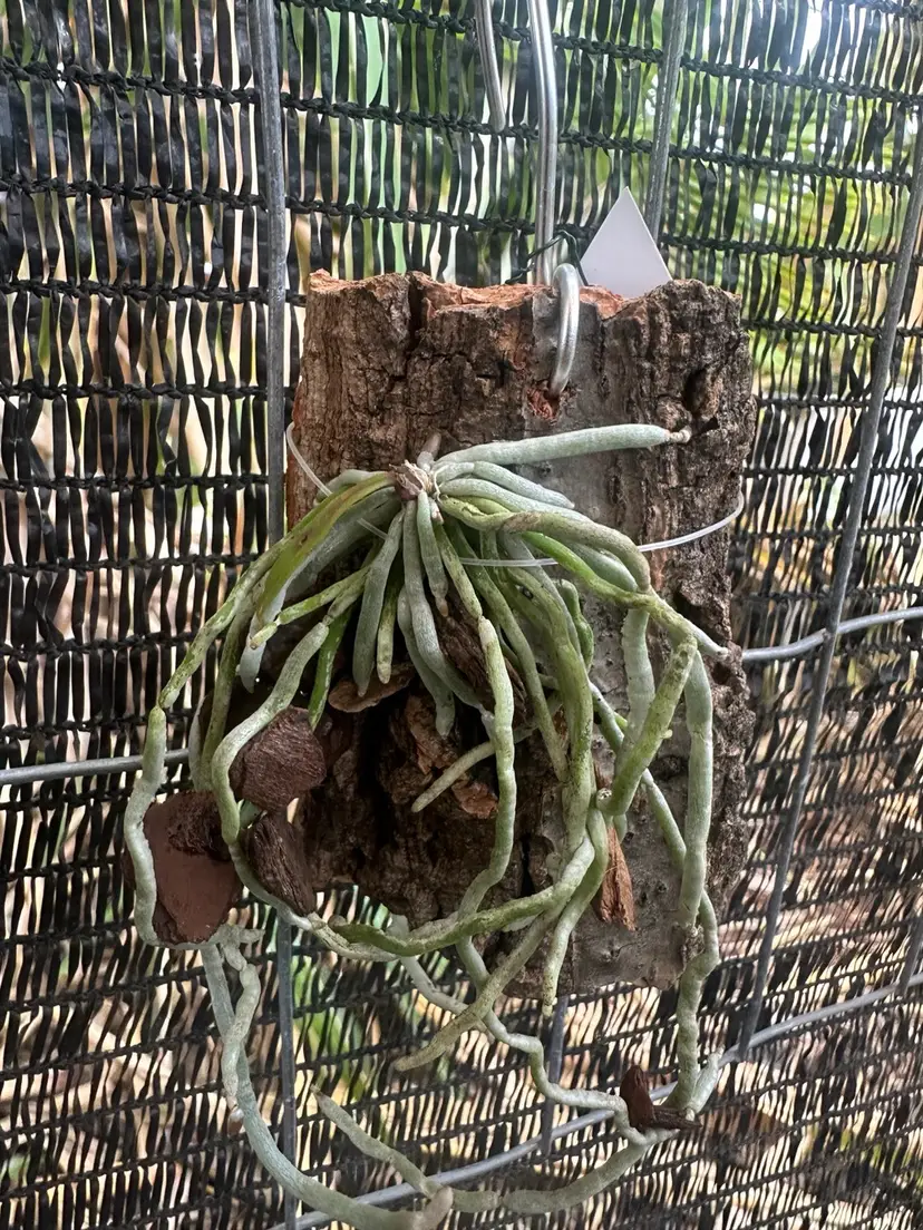 This is a fascinating genus of mostly leafless orchids. They photosynthesize through the roots. Orchid mounted on cork bark. Plant may or may not be actively blooming. Actual plant in second photo.