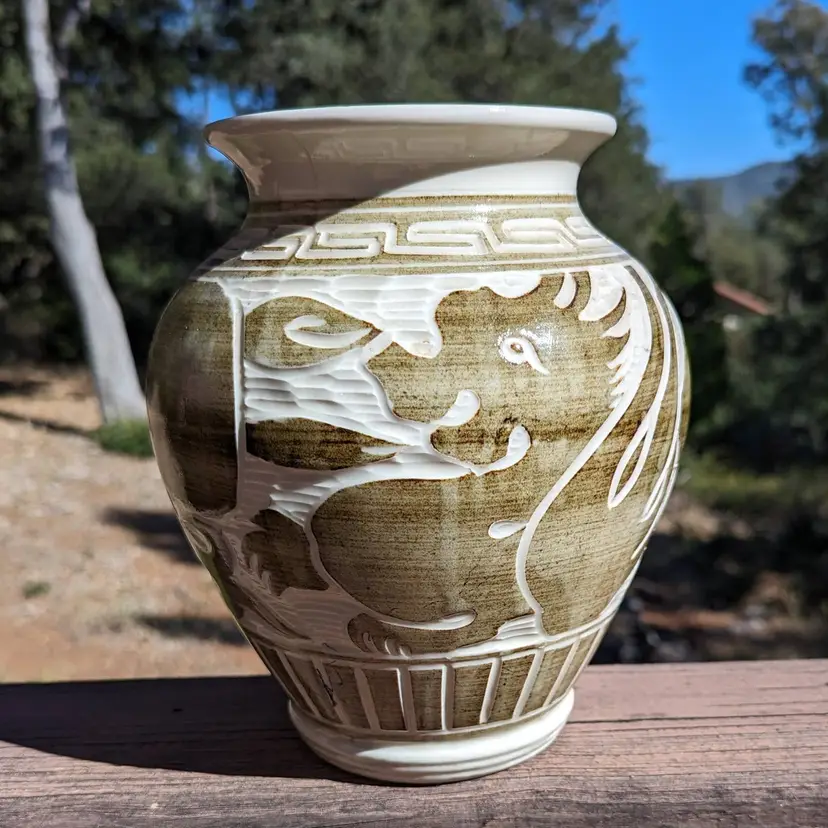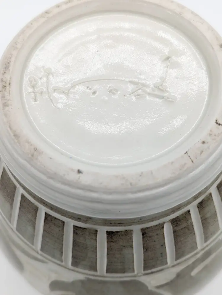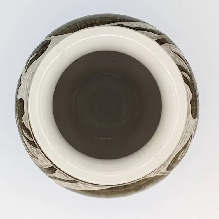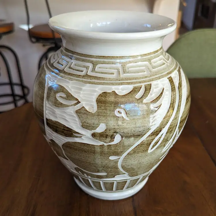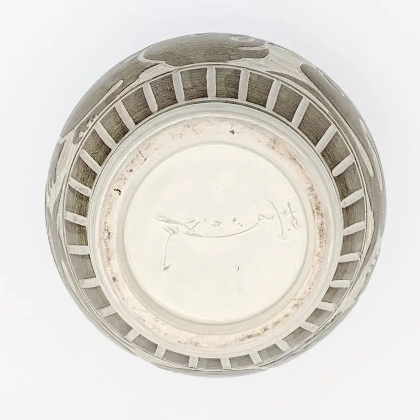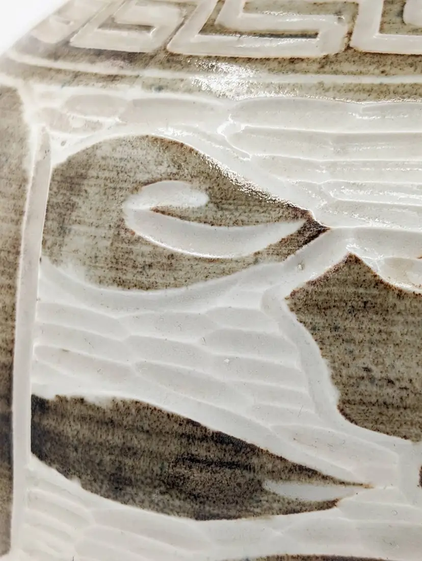 This charming piece of pottery is fully glazed on the bottom and has an artist signature, which is why I feel it is only inspired by the older Song Dynasty Cizhou jars and vases. The composition of the forms is very artfully done with what appears to be alternating dragons and mermaids.