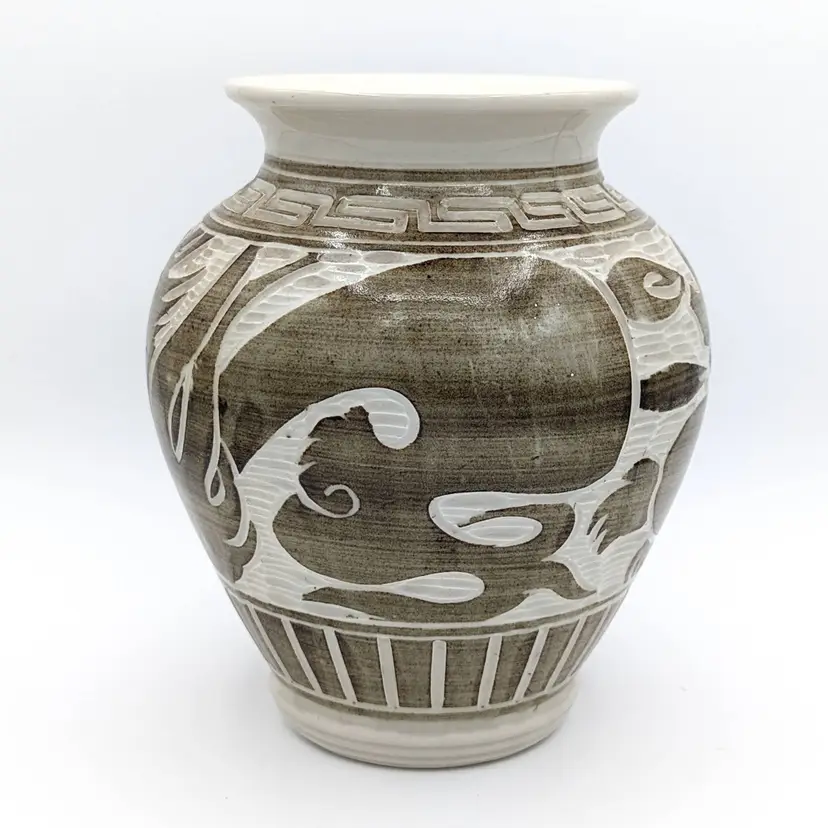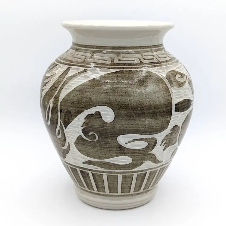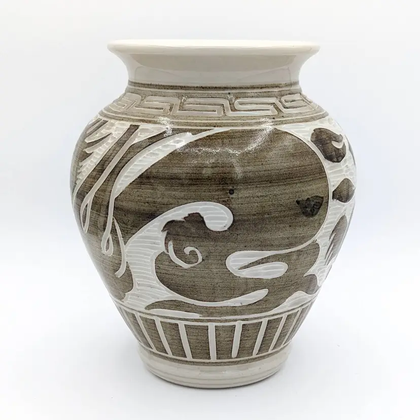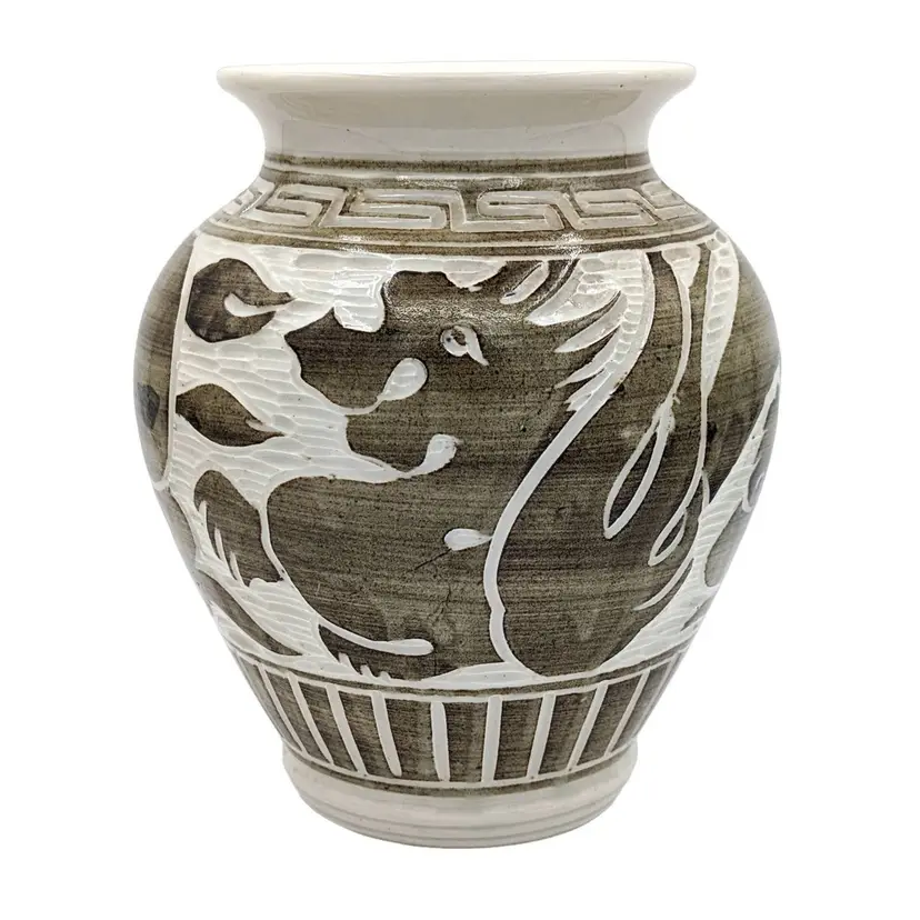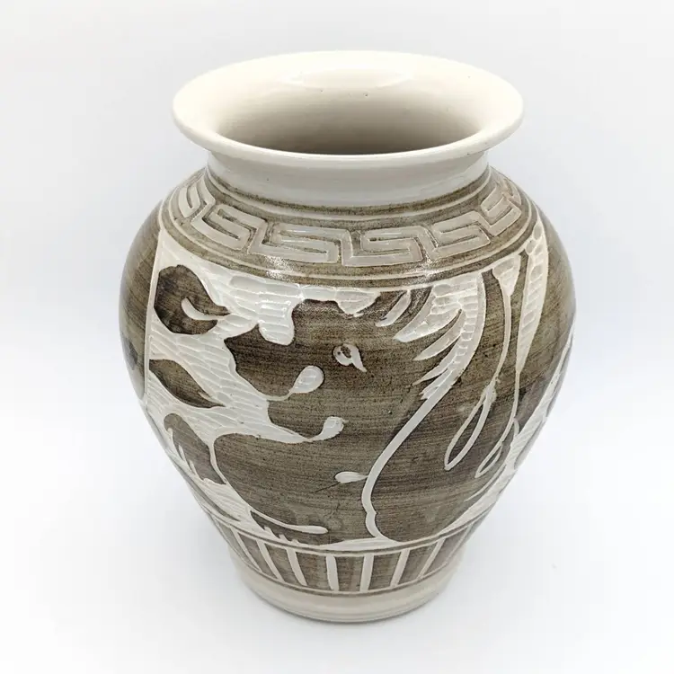 Chinese Cizhou Style Studio Pottery Vase Crock Pot Jar w Mermaid Dragon Loong Xiang Yun Artist Signed