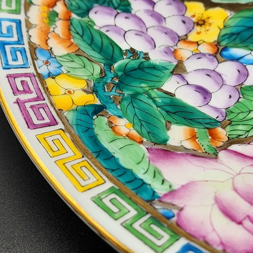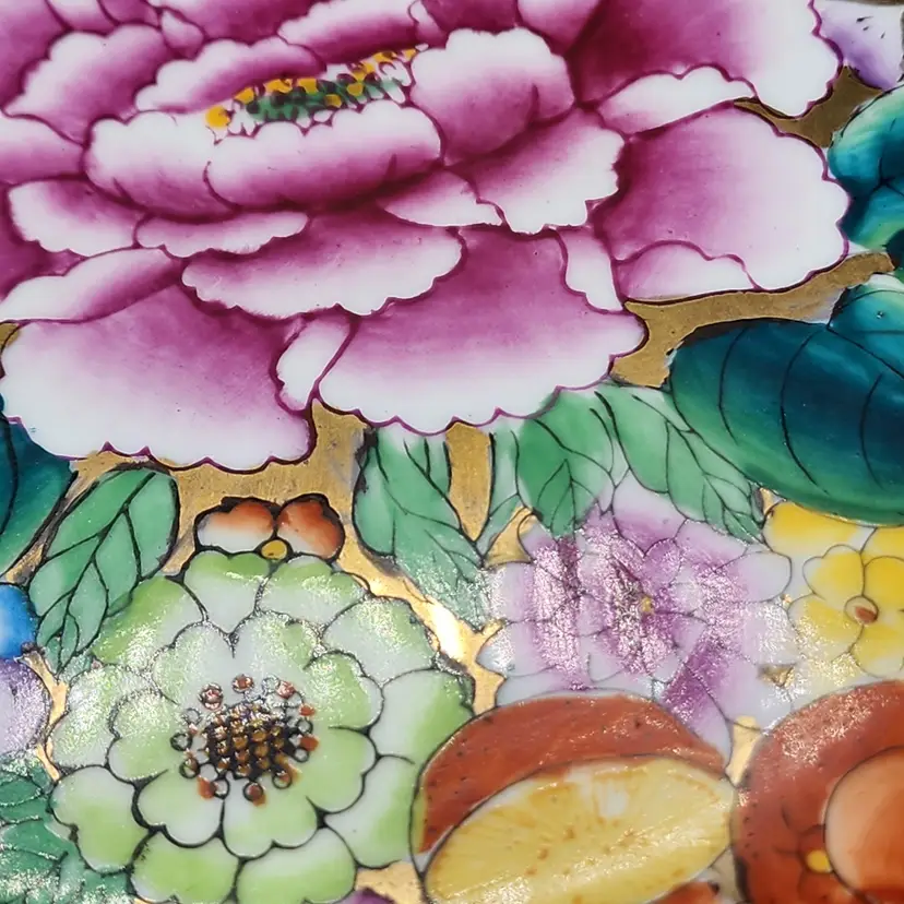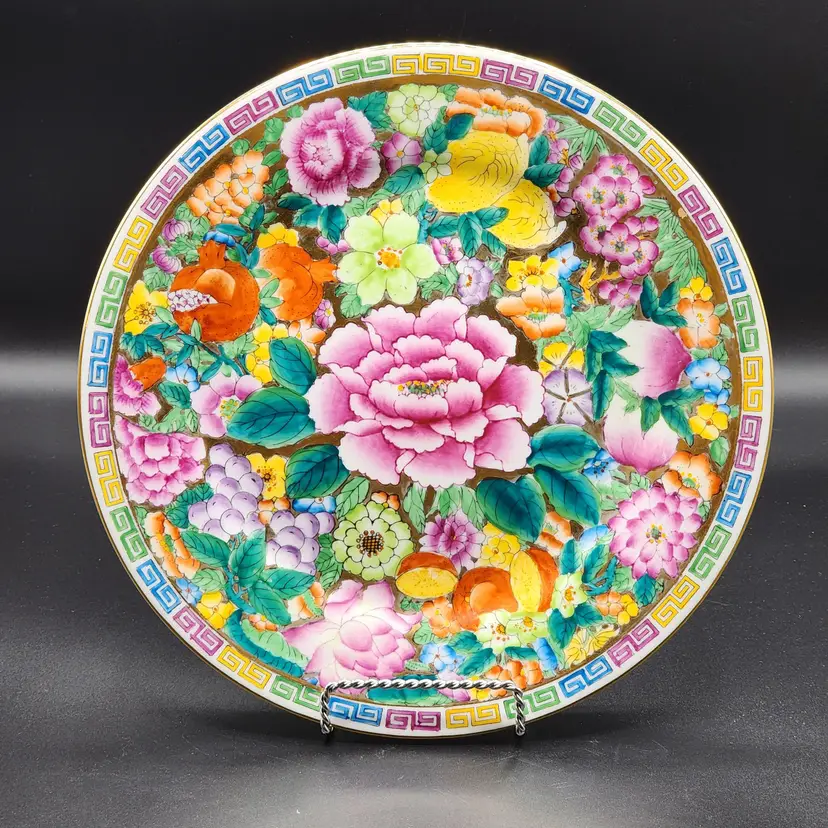 Chinese Classic Hundreds of Flowers Mille Fleur Gold Gild Porcelain Plate Chinese classic 'Hundreds of Flowers' Pattern, in beautifully bright colors and gilded in gold with a Greek key edge. Iron-red mark, Zhong Guo Chao Cai; excellent condition. Size: 10 in Dia.
