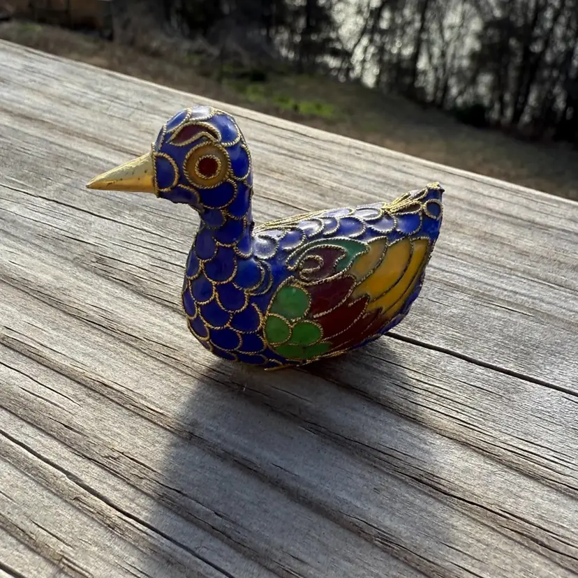 Chinese metalwork duck with intricate goldtone wirework and handapplied multicolor enamels.