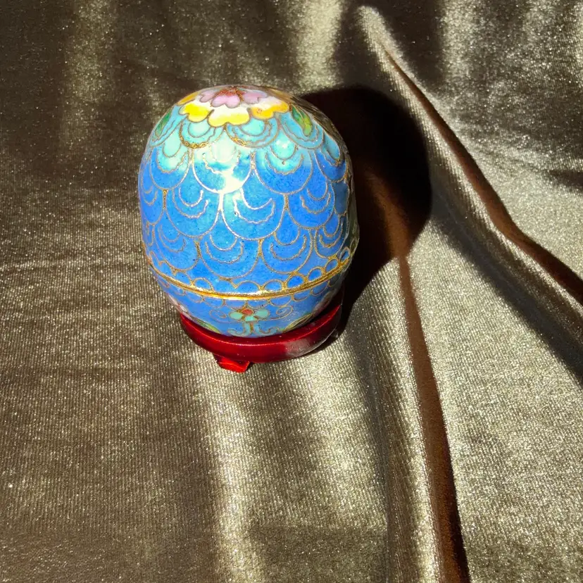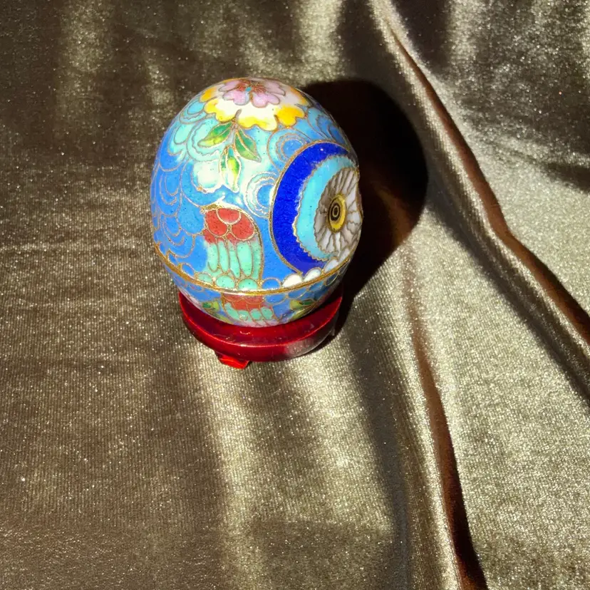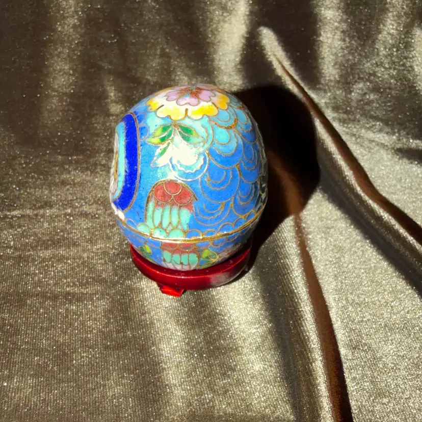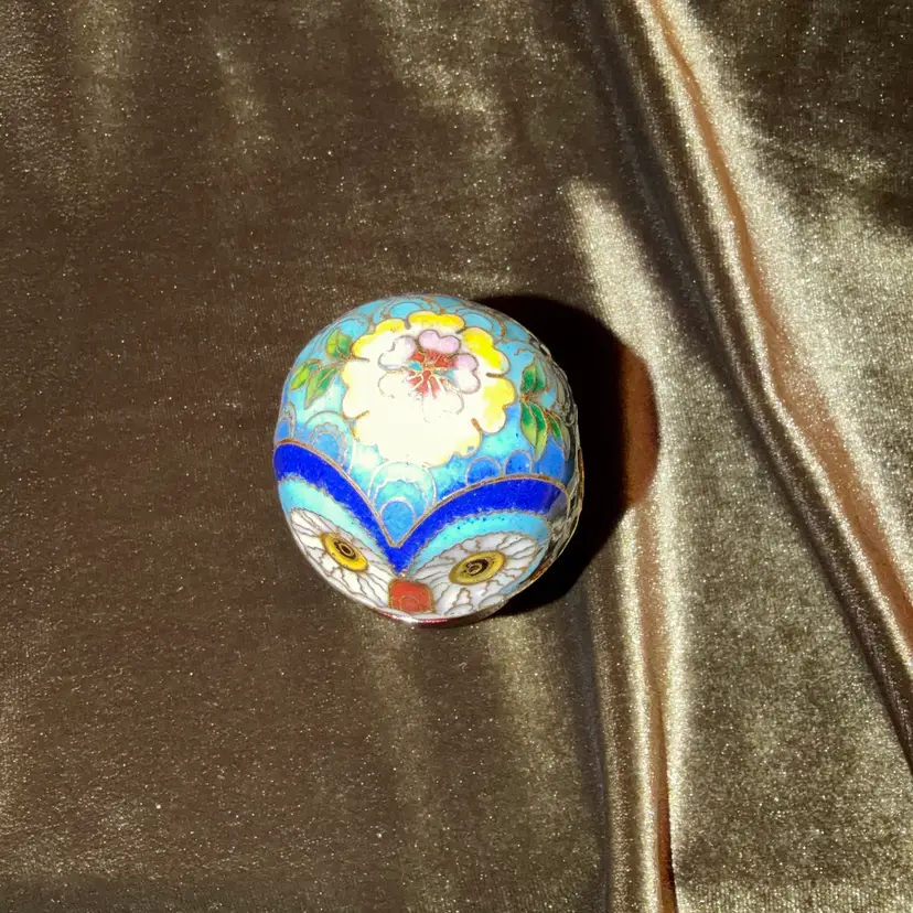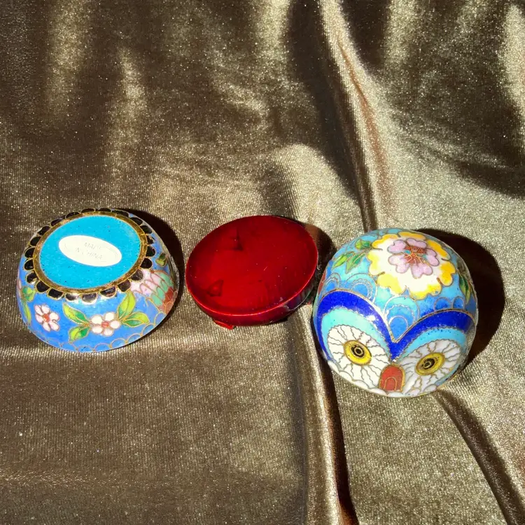 A charming vintage Chinese cloisonné owl, intricately decorated with colorful enamel patterns and gold-toned wire outlines, likely functioning as a small trinket or pill box.
