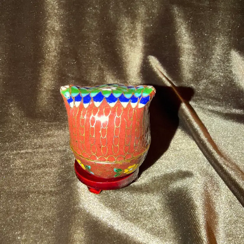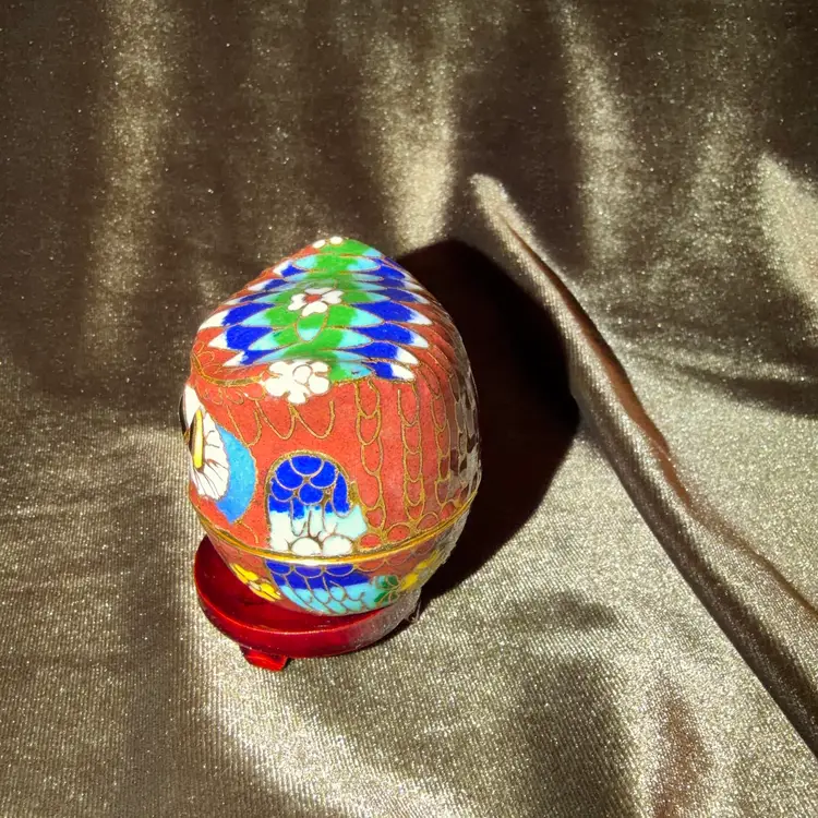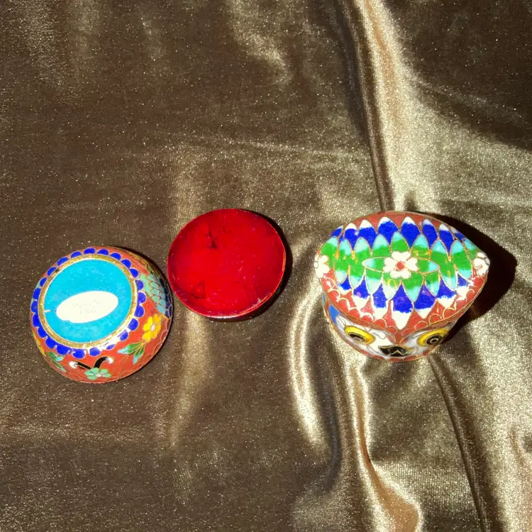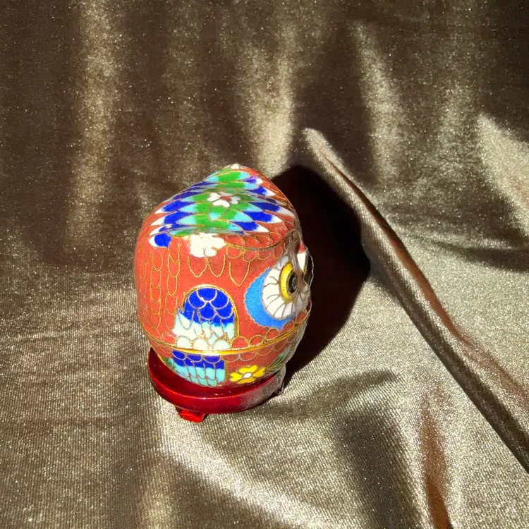 A charming vintage Chinese cloisonné owl, intricately decorated with colorful enamel patterns and gold-toned wire outlines, likely functioning as a small trinket or pill box.