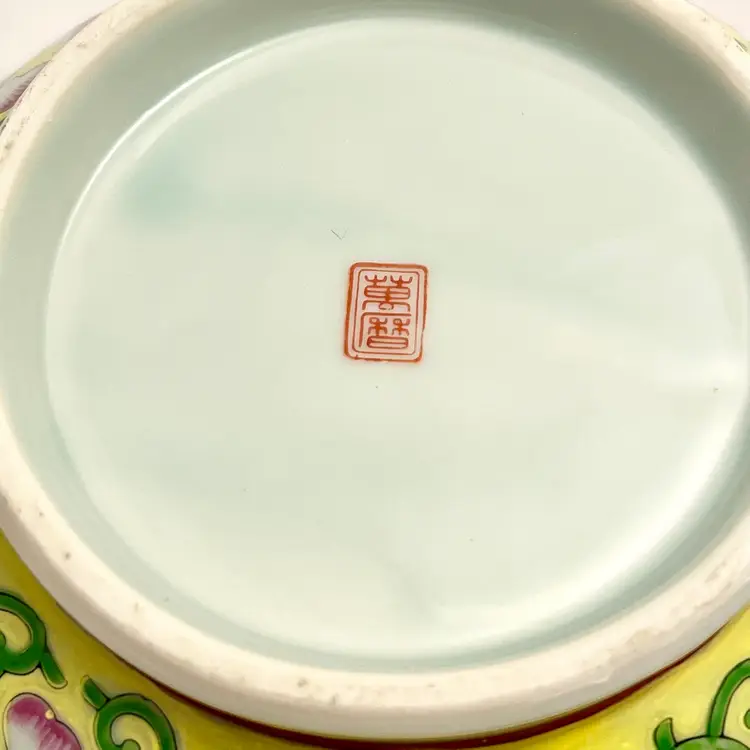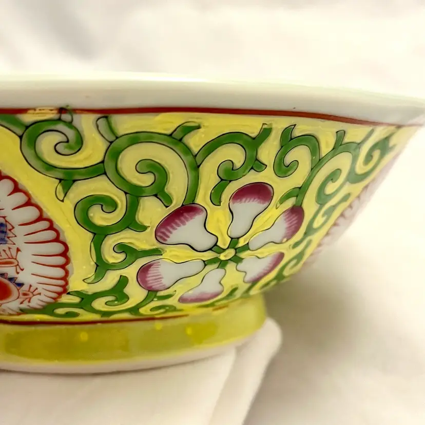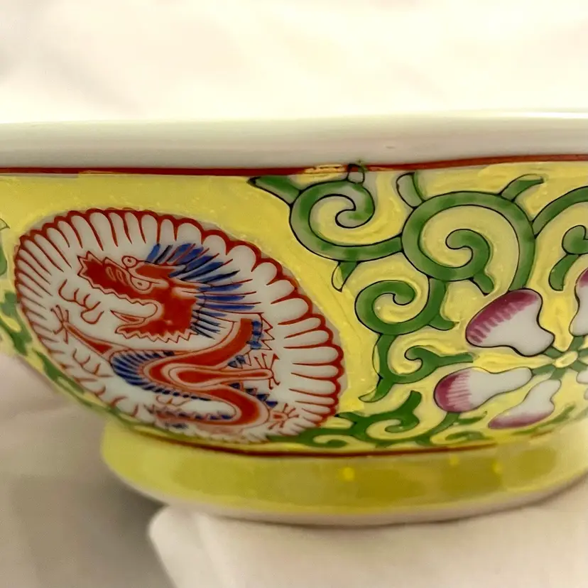Beautiful yellow and pink Chinese bowl. Features dragon floral design. Color is very vivid. In perfect condition, with no chips, cracks, scratches, fleabites, or other visible damage