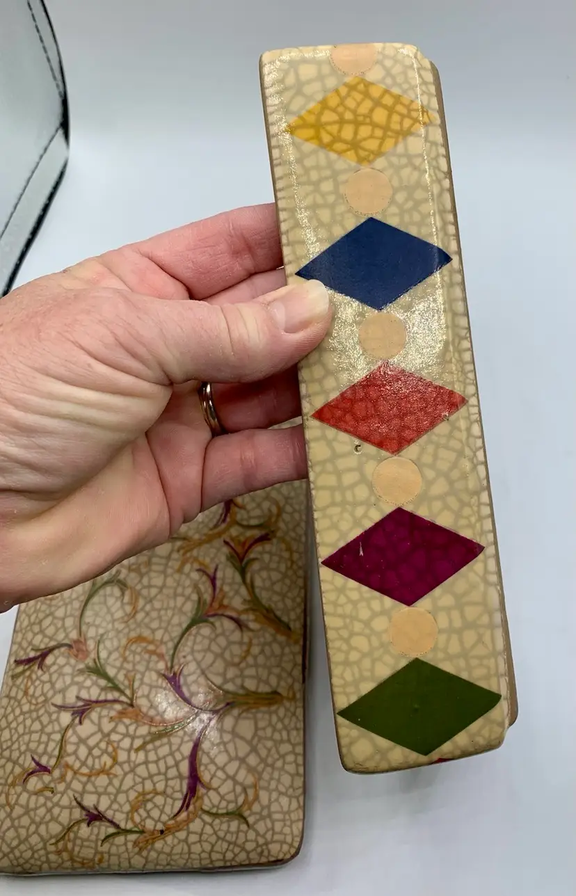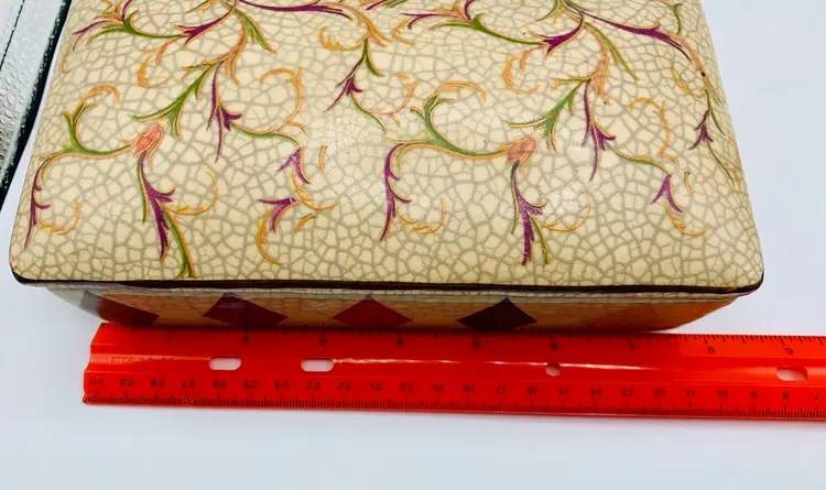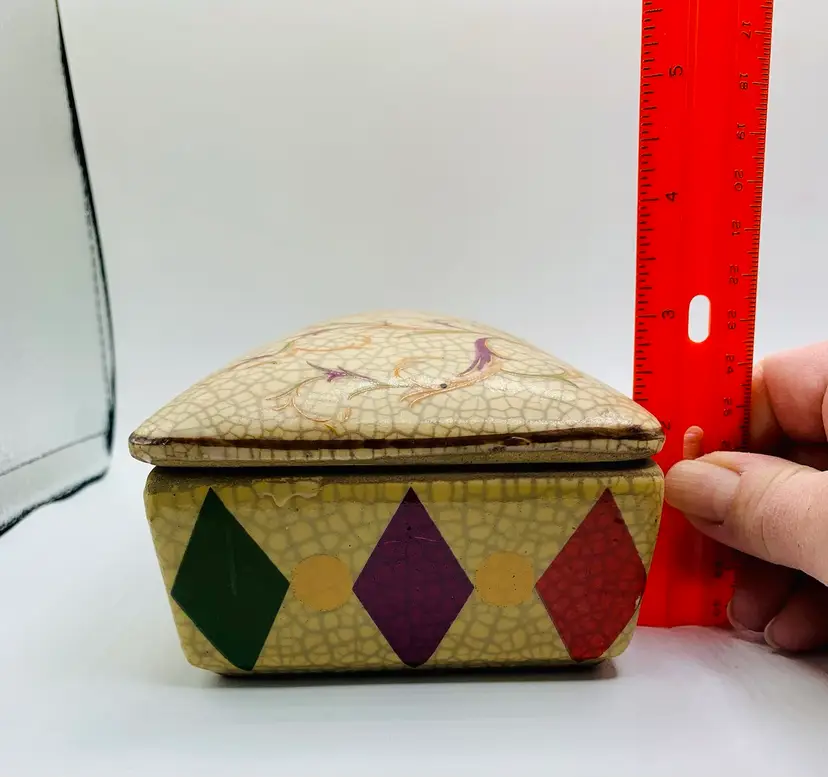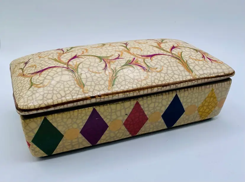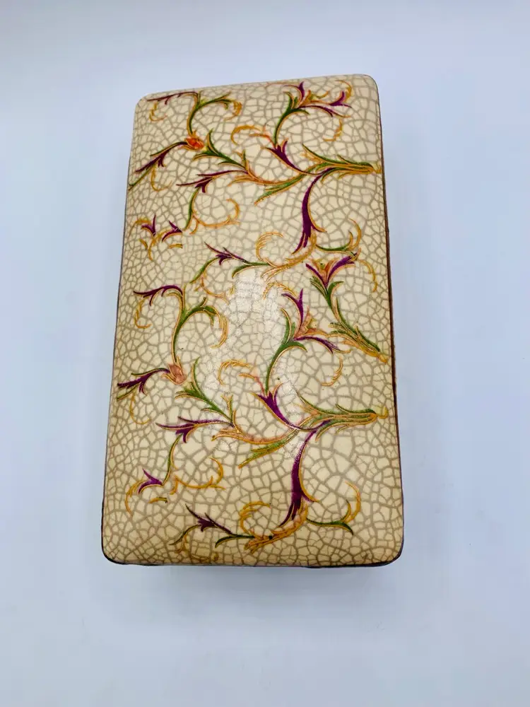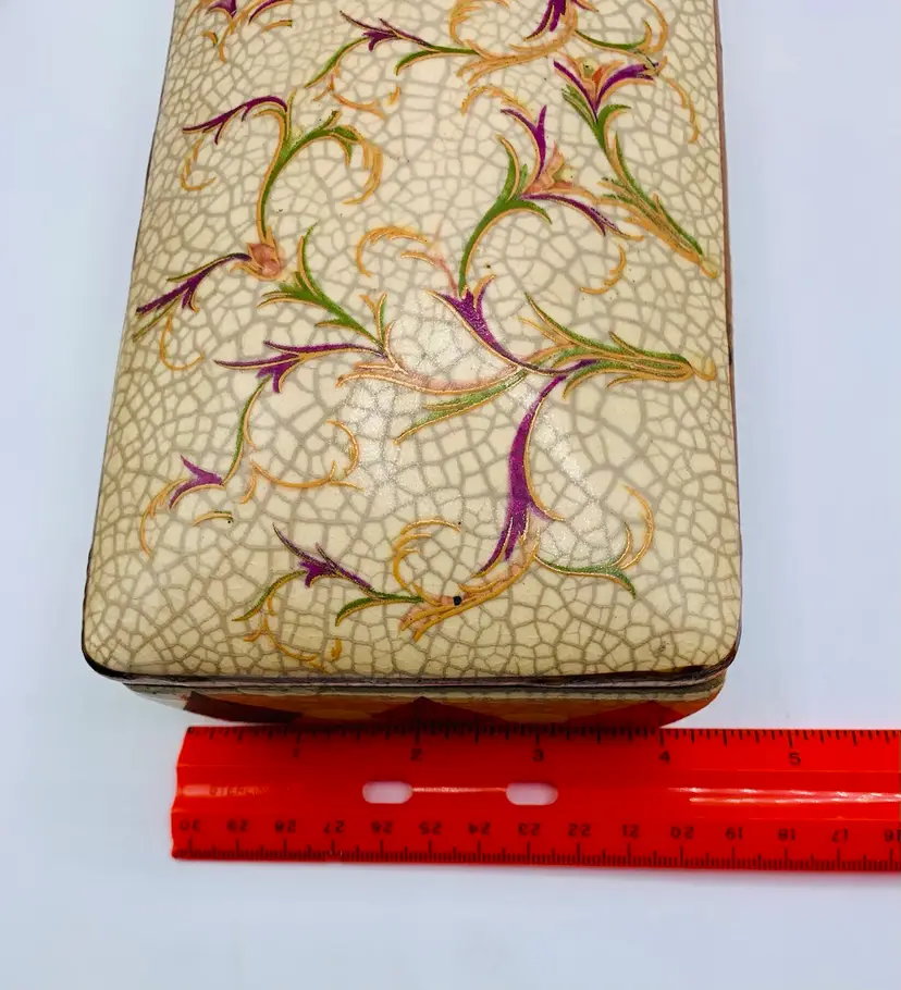 This Chinese Ge Ware Style Trinket Box features a rectangular shape with a crackle glaze finish, giving it a vintage and unique look. The piece is adorned with floral and diamond patterns, making it a stylish addition to any room. It is medium in size, measuring 8” in length, 4” in width, and 3” in height, and is unboxed, making it a standalone piece.