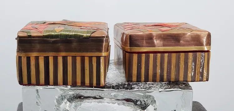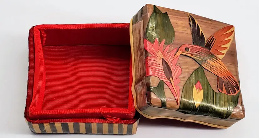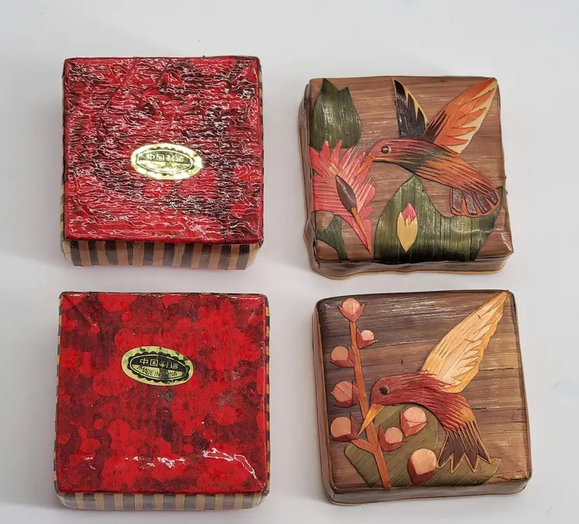 Two lovely, vintage, hand made hummingbird trinket boxes . Made in China, these trinket boxes are made from bamboo and straw. They are lined with a red material for a nicely finished look.