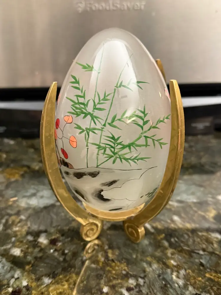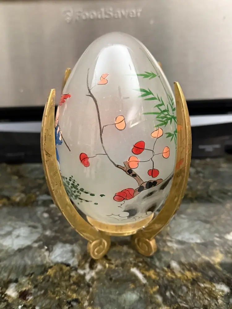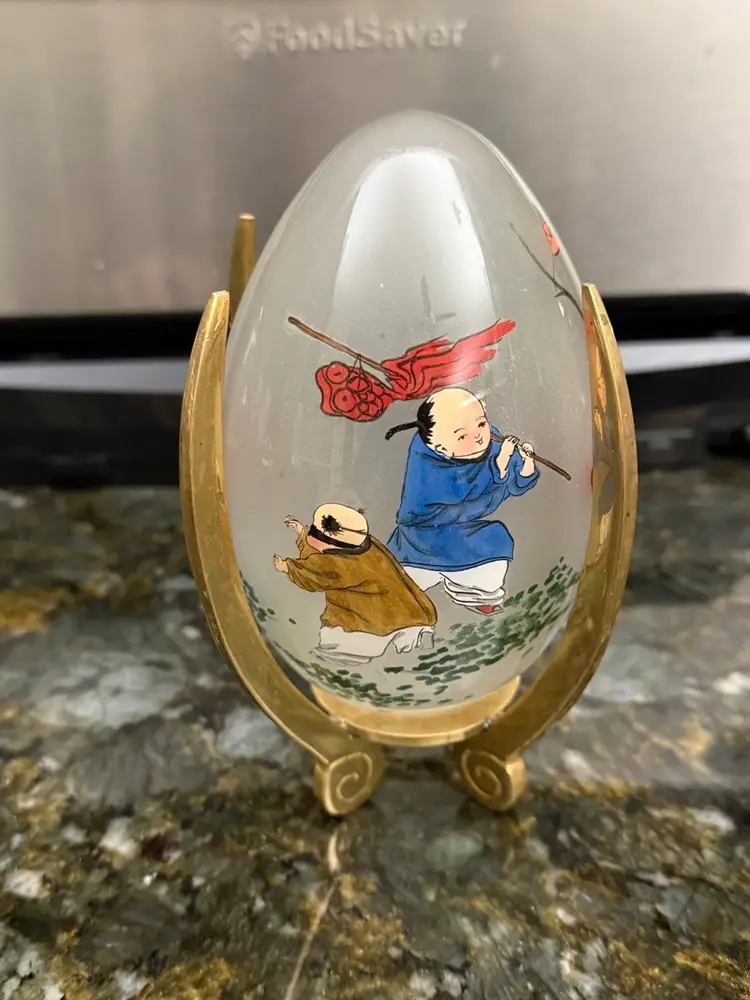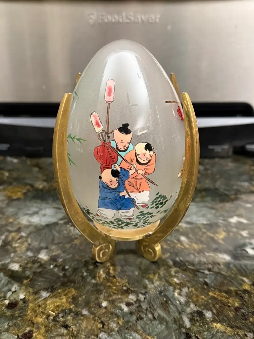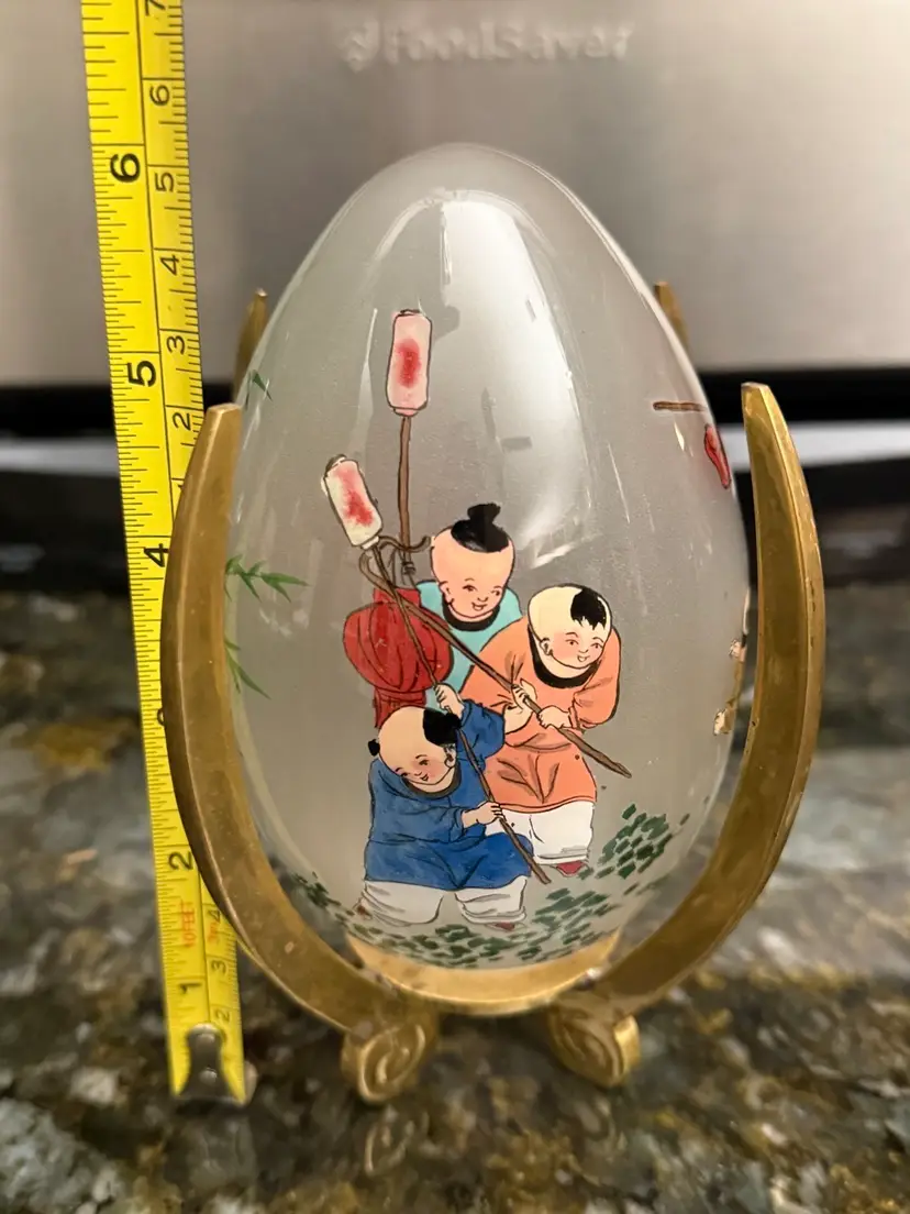 This exquisite Chinese inner painted glass egg depicts a charming scene of children playing. Crafted in China, this egg is a perfect addition to any collection of Asian collectibles. The attention to detail and the intricate design make this egg a unique piece that will surely be treasured for years to come. It measures 5” tall and 3.5” at the thickest part of the egg. It is in good used condition without chips or cracks. Please examine all photos as part of the description.