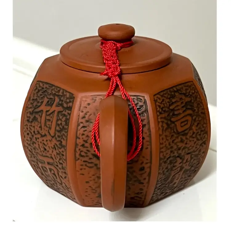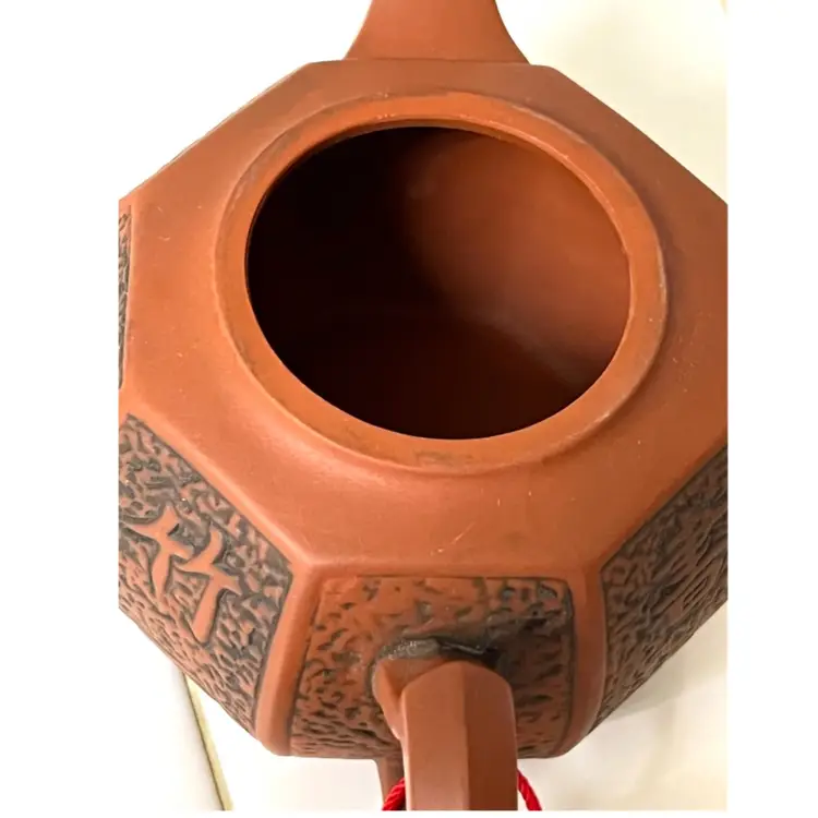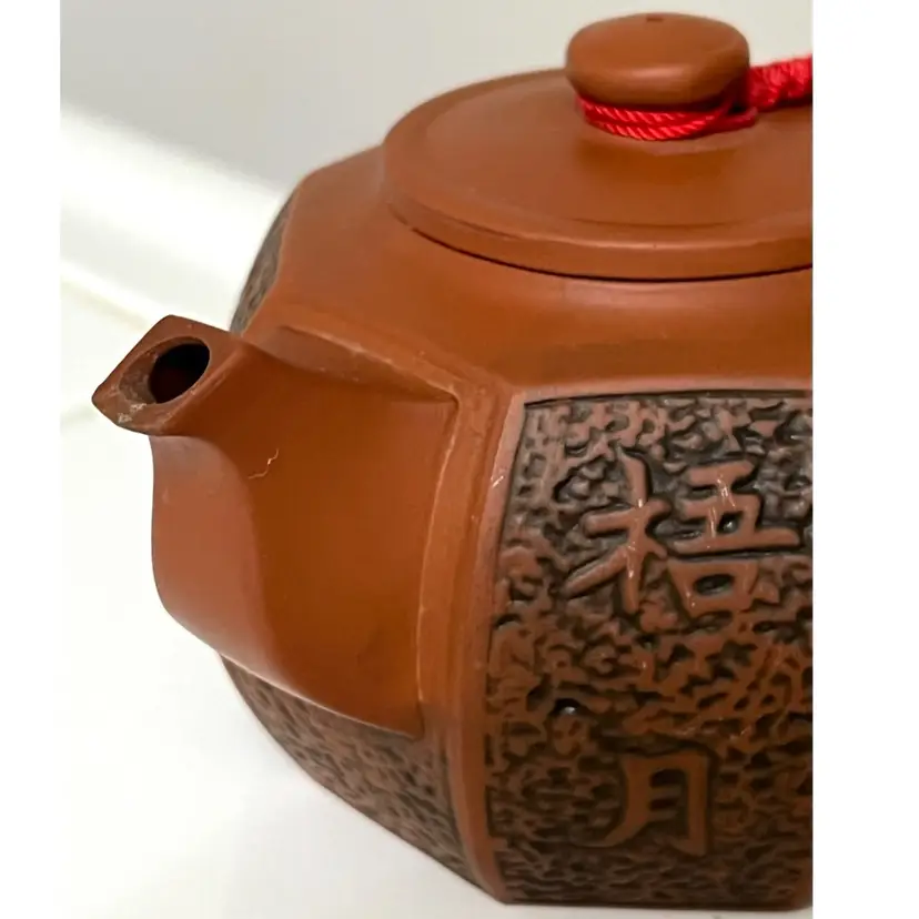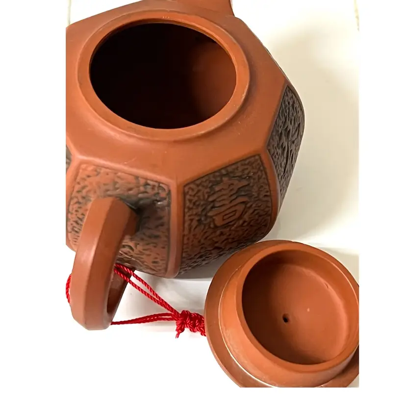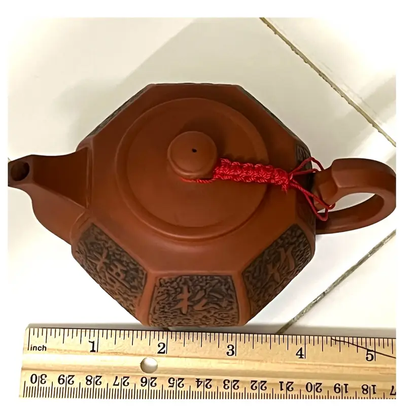 Chinese Terracotta Clay Brown Small Teapot With Red Ribbon 5x3x3.5 in. No chips/cracks.