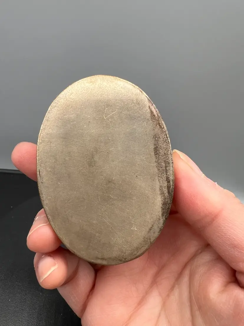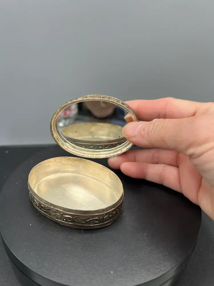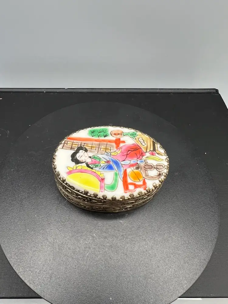 Small Oval Chinoiserie Painted Ceramic and Metal Trinket Box with Mirror Lid.