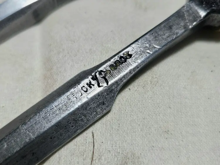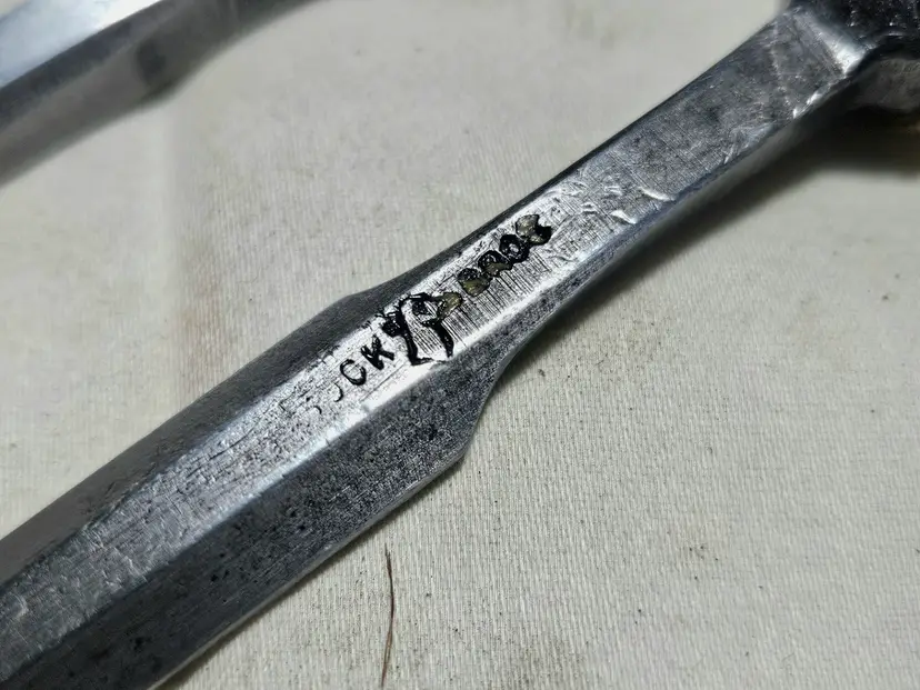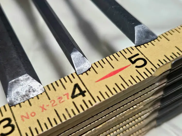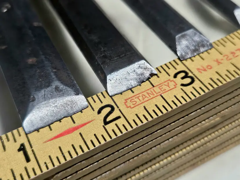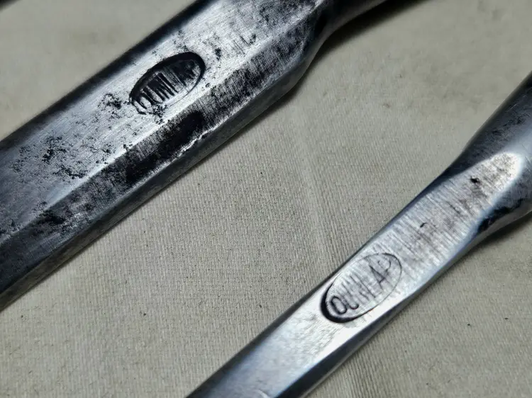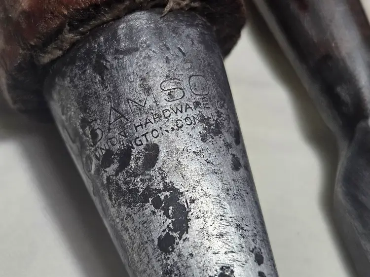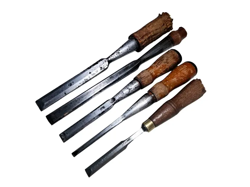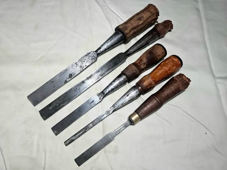 (5) chisels in total covering a wide range of sizes. Sizes include 3/4", 5/8", 1/2", 3/8" and 1/4". (2) marked Dunlap - Germany, (1) marked Buck Bros., (1) marked Samson Union Hardware and (1) no visible maker's mark. All in need of a good sharpening, handled and a 2nd life.