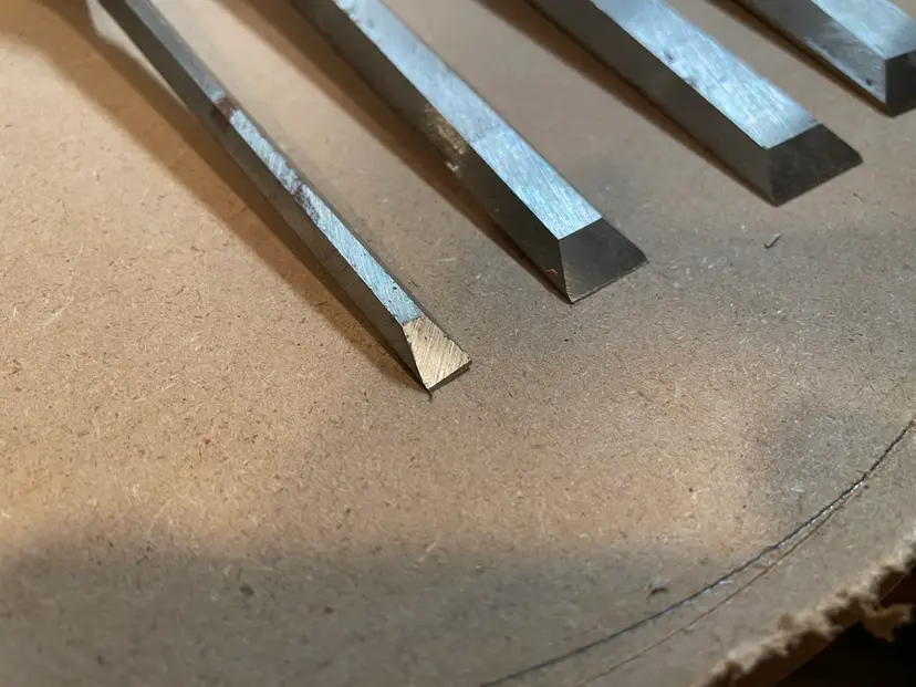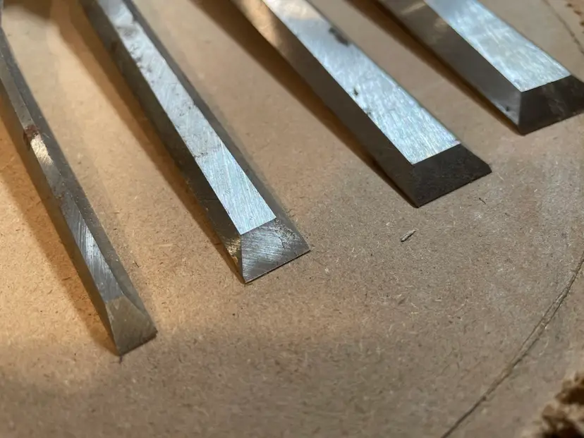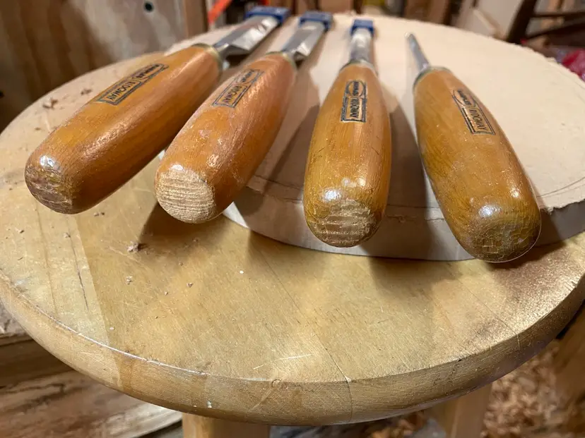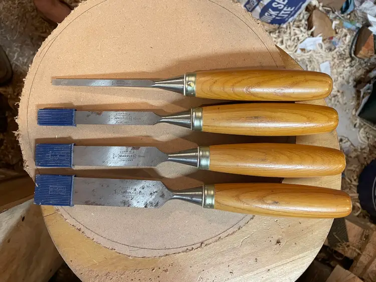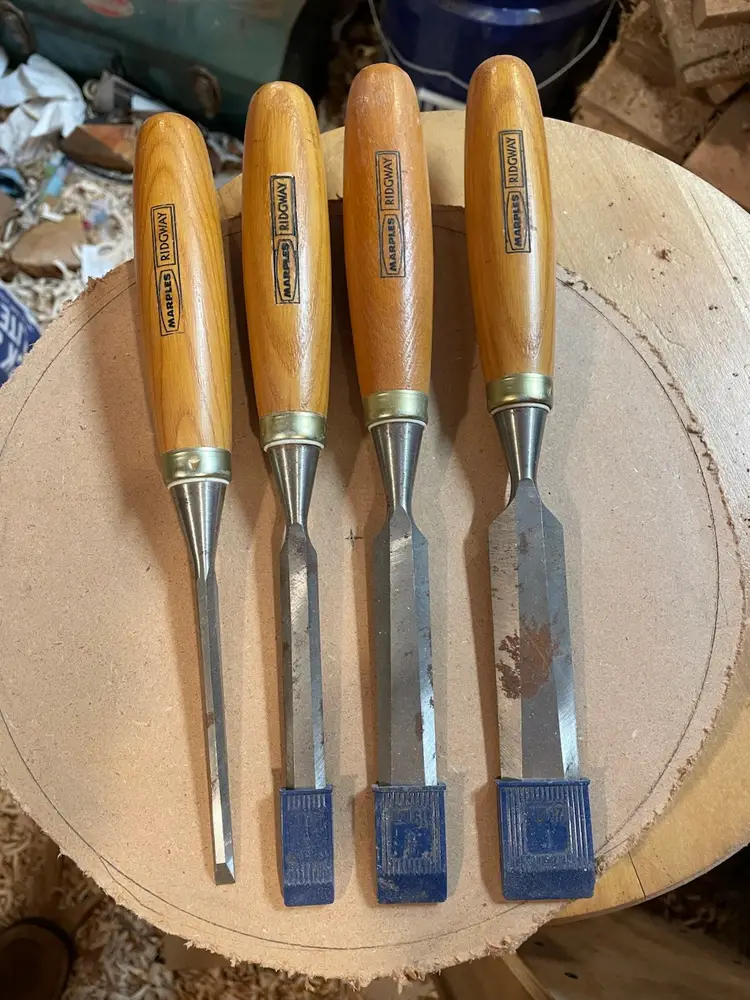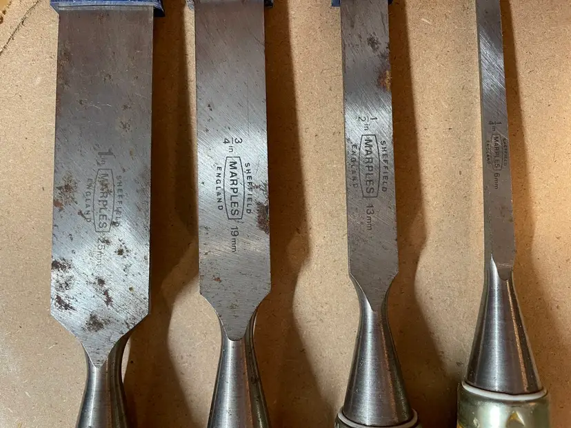 Set of 4 used Marples Ridgeway chisels made in Sheffield. These have hardly been used. They’ve been sharpened with a micro bevel but the main bevels appear to have the factory grind. There is some rust - see photos. Sheffield steel!