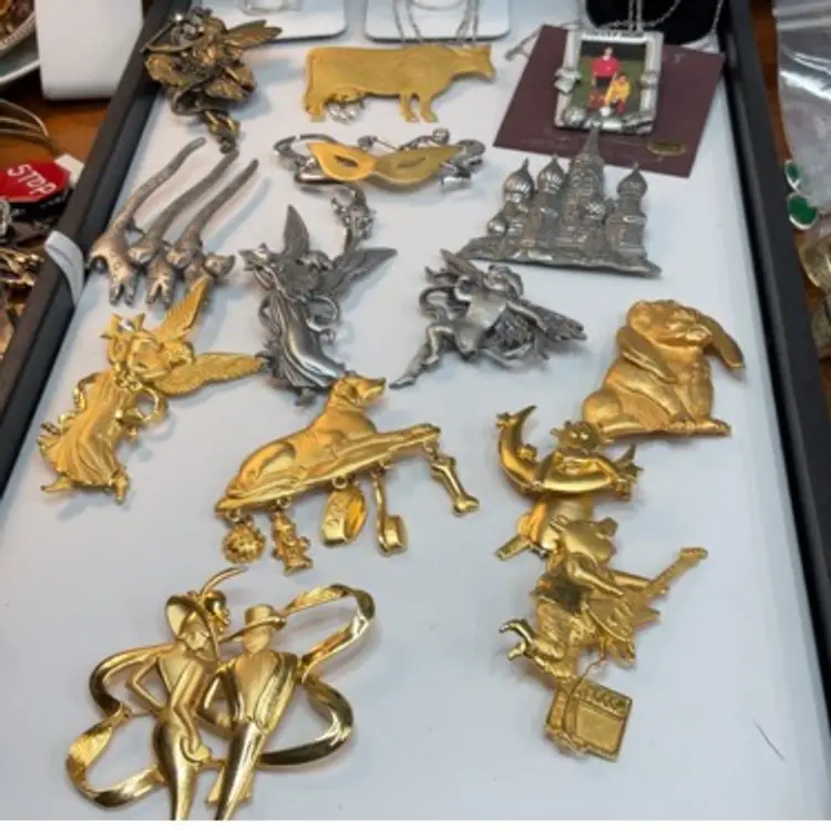 Welcome to our shop of mostly pre-owned and sometimes new jewelry treasures, trinket boxes, compacts - sometimes art and glass. Please follow us so you're in the know when we go live or add new items. Our curated beauties include a large selection of vintage pieces as well as many contemporary items. We also craft and design our own fun costume (and some fine) jewelry pieces, bookmarks, digital art and more in our small studio.