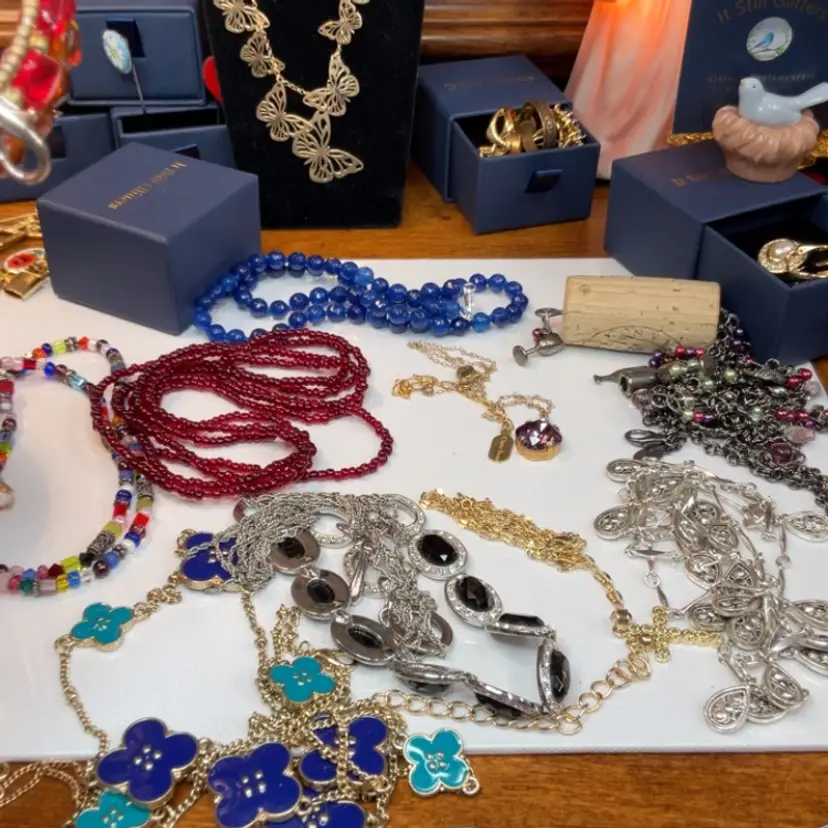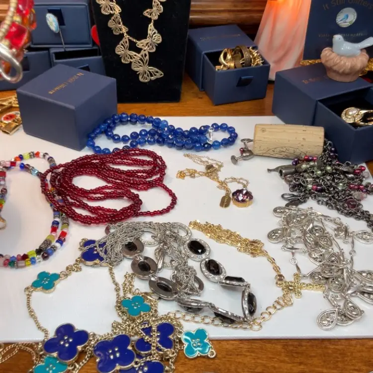 Welcome to our shop of mostly pre-owned and sometimes new jewelry treasures, trinket boxes, compacts - sometimes art and glass. Please follow us so you're in the know when we go live or add new items. Our curated beauties include a large selection of vintage pieces as well as many contemporary items. We also craft and design our own fun costume (and some fine) jewelry pieces, bookmarks, digital art and more in our small studio.