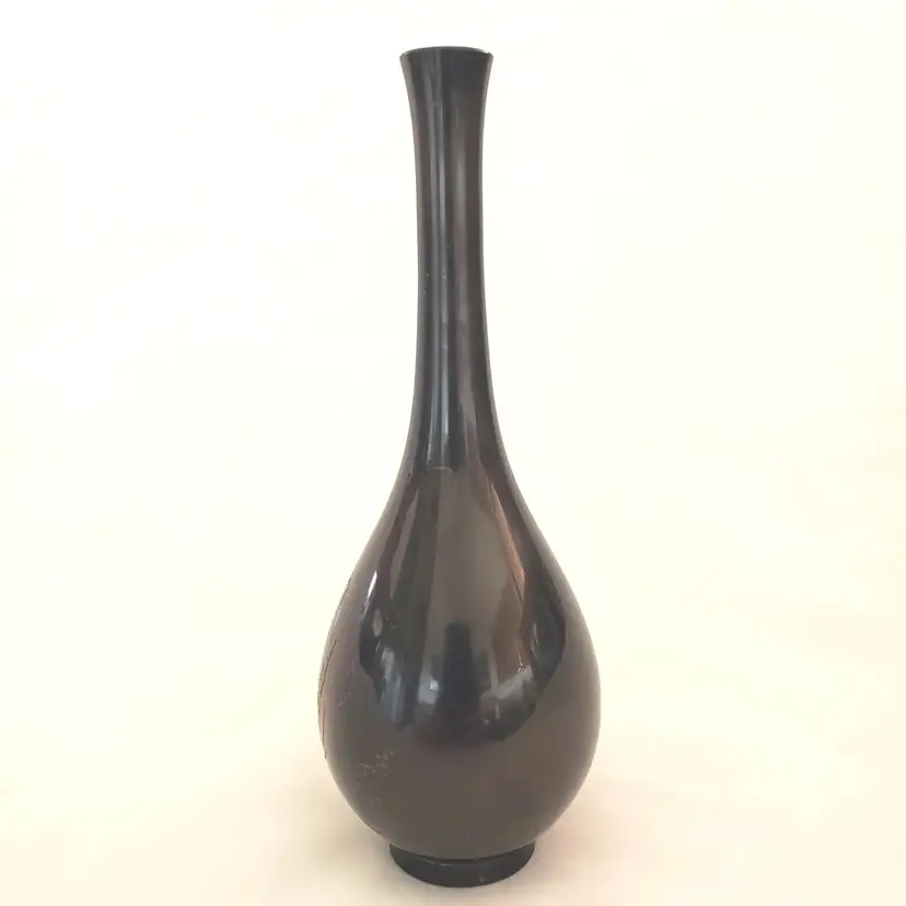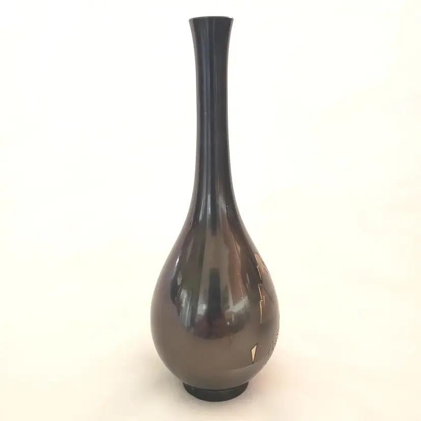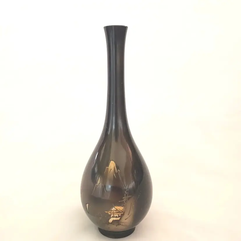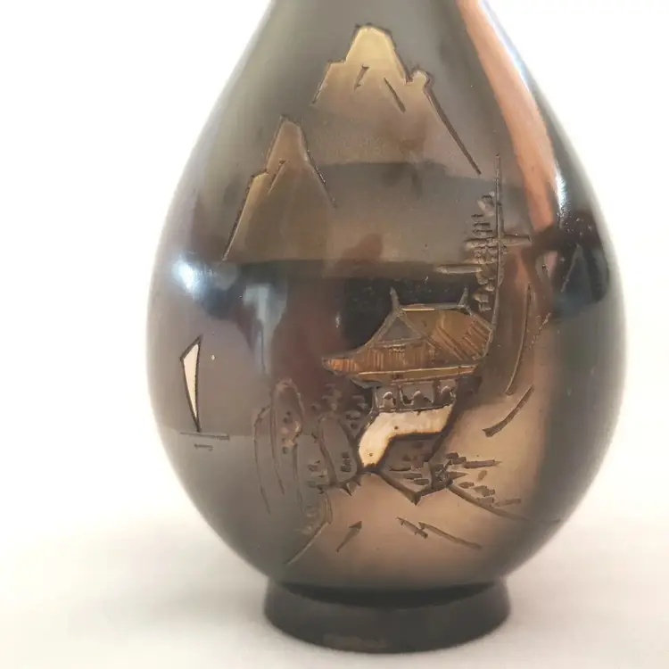 Brand: Japan Type: Vase Size: Small Signed: No Color: Multicolor Material: Metal Item Length: 6.5 in Glassmaking Technique: Etched Country/Region of Manufacture: Japan Finish: Metallic Subject: Pagoda & Mountains